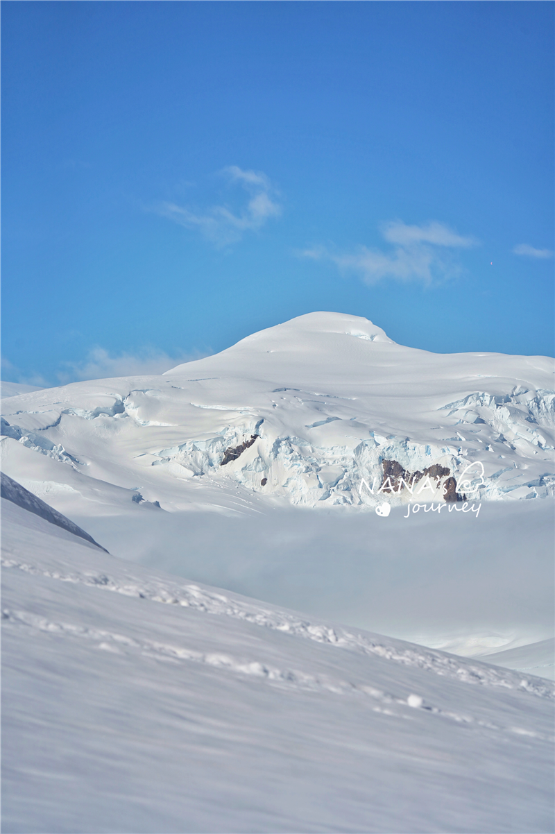比里侧的那个登高点要高,主看的是外侧海湾景色,也是纯白世界的美,也有南极旗帜合影哦。不过这里略高,走起来有点难,大家量力而行。