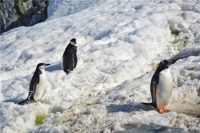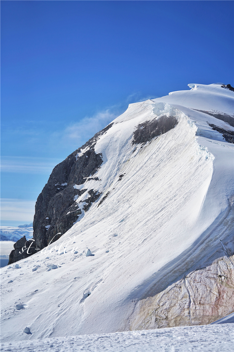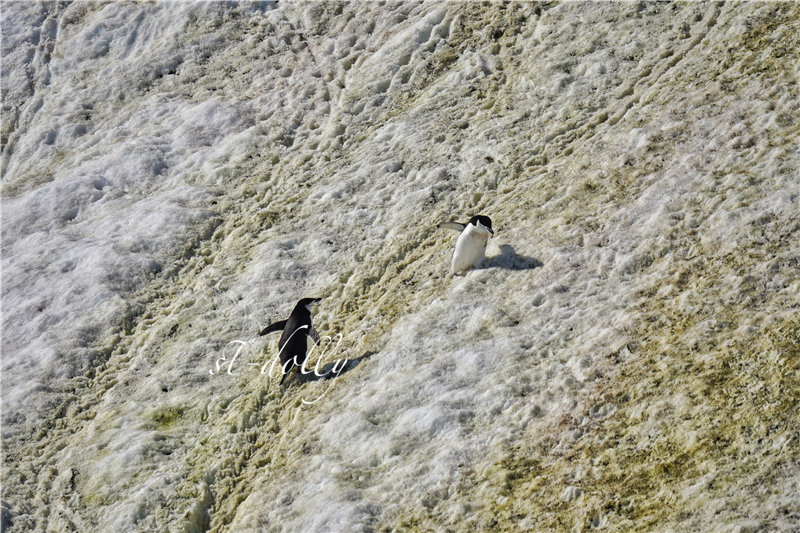 踏着艰难的步伐,我们开始了曲折的上山之路,真的是又曲又折,Z字形的路线才能更快的上山,也是这天,我们体会到了南极的夏天。冰雪的松软,踩起来非常无力,走一步滑半步,其实不止我们如此,路过的带帽企鹅也一样哦,他们走走滑滑摔一跤继续走,还要四处观望发个小呆,一起爬山真的乐趣无穷啊。