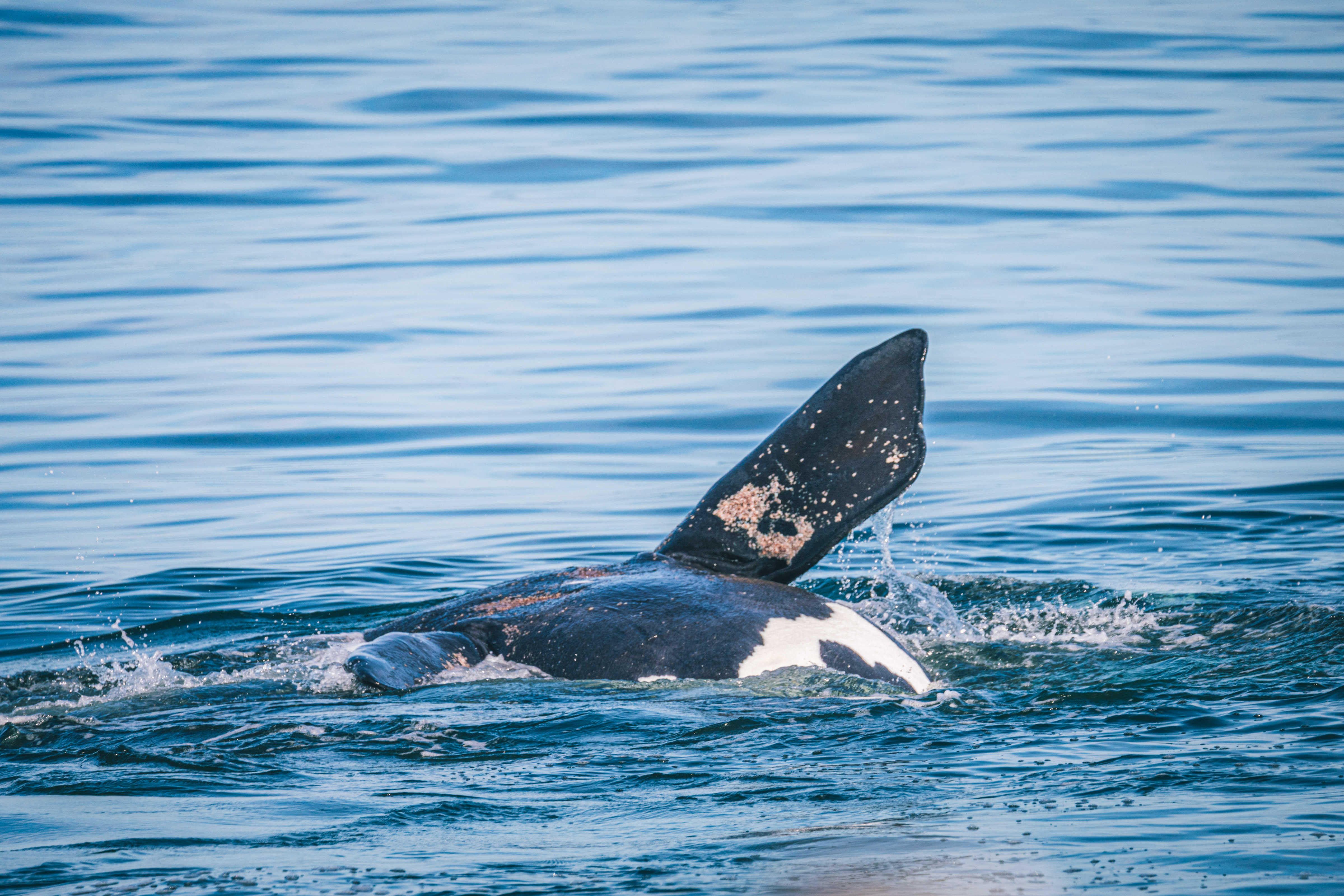 南露脊鲸性格温驯,喜欢沿海岸线巡游,甚至会在距离陆地仅数米的地方出现。南露脊鲸没有背鳍,头部有独特的白色标记,由鲸虱和藤壶组成的白色老茧,易于辨认。