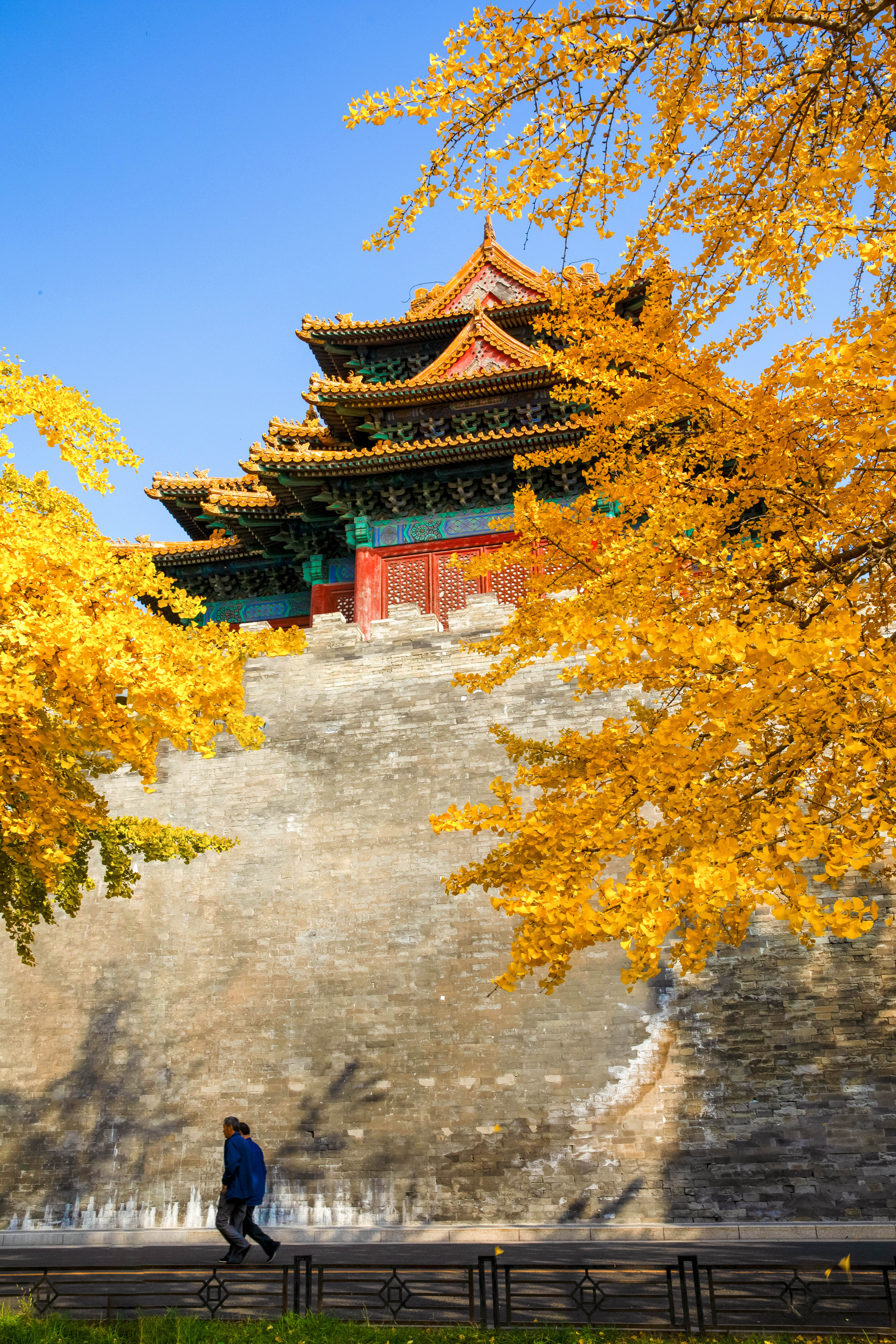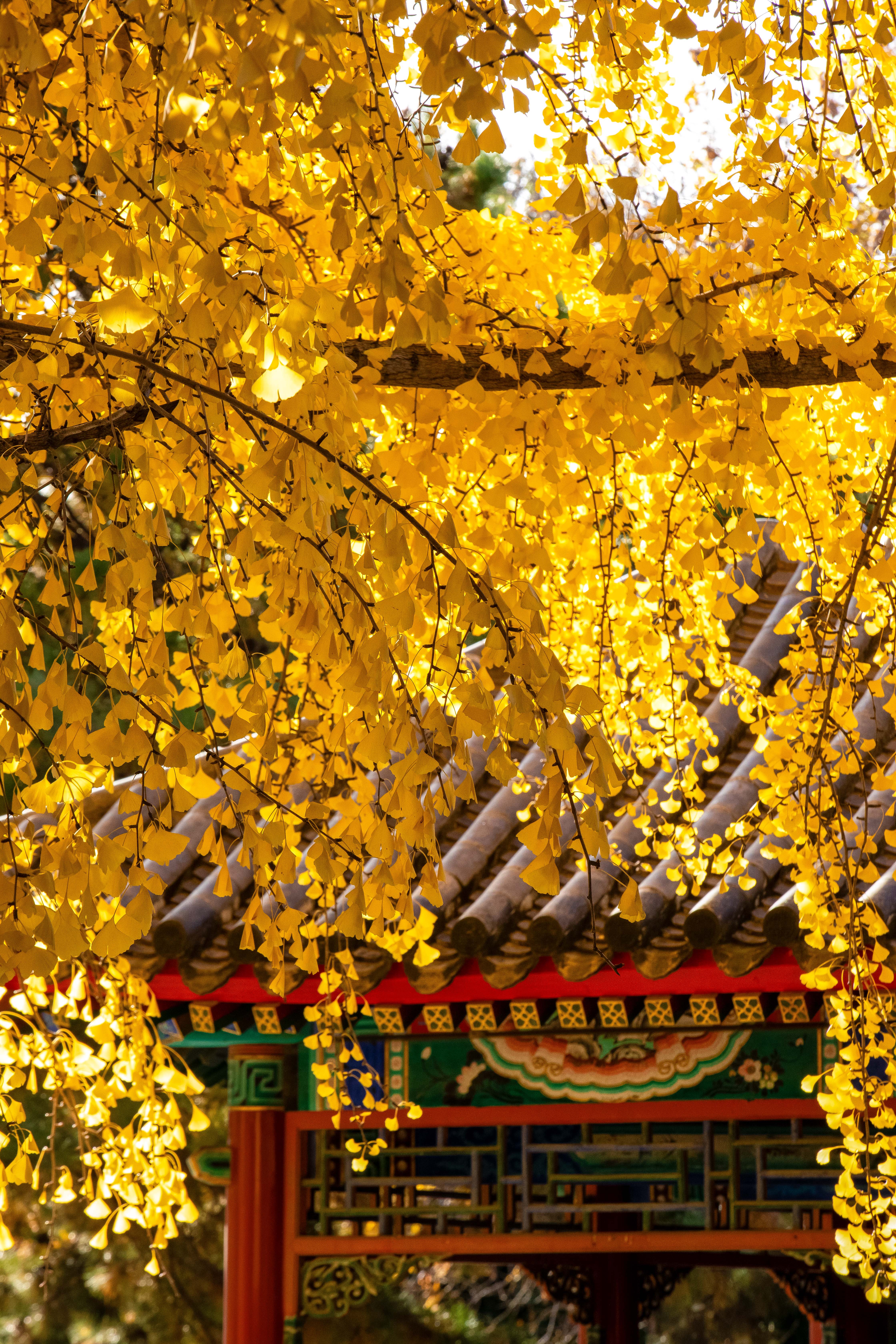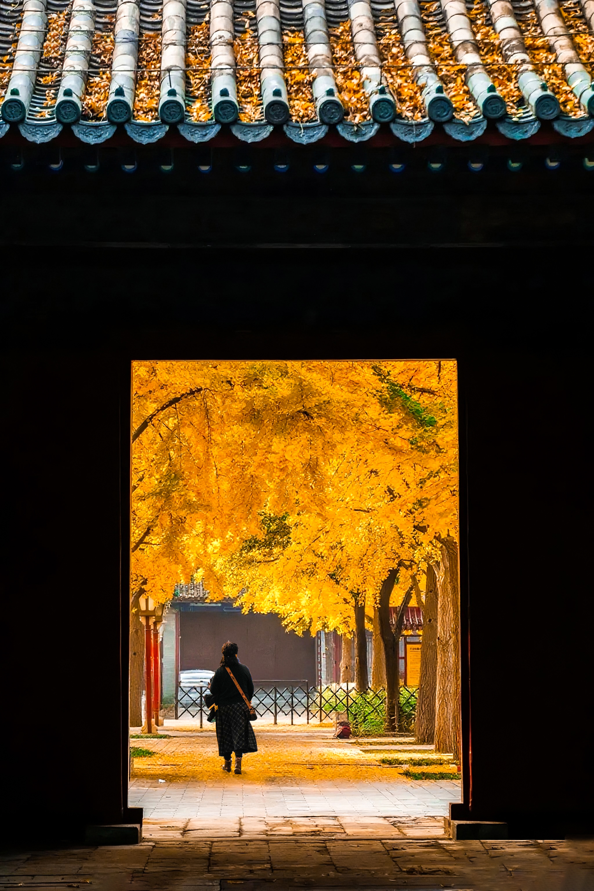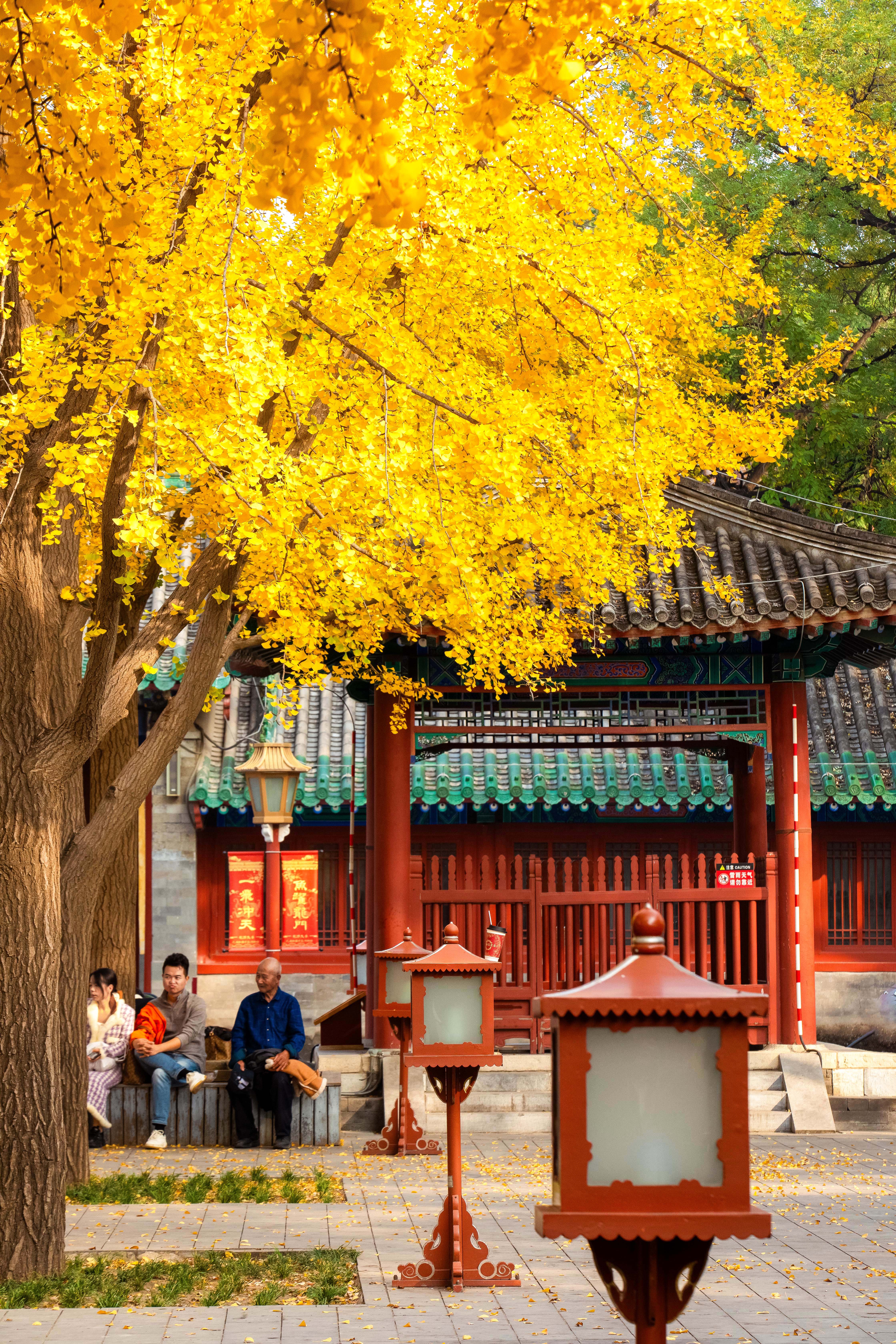 秋风宛如一位灵动的使者,在深秋季节将翠绿的银杏变得金黄,银杏叶如同金色的蝴蝶随着秋风摇曳,它吹进紫禁城的每一处角落,在故宫的延禧宫里,让这座冷门的宫殿充满焕发生机;吹进地坛让这座史铁生最爱都市中的安静公园变得人满为患;还有那古老的法源寺门口的银杏,简直如同一场盛大的金色瀑布;