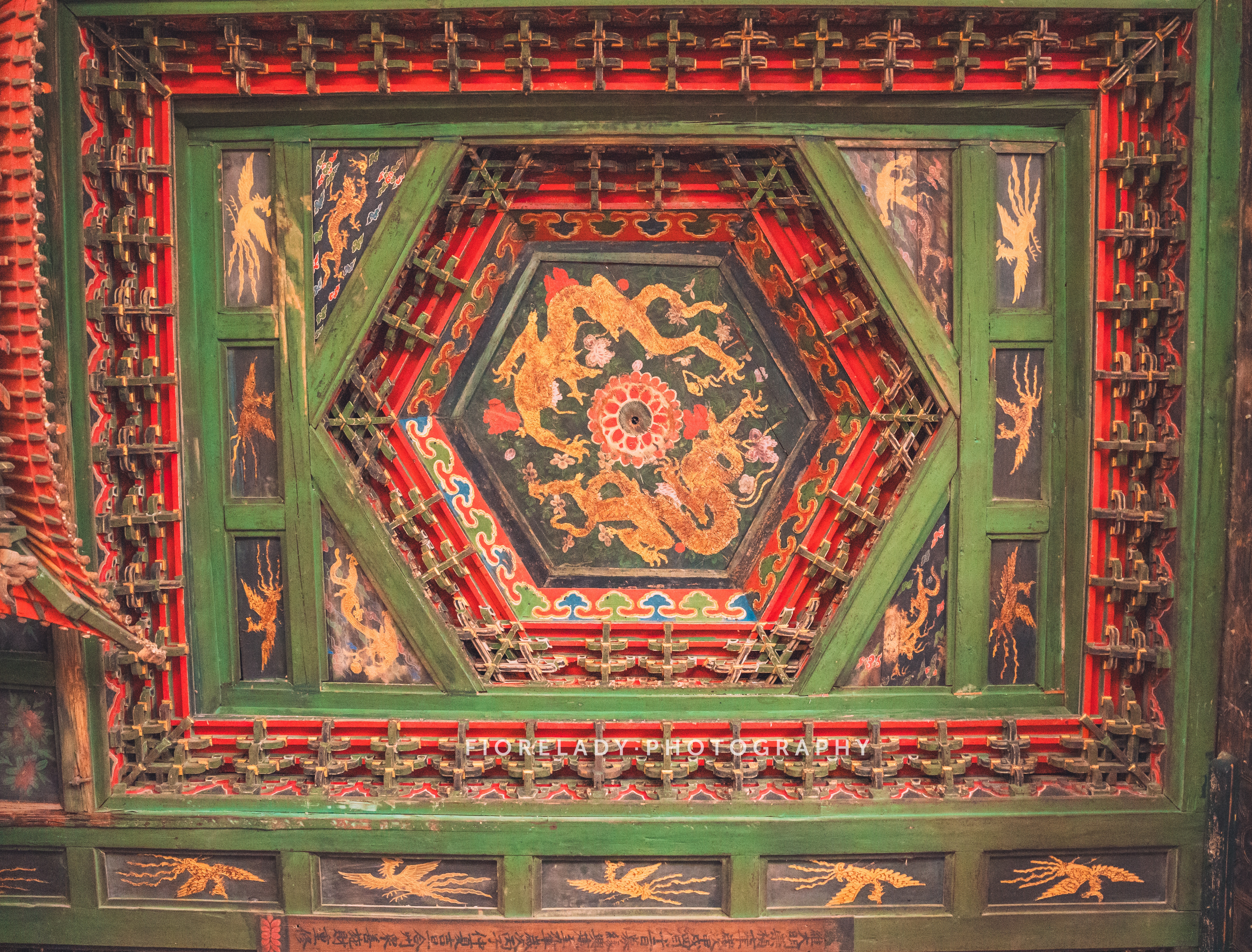 其余八眼藻井与中心藻井结构相似,虽没有天宫楼阁,但藻并四周皆有祥龙围绕彩凤飞舞,色泽华丽,构造精美,彰显皇家寺庙的气派。