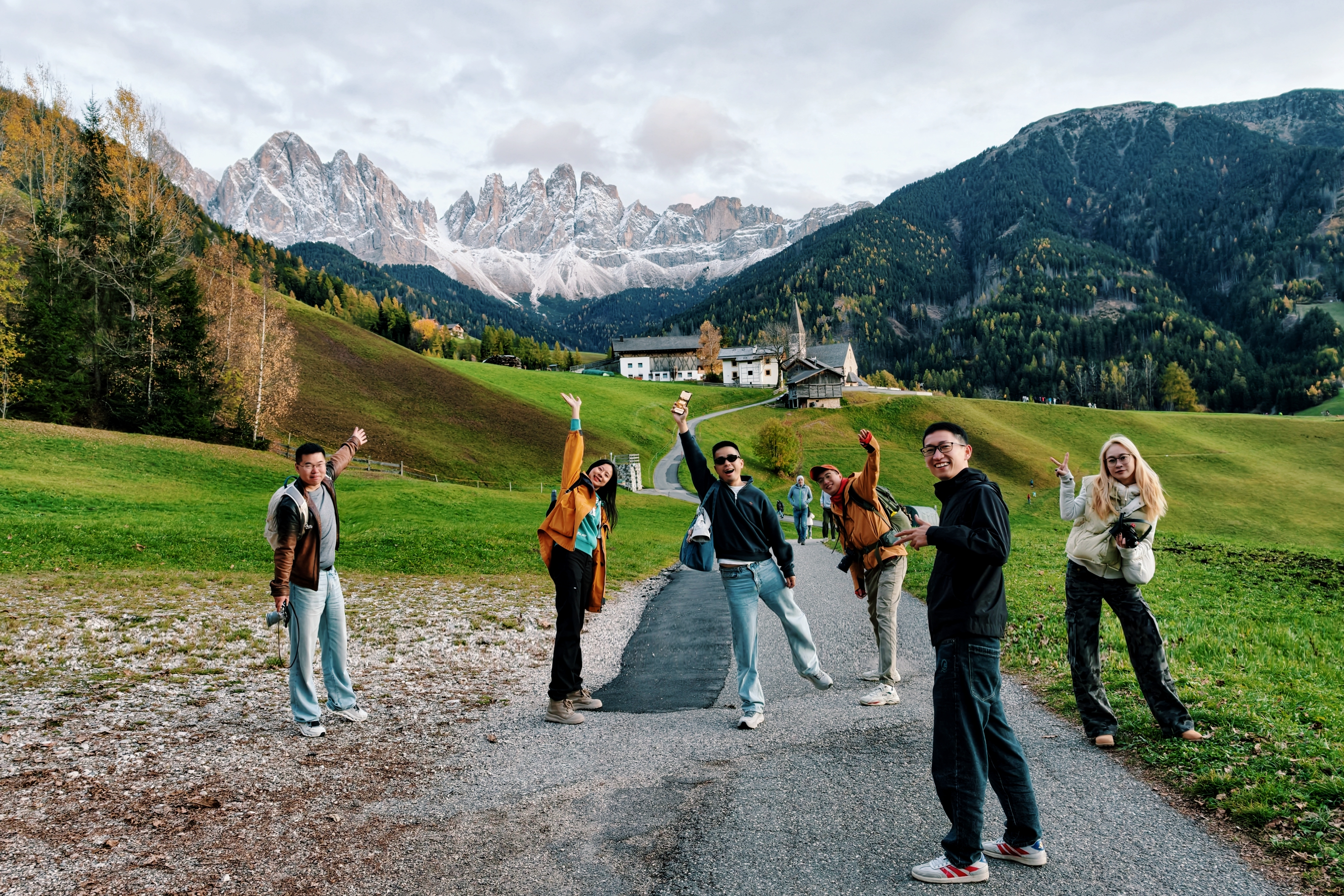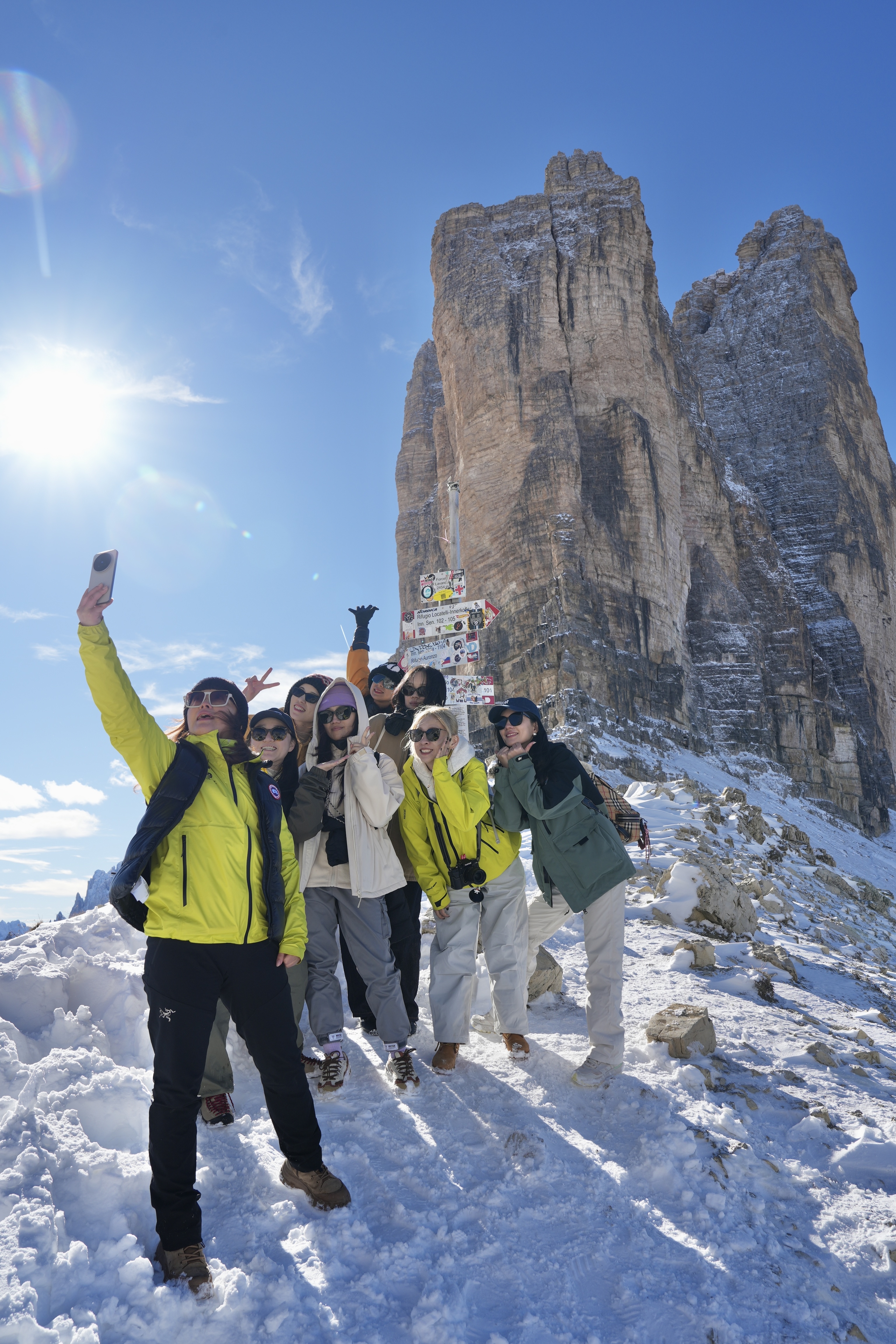 这趟旅程的画卷,从孤独教堂与富内斯山谷的日落铺展开来。余晖为教堂镀上暖金,山谷的风裹挟着牛羊的清脆铃铛,我们并肩静立,看霞光漫过天际;秋日的刀锋山与休斯山,高山草甸染成斑斓色块,脚下的路铺满松软草叶,欢声笑语随山风回荡。三峰山的 12 公里徒步堪称惊喜,雪景与秋景在途中交替呈现,踩着薄雪穿过林间,抬头便是层林尽染的绚烂,大家相互搀扶、登顶时的击掌欢呼,成了这段路程最珍贵的注脚。威尼斯的日夜同样难忘,City Walk 里撞见日落熔金映运河,晨曦中邂逅薄雾轻笼的石板路,在小桥流水间定格默契瞬间。佛罗伦萨的时光浸着艺术气息,圣母百花大教堂的穹顶恢弘夺目,学院美术馆里的雕塑震撼人心,乌菲兹美术馆的画作耐人寻味,在艺术熏陶中分享感悟。再到皮恩扎晨雾里的日出、锡耶纳中世纪的古街,雨天米兰的哥特风情与购物欢愉,每一处风景都因同行的你们,多了份无可替代的温暖。