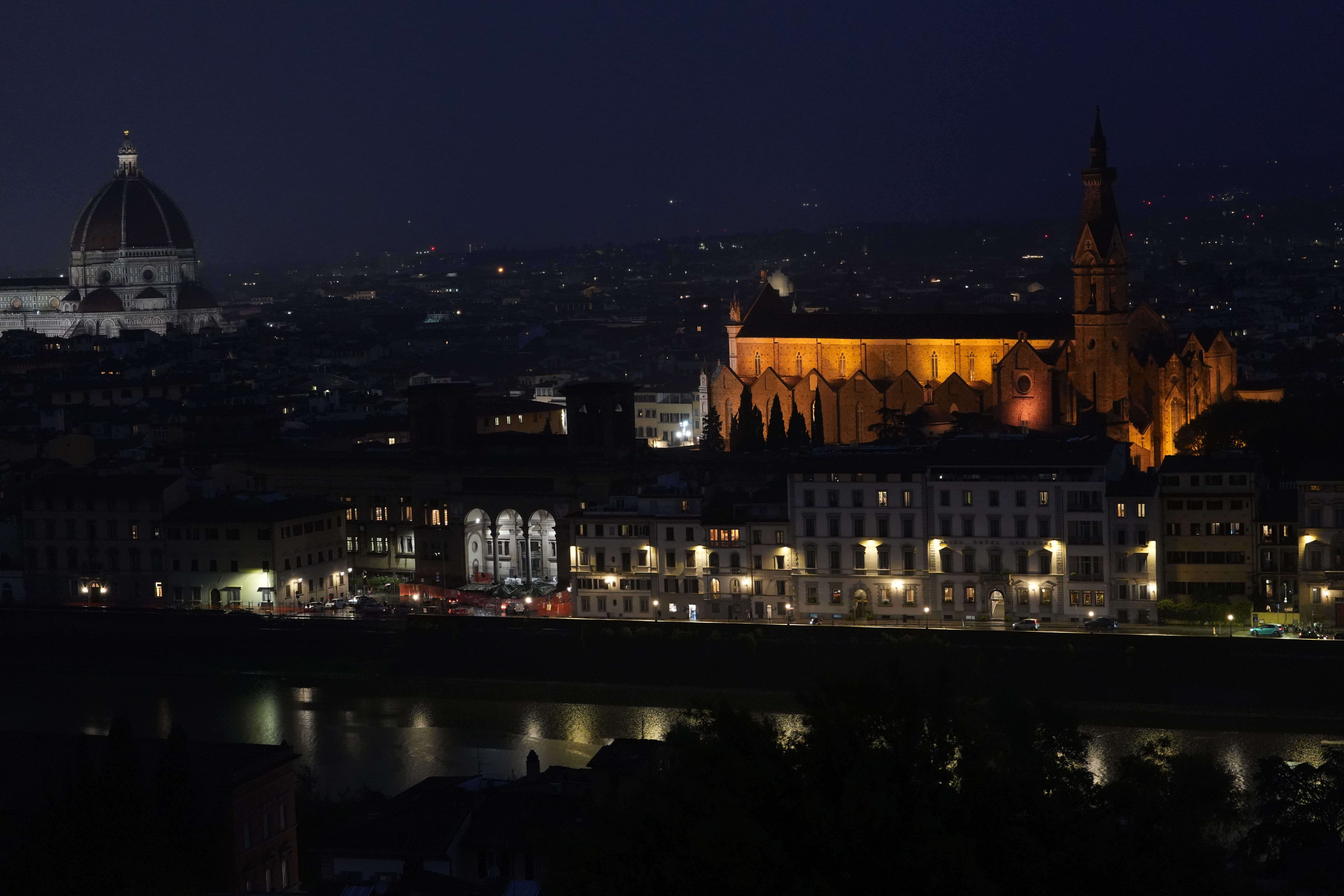 傍晚奔赴米开朗基罗广场,待夜幕降临,佛罗伦萨的灯光次第亮起。整座城市在夜色中铺展,教堂穹顶与古建筑的轮廓被灯光勾勒,远处群山朦胧,晚风轻拂,眼前的夜景璀璨又温柔。尽管整日行程紧凑,但若不是精准规划时间,便不会错过这蓝调水城与暮光古城的双重惊艳,疲惫也在美景中烟消云散。