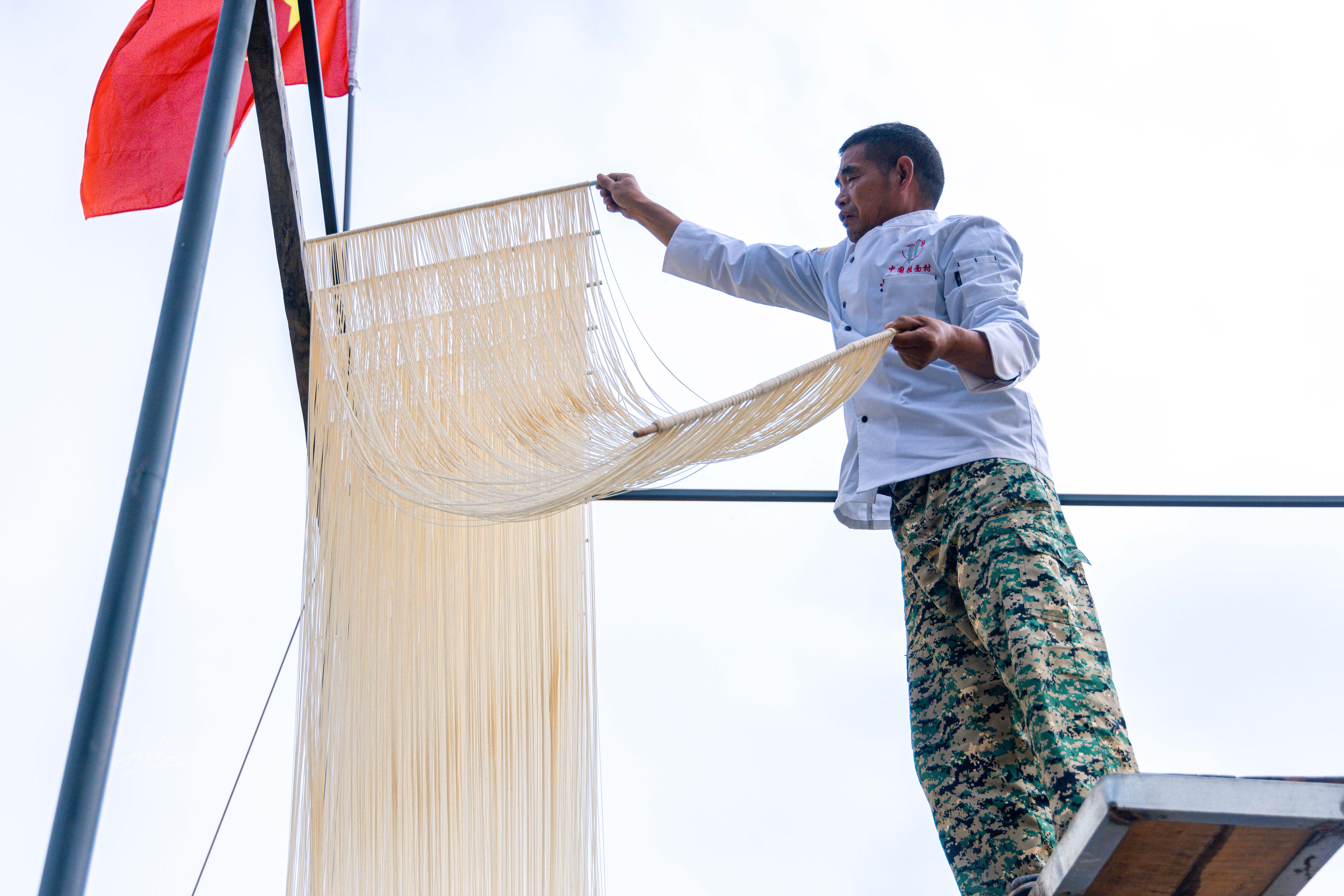 老师傅熟练的将挂面挑起,抻开,铺满...这种认真的状态在镜头之中也非常的生动形象。