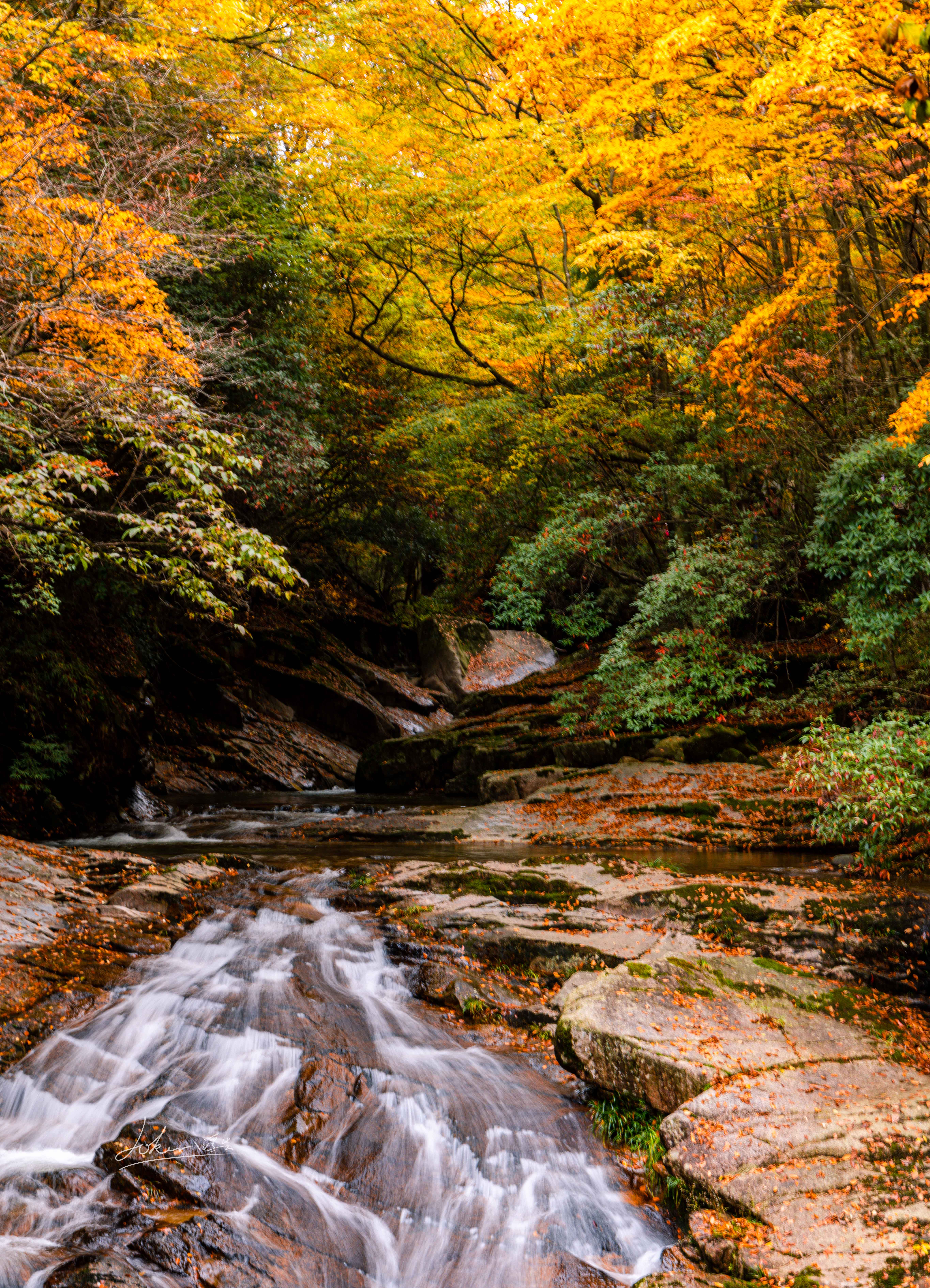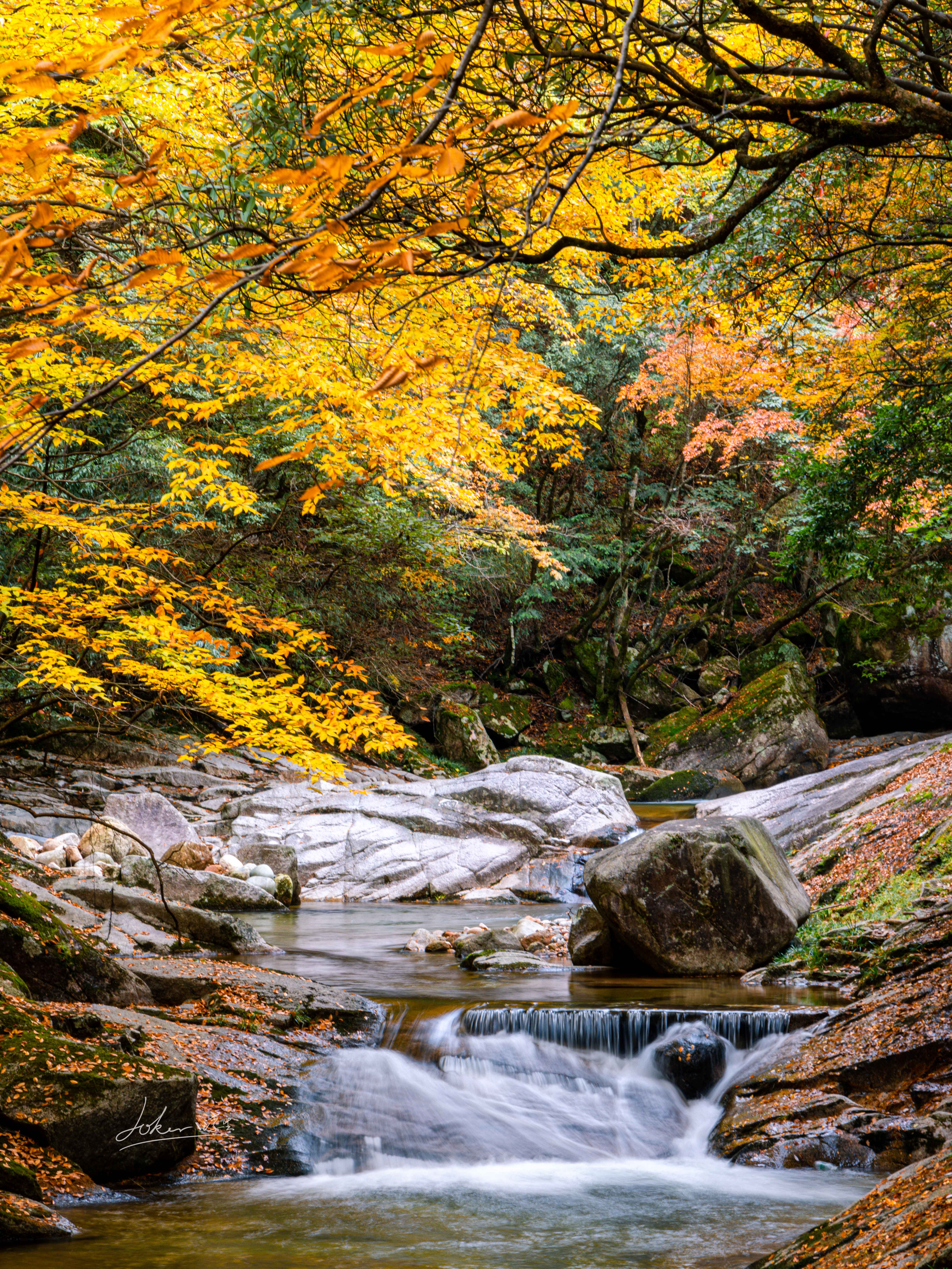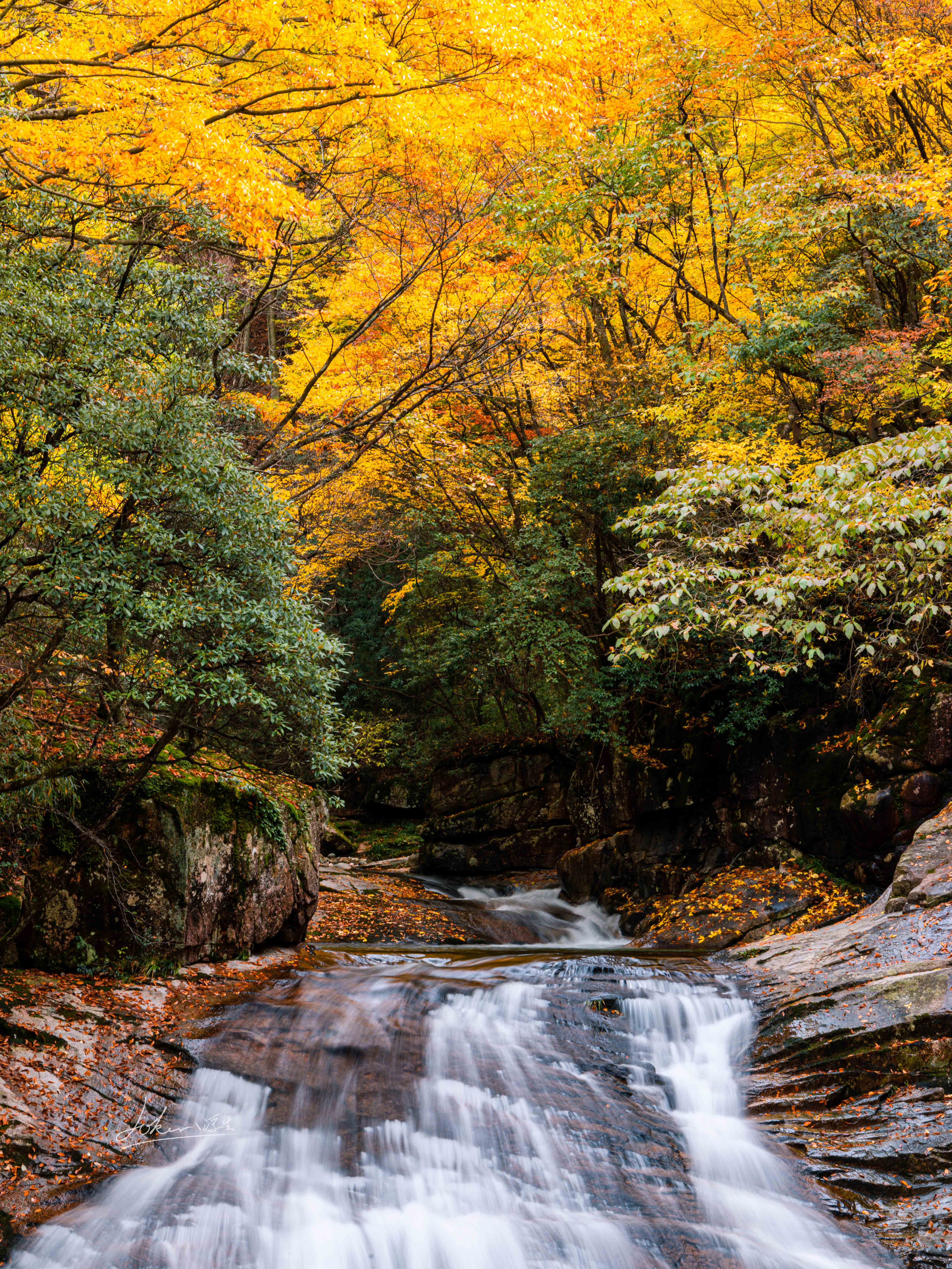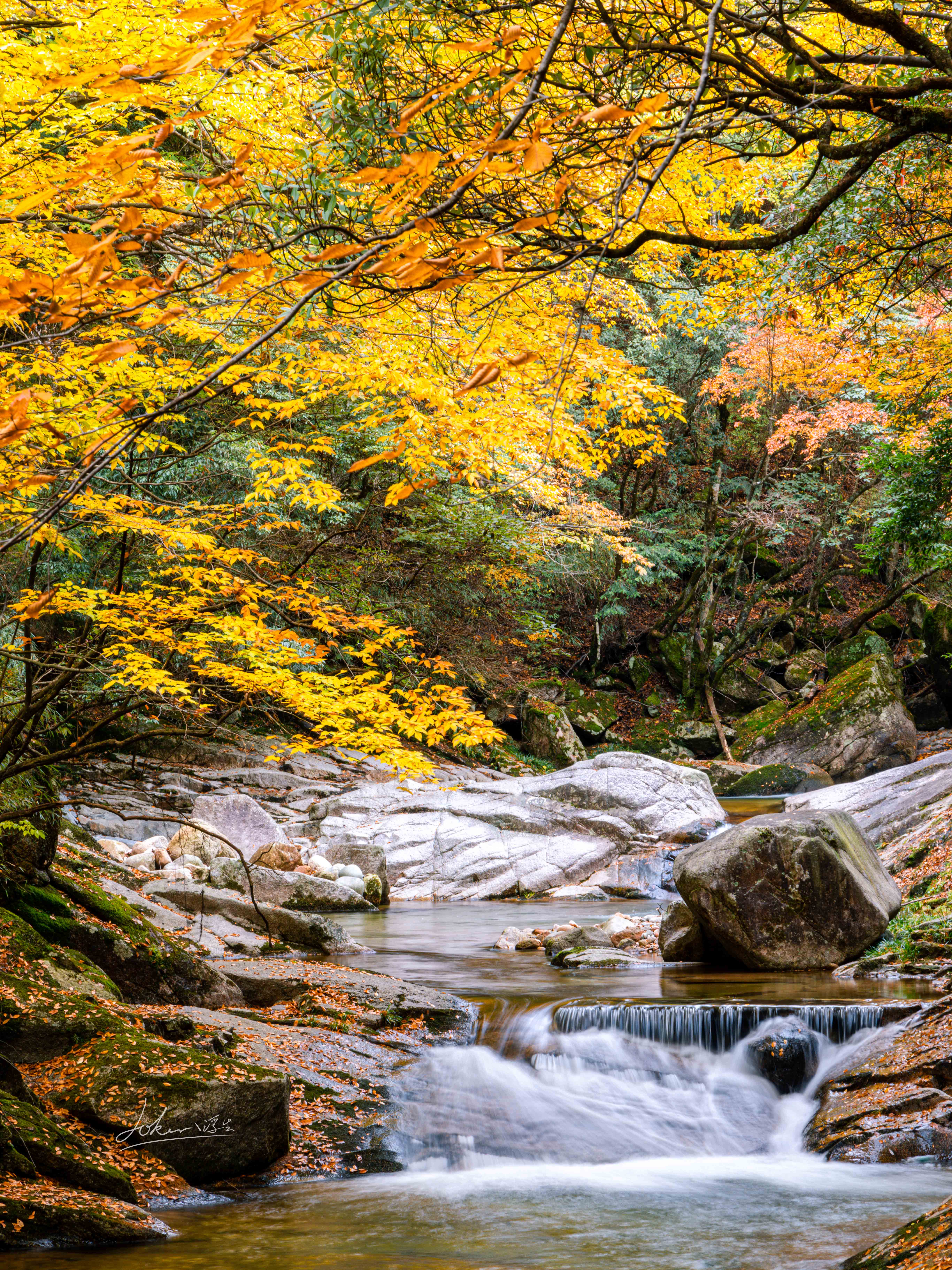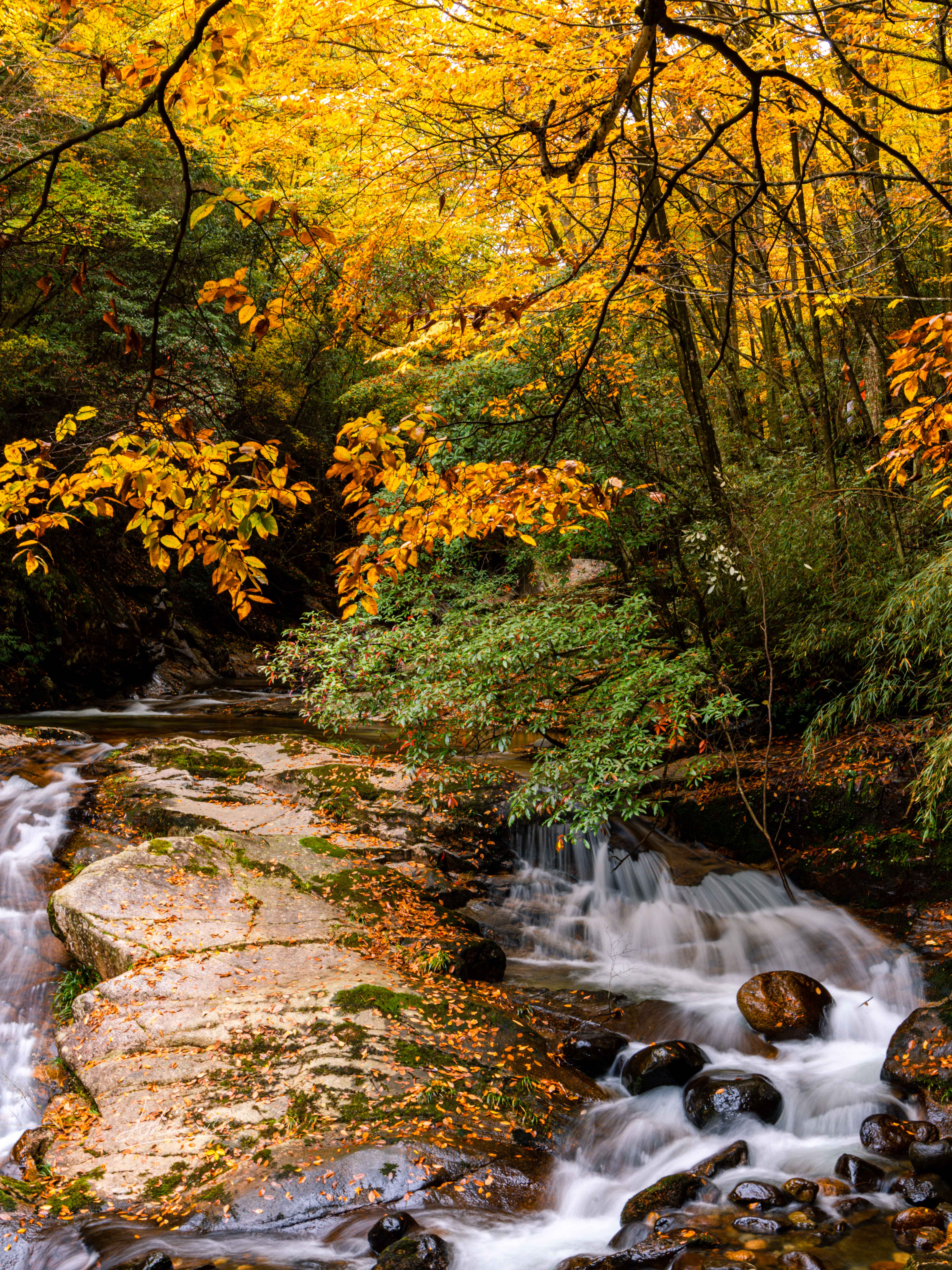 我们一路向下游览,一些叶子已经黄透随风在慢慢落下,这种感觉也十分美妙,步行至中间,叶子黄的正当时,下到水潭边,可以拍到自己想要的美照,太阳光时有时无,光照强时叶子尽显色彩,光线弱时,甚至不需要减光镜,都可以拍出水流如丝的感觉。