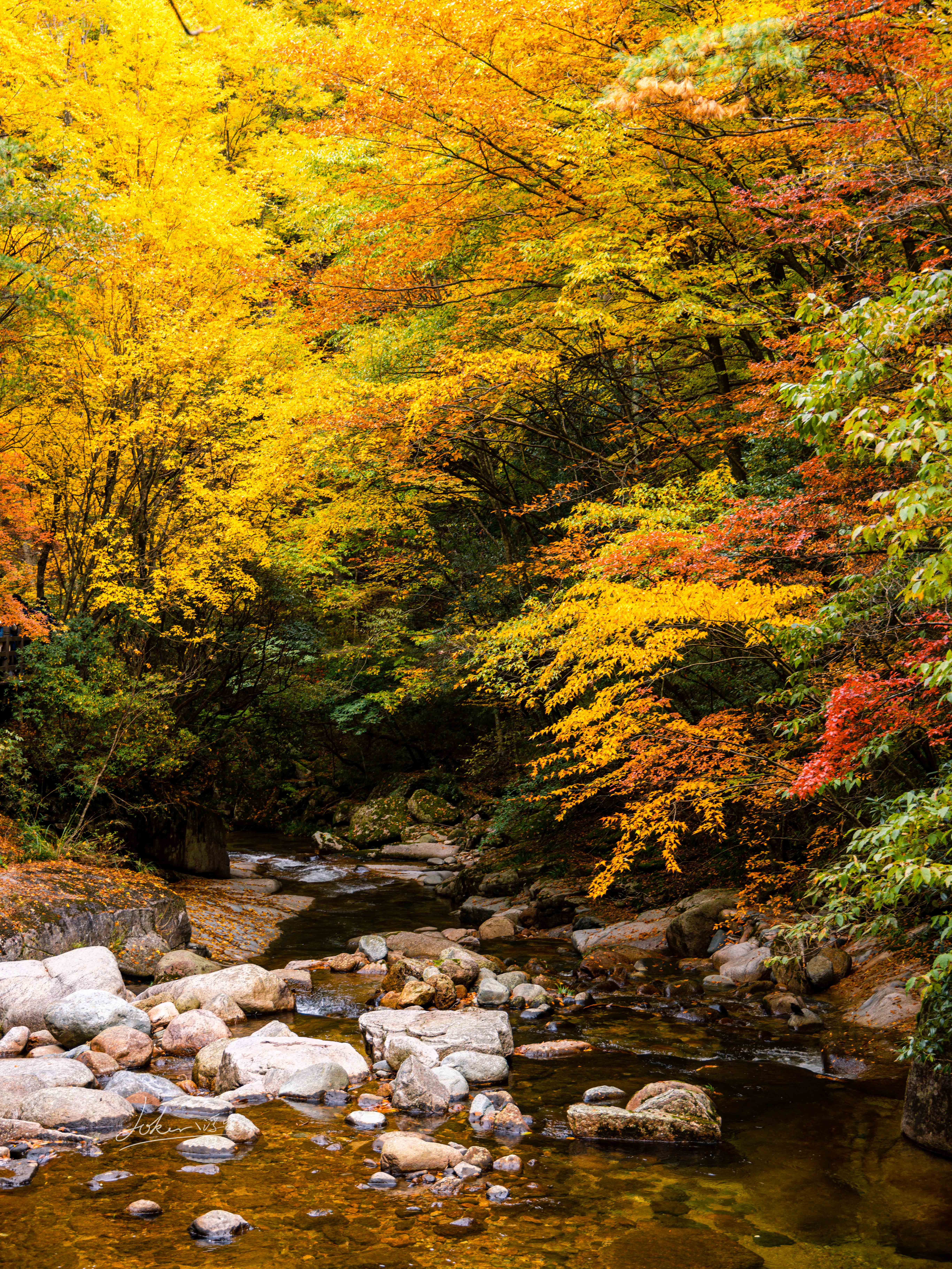 关于水景,阳光反射时最是拍摄的好时候,行走在山涧的瀑布、潭水间,犹如在画中游,所有的美都是大自然的精心雕琢,没有一丝人为创作,不过大家要注意,在沟内行走,要小心石块上的湿滑。