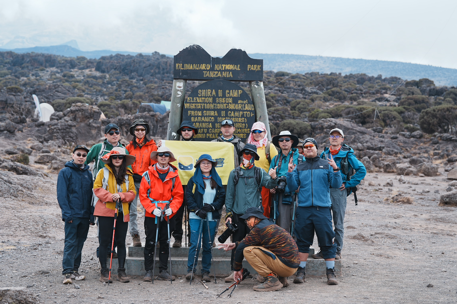 从阿鲁沙乘车约2.5小时来到登山起点兰道罗斯大门,我们在这与这次坦桑尼亚的服务人员会合,按照1比4的比例,16人的登山团队配备的服务人员共计64人,负责7天6夜绝大部分生活物质的搬迁。在长满高草、石南和火山岩的大草原,我们陆陆续续穿过几座草木茂密、连绵起伏的山丘和几条小溪,最终到达了Shira山脊,然后沿着山坡缓缓地下行来到希拉1号营地。在这里,我们第一次在高原上观赏到基博山峰。