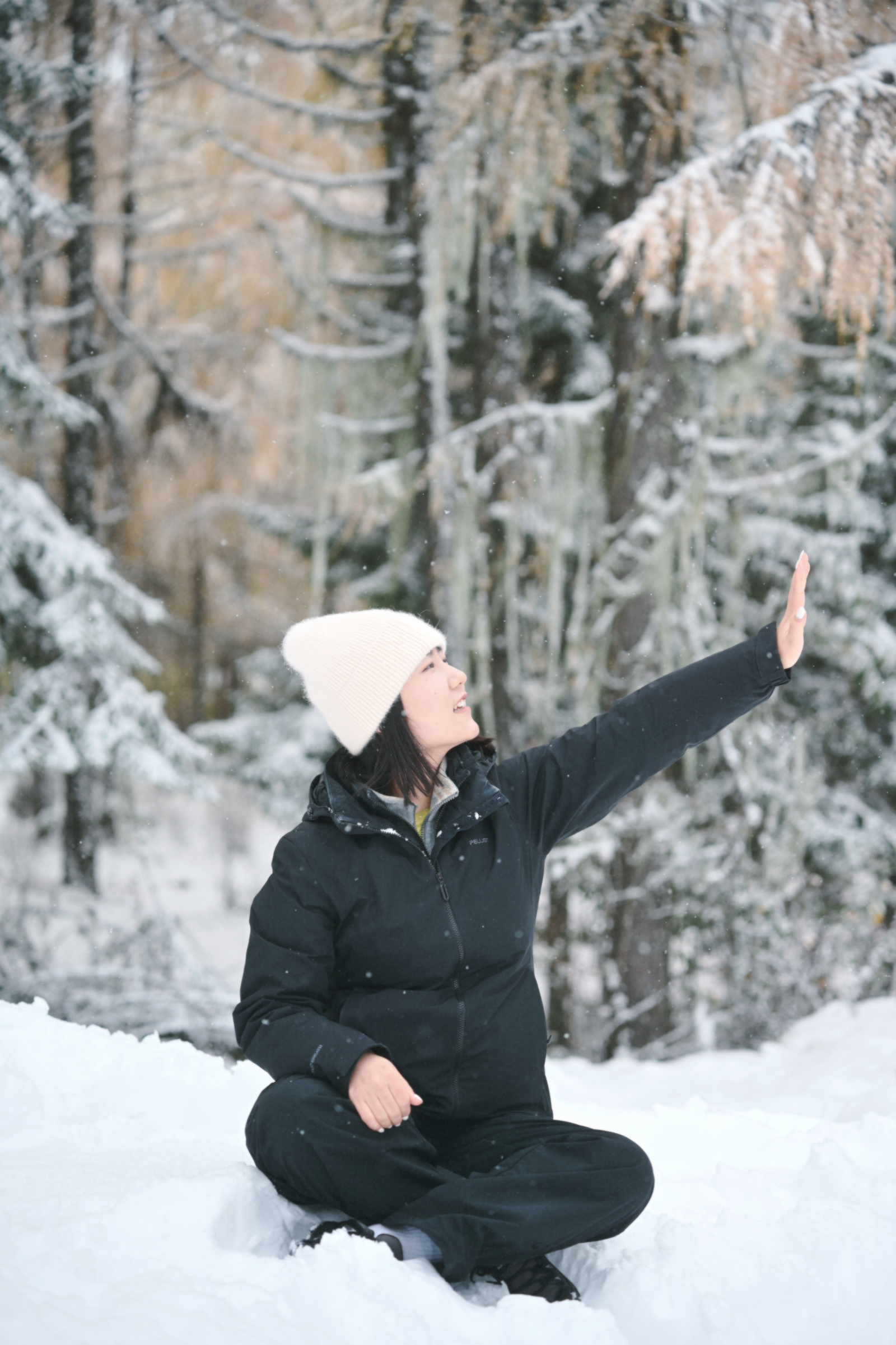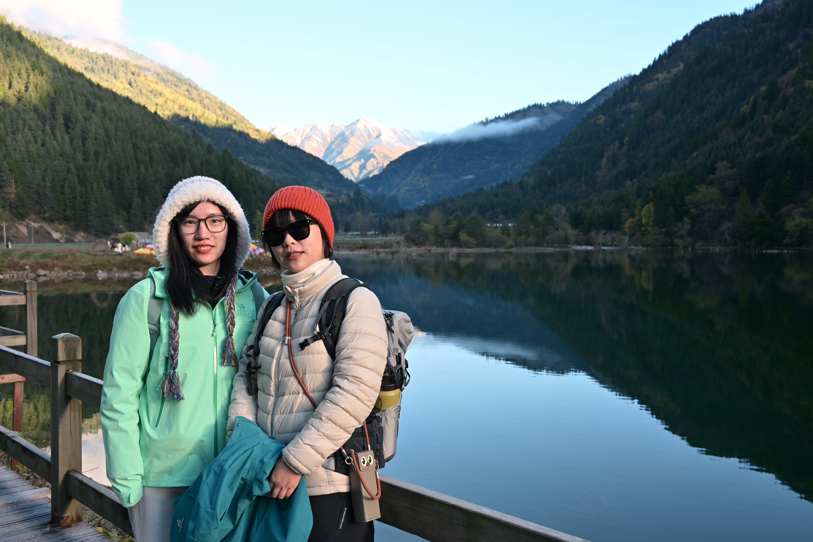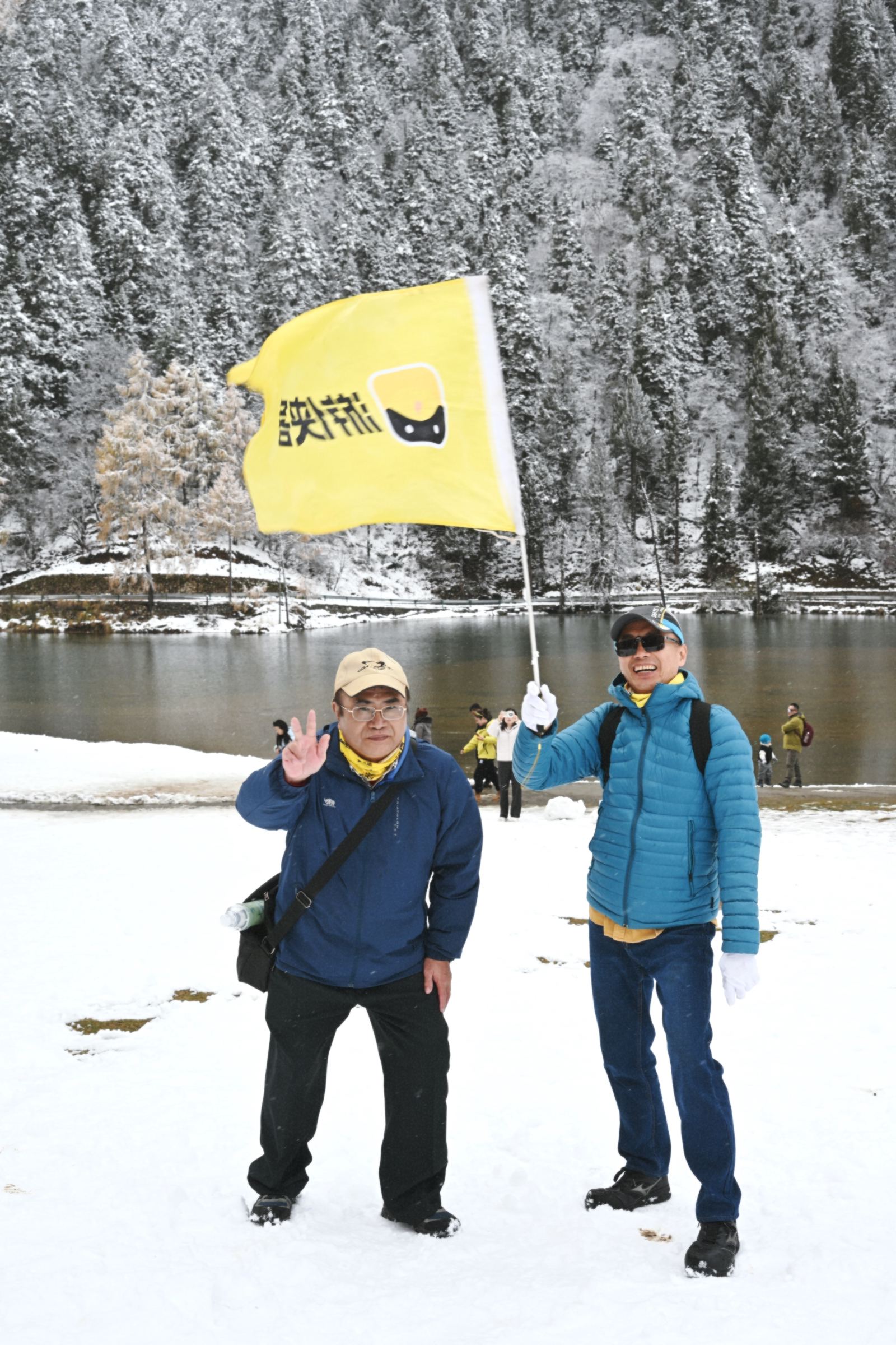而当毕棚沟的面纱真正揭开时,所有的不适都被抛诸脑后。秋日的神性在此展现得淋漓尽致:头顶是湛蓝的天和洁白的雪峰,山腰是墨绿的冷杉,而山下,是燃烧般的彩林——金黄、赭石、火红,交织成一幅巨大的油画。磐羊湖如一块碧玉镶嵌其中,倒映着雪山彩林,美得不真实。我们沿着栈道漫步,每一步都像走在画里。而且我们运气特别好,到了磐羊湖,发现山上在下雪~秋色雪景一网打尽
