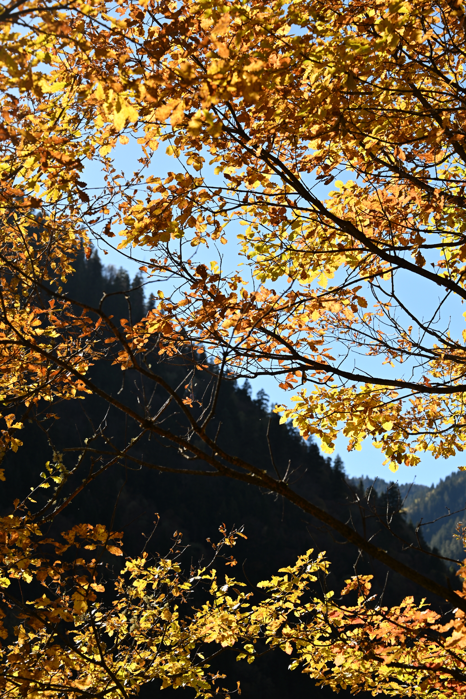 今天是“色彩专属日”。前往奶子沟的沿途,我们才真正理解了“八十里彩林画廊”的含义。这不再是一个具体的景点,而是一段绵延不绝的梦幻之路。山谷两岸,五彩斑斓的树林如锦缎般铺展开来,阳光透过云隙洒下,光影斑驳,每一秒都在变幻着色彩。我们忍不住多次请求停车,只想把这极致秋色深深地刻在脑海里。