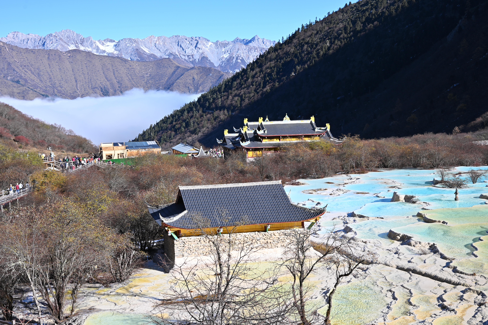 今天是对体力的一个小考验。黄龙以规模宏大的钙化池群闻名于世。乘坐缆车上行,再沿着栈道徒步而下,沿途的彩池、雪山、森林、峡谷令人应接不暇。最精华的五彩池,在阳光下闪烁着蓝绿、鹅黄、乳白等多种颜色,宛如仙人洒落的调色盘,无愧“人间瑶池”的美誉。