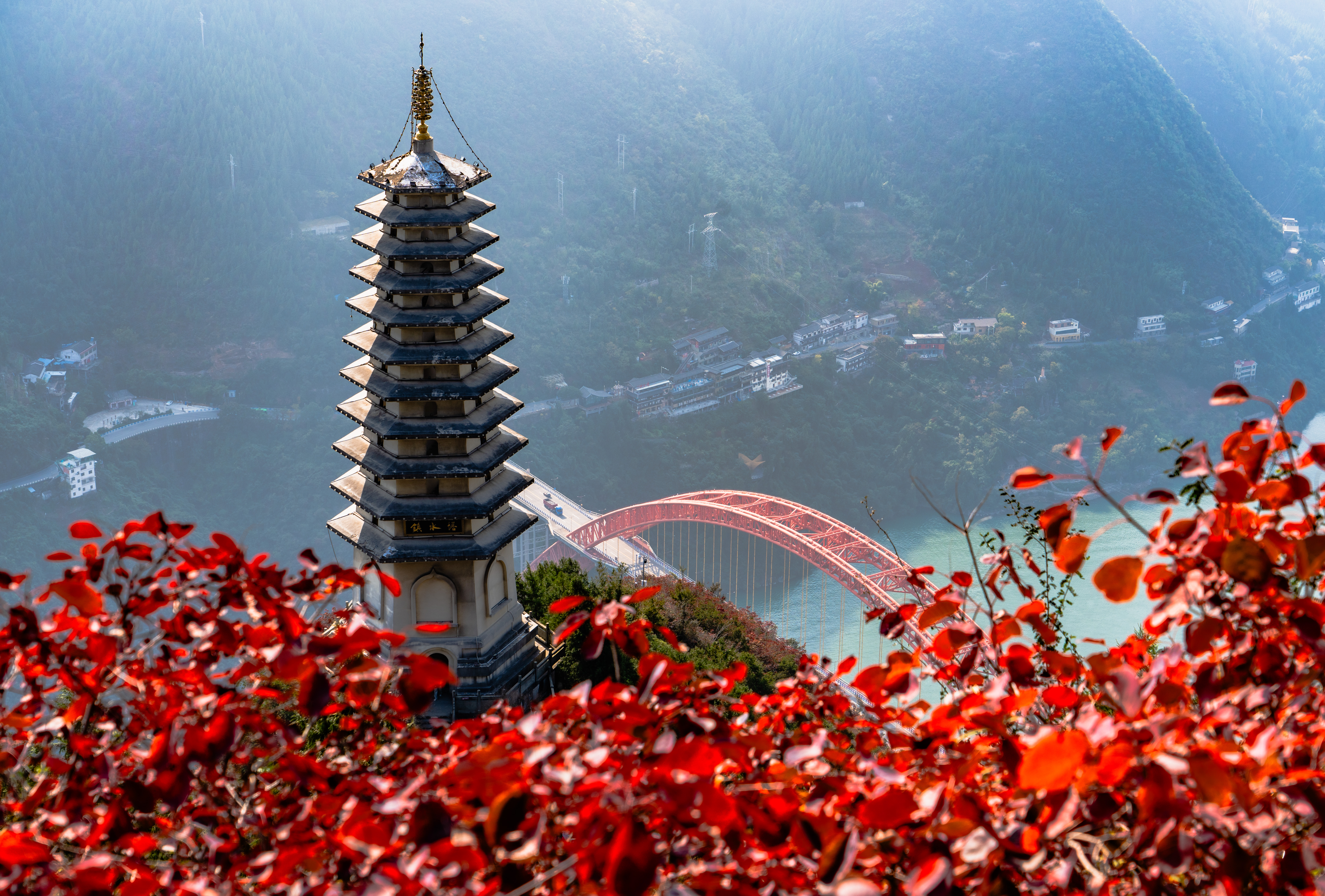 长江如青罗带,蜿蜒穿过漫山赭红与金黄,