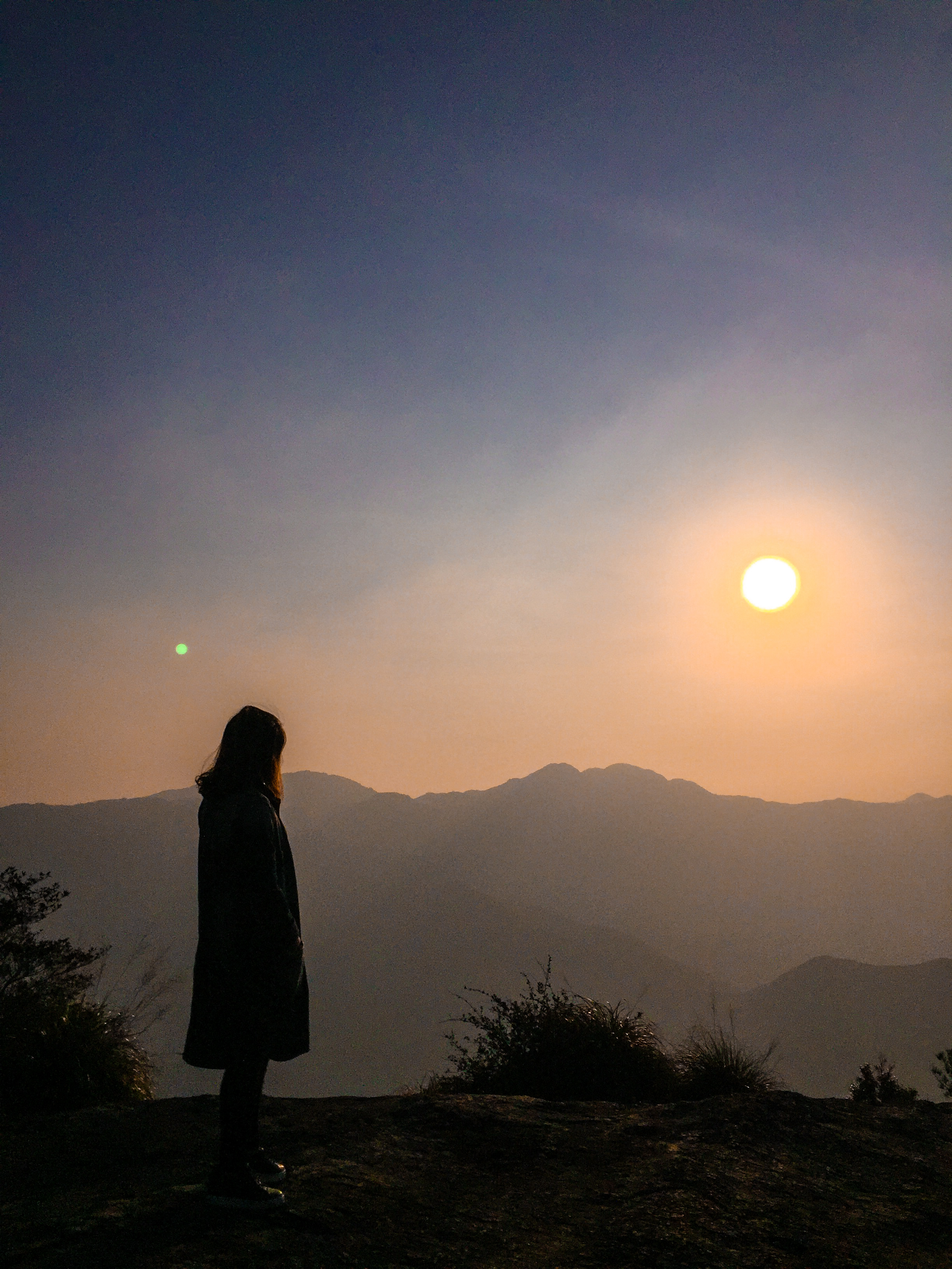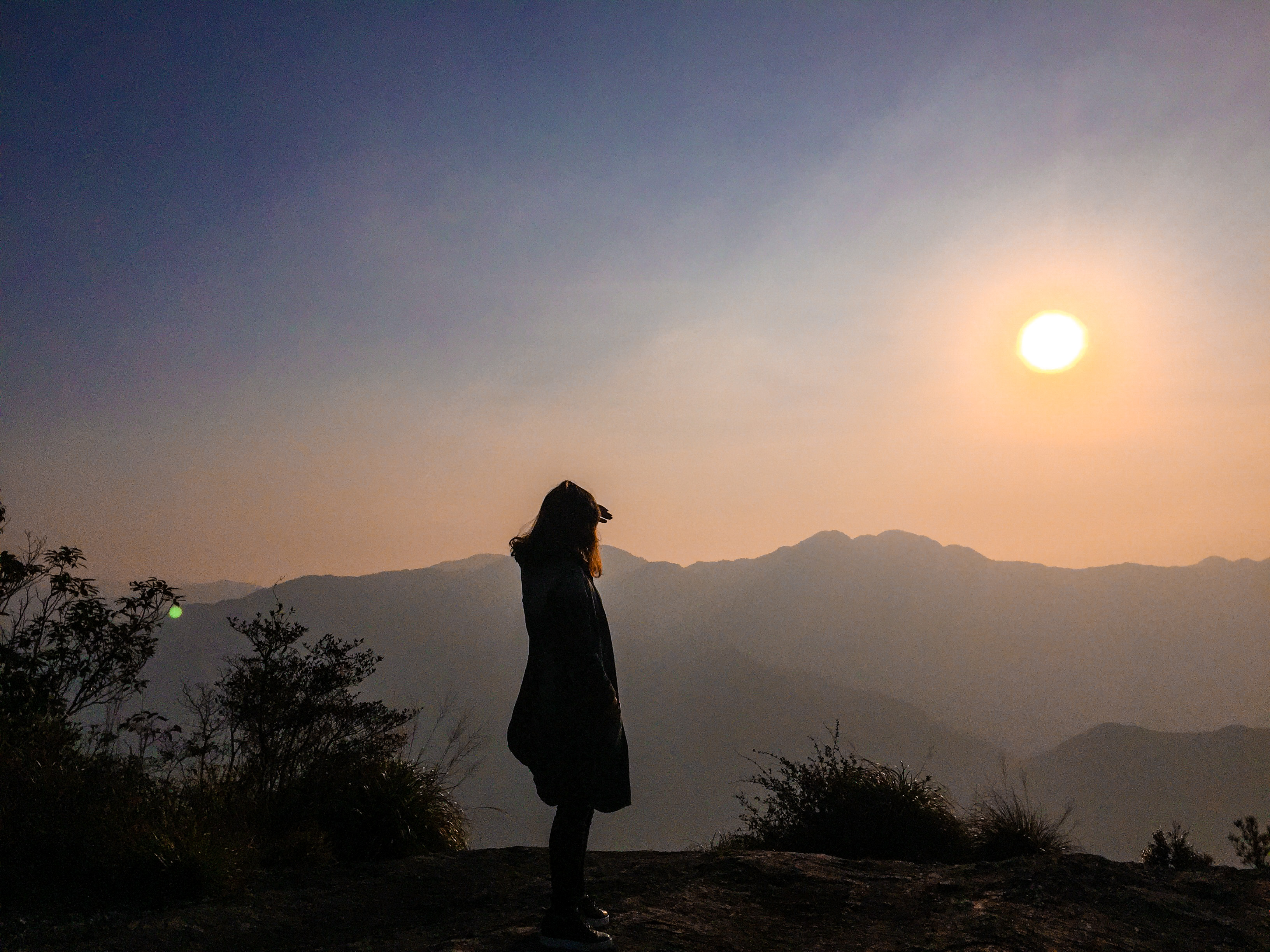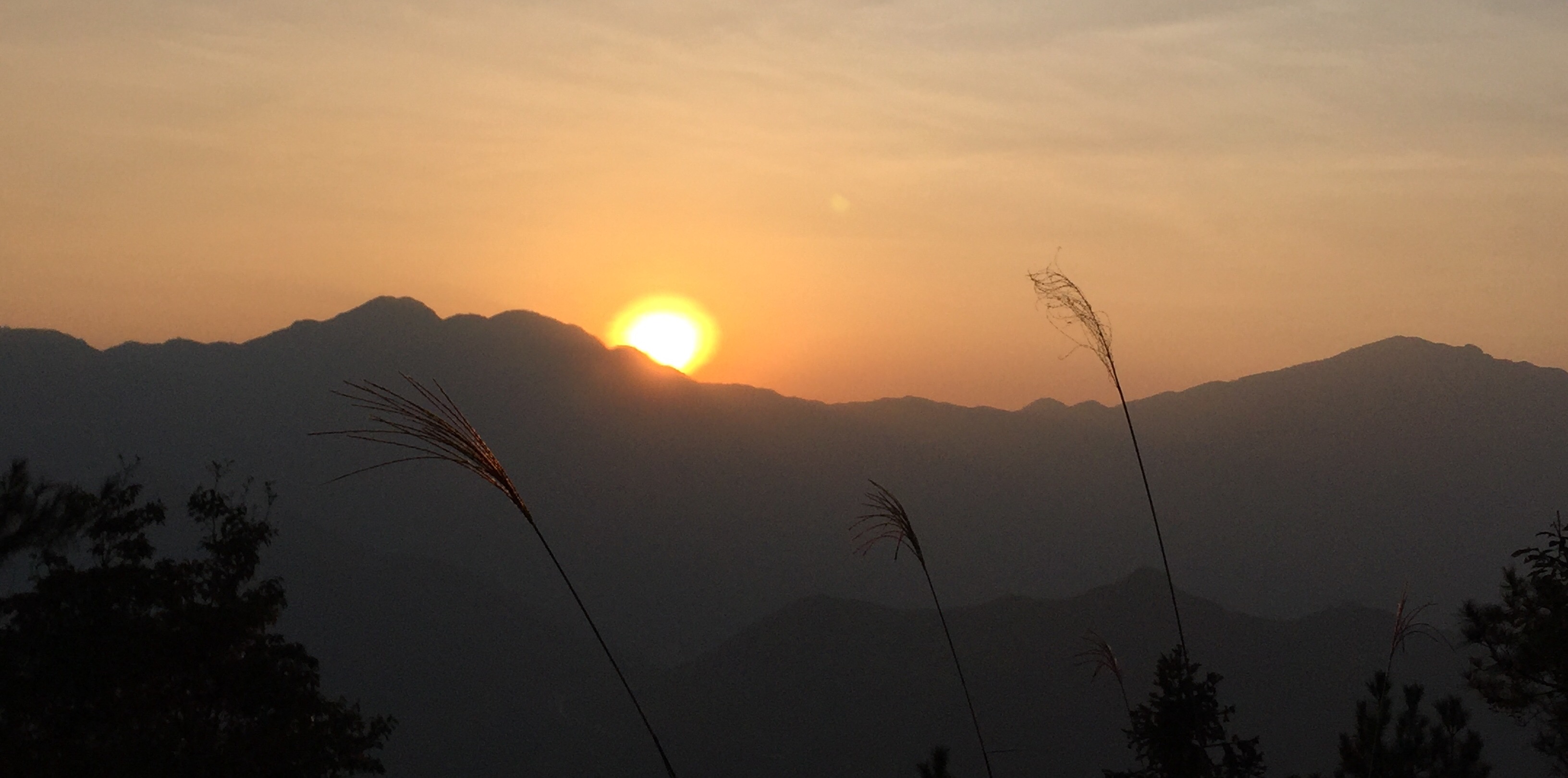 一个多小时后到达山顶,我们站在没有保护措施的方岩背岩石上,望着已经东升的太阳。山脉连绵,四周雾气未散,朦胧中的阳光,暖暖地让人心安。