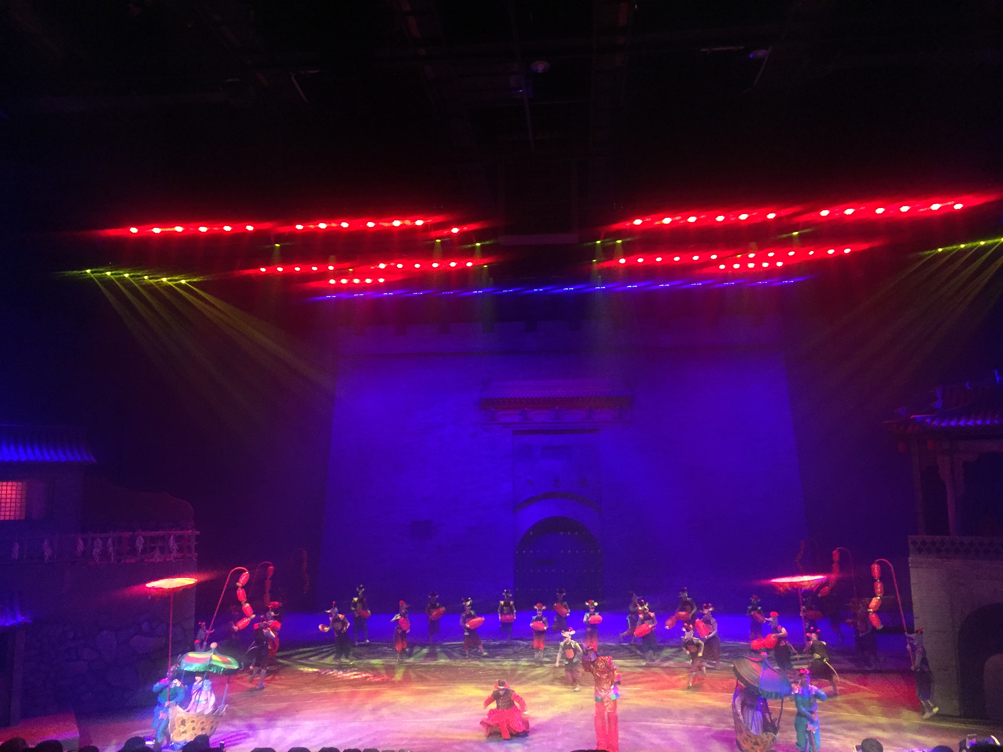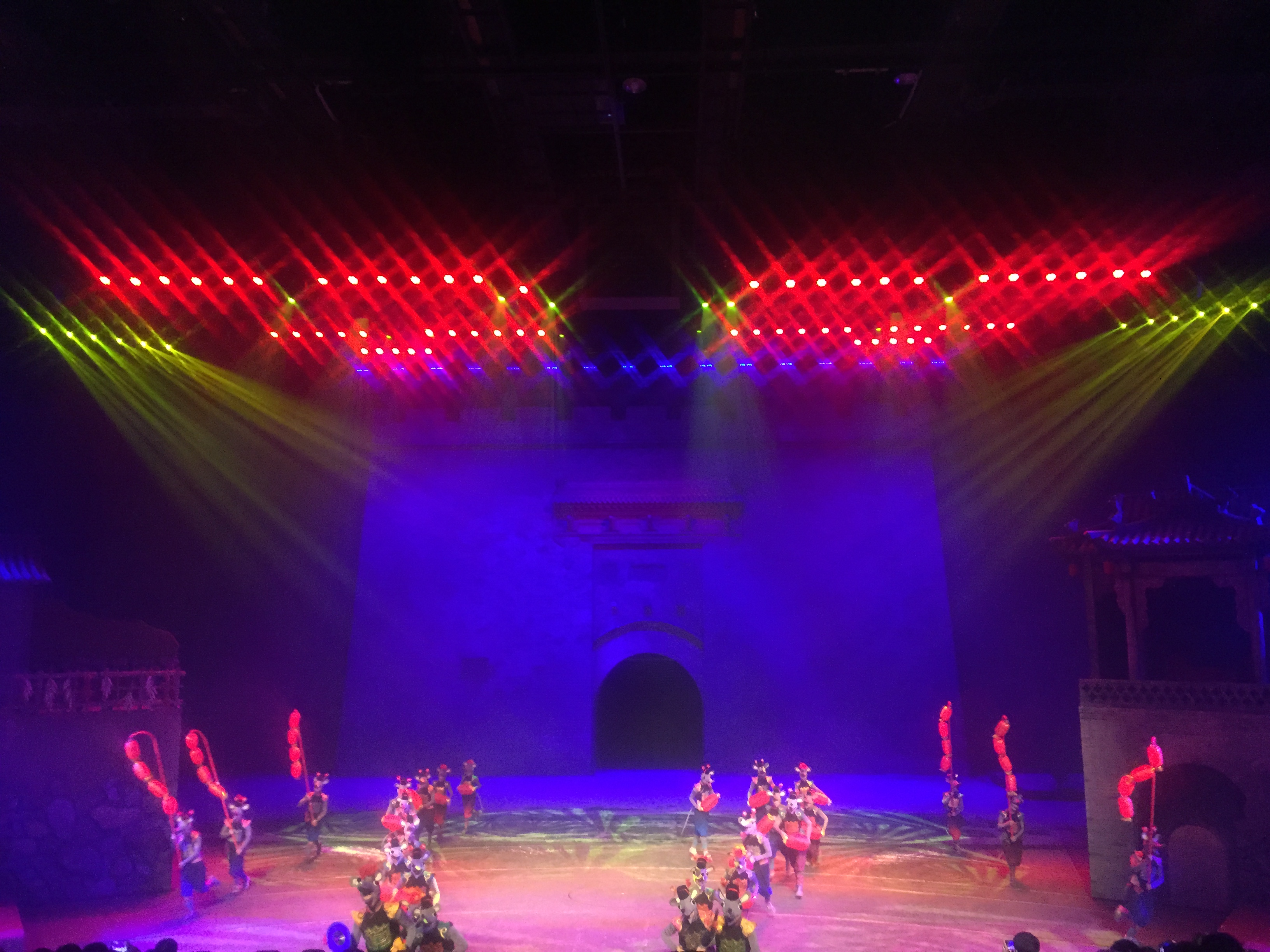 期待己久的打树花,这个室内表演场就在玻璃塔楼的对面登上长长的台阶就是了,是不是很方便 。打树花"表演的主角是三位头戴草帽、反披着羊皮袄的艺人,他们的那身行头是为了防烫伤用的。民间艺人表演在身后的近10米高的城墙上,能够看到斑斑锈迹,那是以前打树花留下的痕迹。待滚烫的铁水被倒进城墙前面的盆子里,一位师傅就上场了只见把手中白色的勺子伸向铁水,火苗子一下就蹿了起来。当他把一勺铁水奋力抛洒向城墙的时候,一颗颗珍珠般大小的红色水珠"哗"的一下,炸成了一簇簇小伞状的金黄色火花,顺着城墙向远处四散开来。关于打树花还有一个凄美的传说,而这个舞台剧则是围绕此传说而展开,为您叙述那场美丽背后的动人爱情故事。