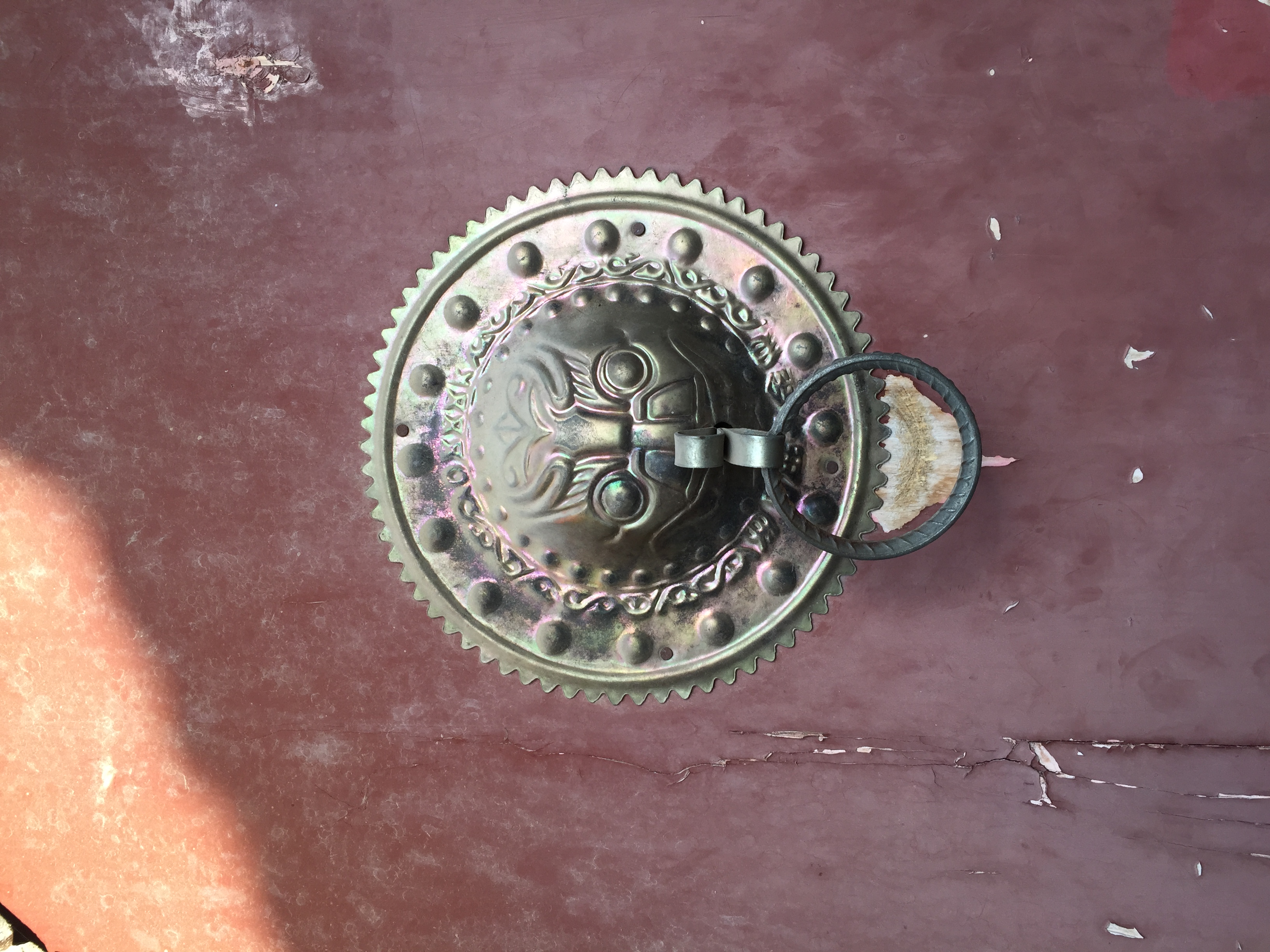 正门名枕,是大门的重要组成部分。用石雕刻,多以箱形和抱鼓形为主体,抱鼓石与门枕石由同一块石头雕刻而成,门枕石在大门内侧承托大门的重量,抱鼓石在外侧起平衡重力的作用。暖泉古镇的多为抱鼓形门枕石。(图中大门口的位置圆形的石头即门抱鼓形门枕)