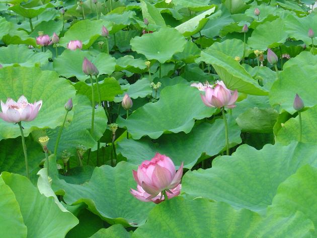 满淀的荷花、荷叶挨挨挤挤的。这样子的荷花是本地野生品种的,繁殖能力极强。