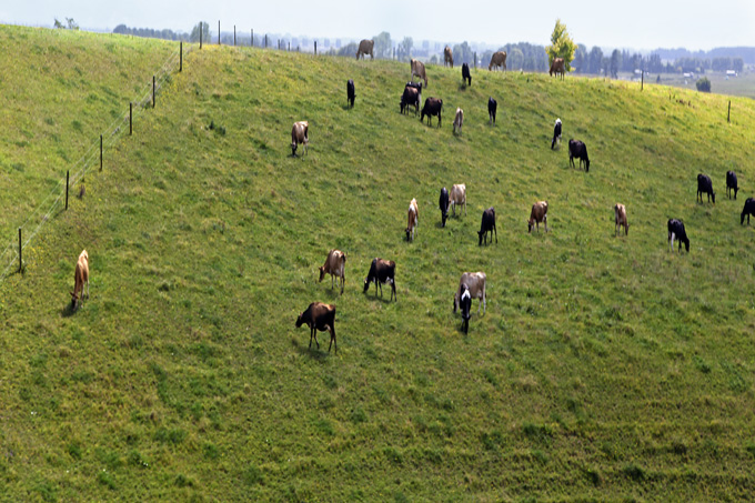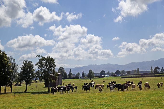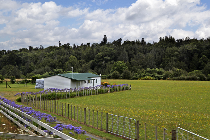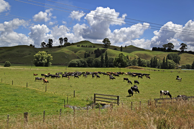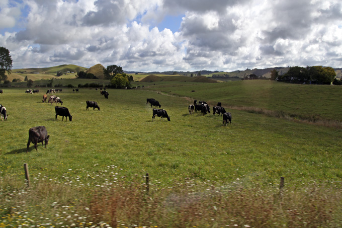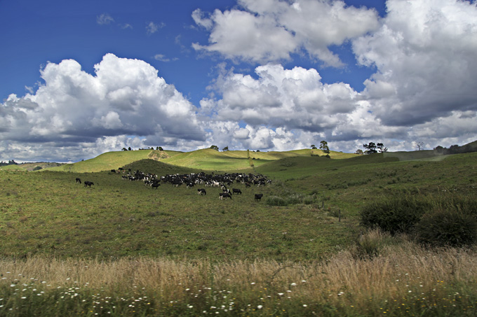 乘车前往新西兰著名地热城--罗托鲁阿近300公里的途中,自然牧场的风光特别好。这儿虽然没有新疆牧场的壮美和高坡大川,但平缓起伏的丘陵植被相当茂盛,极没有沙化景象。牧草长的十分茁壮,满山遍野就象大地被铺上巨大无边的绿地毯,牧场主的别墅、一片片林子,落落错错的分布在原野上,给大地点缀出丰富的层次。天然的大牧场,这儿一群羊,那儿一群牛,偶尔出现一群鹿,散满绿野,白的、黄的、黑的、还有花的,把大地镶嵌成一幅幅动感、和谐又美丽的画面,仿佛是车在画中行。行车途中不断按下快门(均为行车中拍摄)