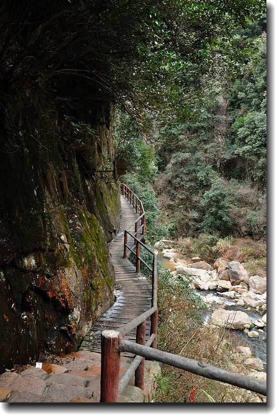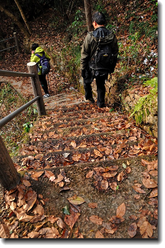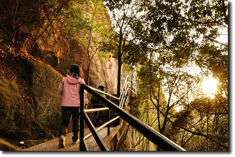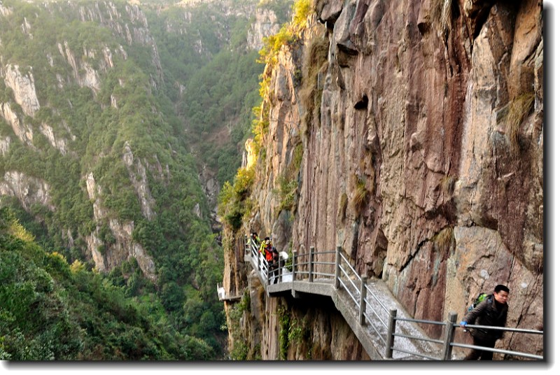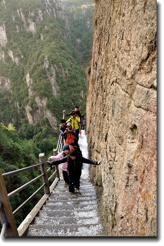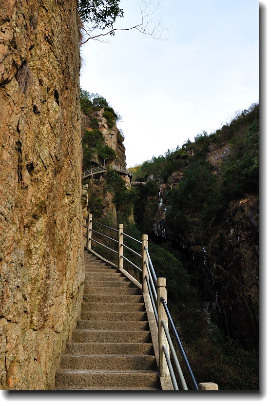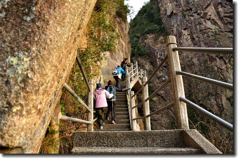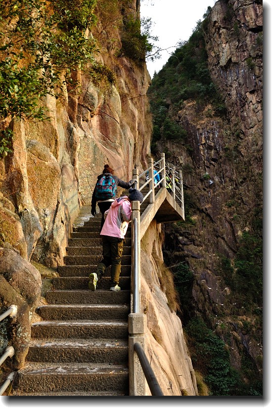 上山的石阶梯超陡,上山的石梯做在悬崖上围山而上。