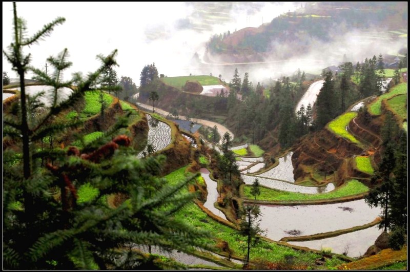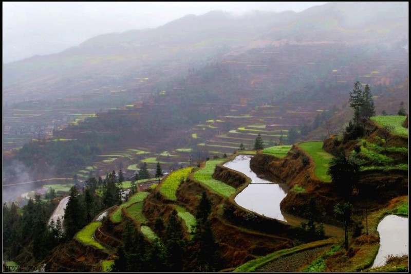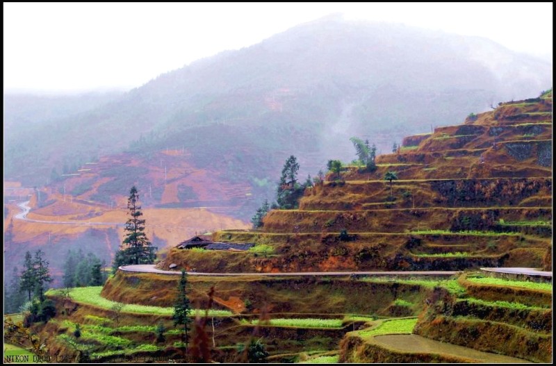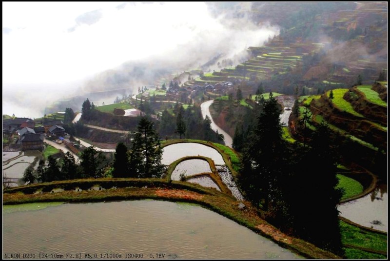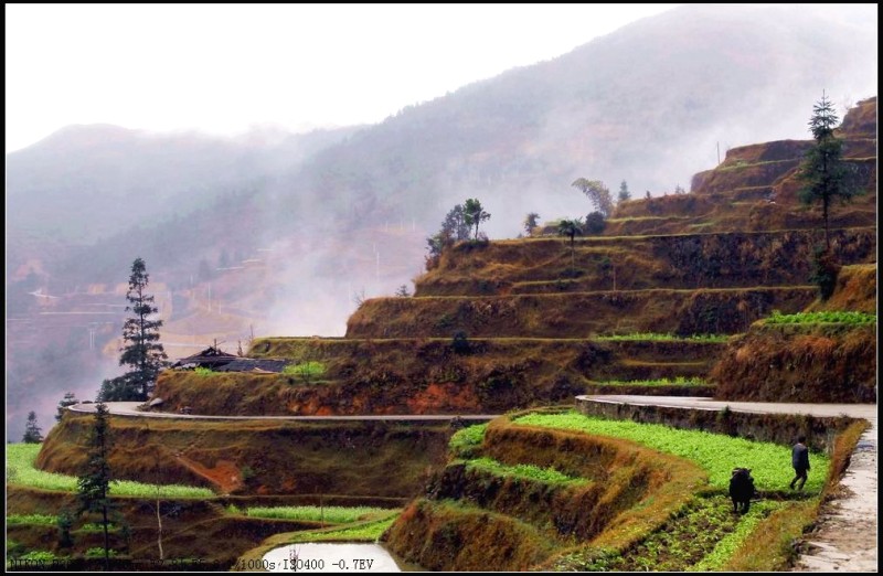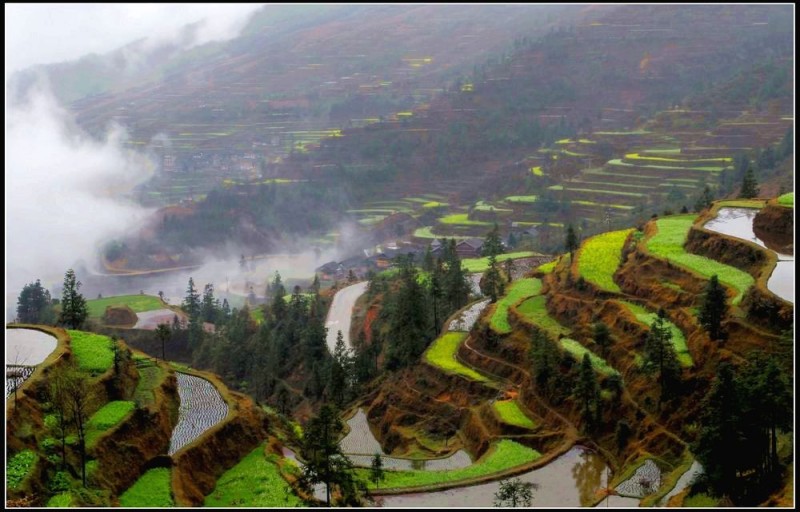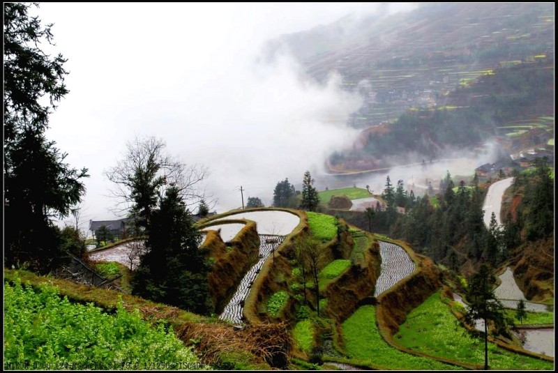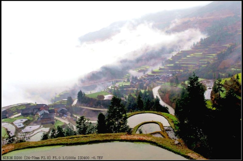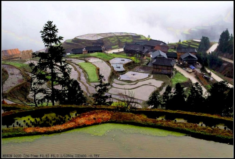 堂安梯田以其恢弘的气势和独特的建筑方式而令人叹为观止。整个山岗除了育林区,到处都是侗族群众历经数百年修筑的梯田。我们当春赶上,只见盛满泉水的梯田将山坡变成了一面面很大的镜子,在日光云雾的映照下,白茫茫亮闪闪的一片;金黄的油菜花又将山坡妆点得绿油油、金灿灿的一片,让人流连忘返。