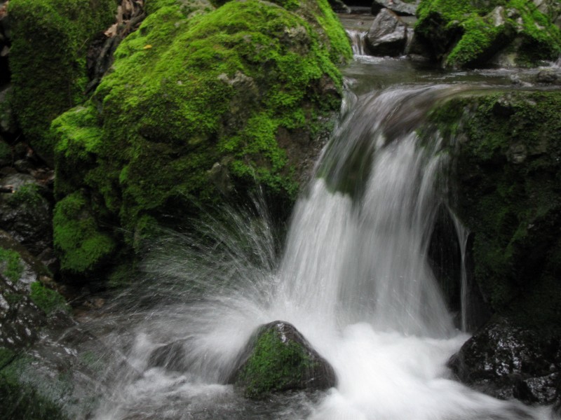 我们第二站去的是虎塘沟。一片茂密的原始森林,树深林密,置身其中,难见天日,景色清冷幽僻,适于消夏。天空中飘起了雨丝,不大,不经意间的落下,像花洒一样浇湿了树叶,发出沙沙的声音,各种形状的树叶草叶泛着水光,清新鲜活翠色欲滴。树梢的雨水凝聚成大的水珠,隔三岔五地滴落到人的身上。一条青溪从两山中间泻出,跌出千百层雪白的浪花。溪水里高低嶙峋的石头垒叠着,千奇百怪的山石长满了密密的绿苔,很有古意,又很像动物的绒毛。山石蹲踞溪水中,像是牛羊在低头饮水一般。水石相击,一路发出哗哗啦啦的声响,名之曰:响溪。
