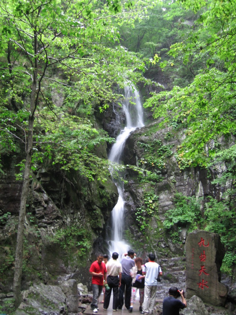 我们首先去的是飞瀑涧。顺着山溪旁的小路向深山进发,忽有轰鸣声传来,轰轰隆隆声震耳鼓,一定是瀑布的声音。果然,透过密林,一道白亮亮的水墙出现在眼前。就是这条山涧溪水,一路恣意奔涌,来到这里猛然遇上陡壁绝谷,巨大的落差使它收脚不住,狂跌数十米,喷涌而下,发出雷霆万钧的声响。是撒欢的声音,是亢奋的声音,是惊骇的声音,直惊得你目瞪口呆。飞珠溅玉,水从空中抛洒下来,跌碎成凉津津的水雾,浸在脸上,凉在心里。太震撼了!我们狂喊了起来,心跳也加速了。面临阔达的瀑布,任你胸中有千丈的愁怨,也会荡涤得一扫而空吧。此时,我只想做瀑布下面深坛里的一片草叶,任急瀑劈头盖脸冲洗个够,然后随着溪流流向汪洋。