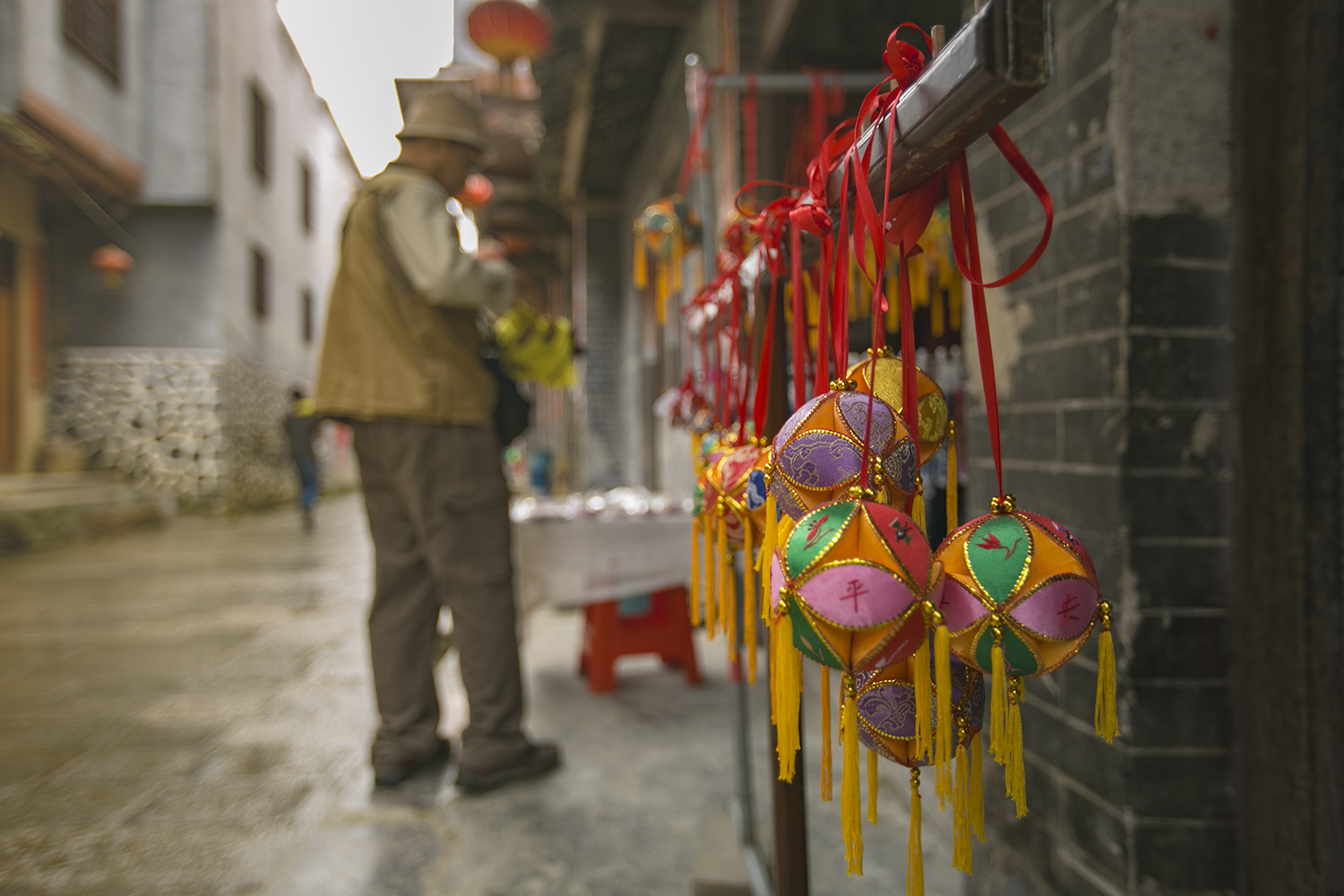 家家户户都会制作绣球,从七、八岁的娃娃到六、七十岁的老太太都参加制作绣球。绣球是旧州的传统工艺晶,用彩绸作球办。