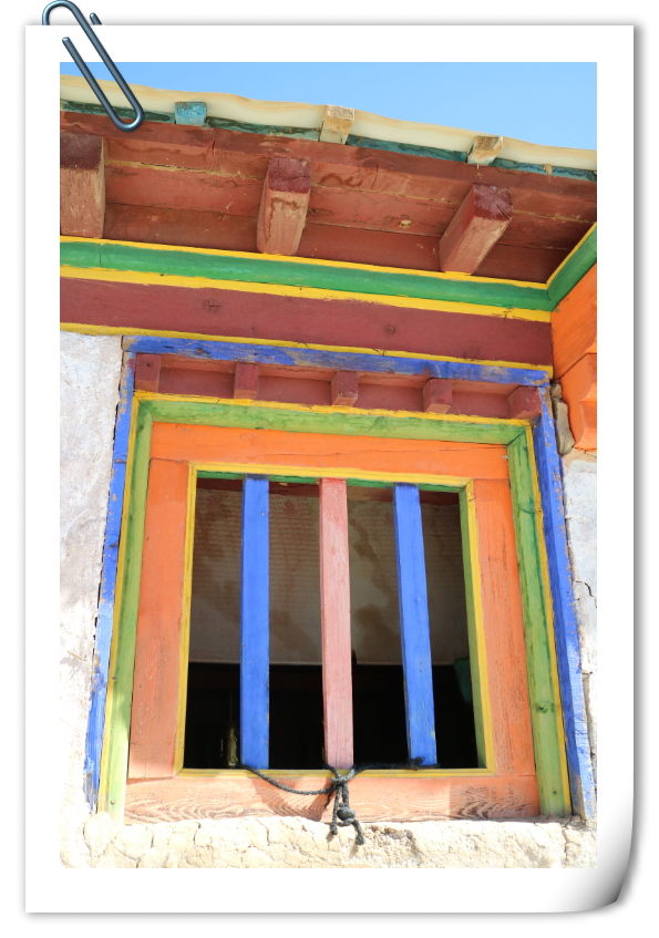 最上面的寺庙四周围着一圈平房,里面是转经筒。它们包围着中间的经殿,褐色的土墙上,小窗色彩艳丽。