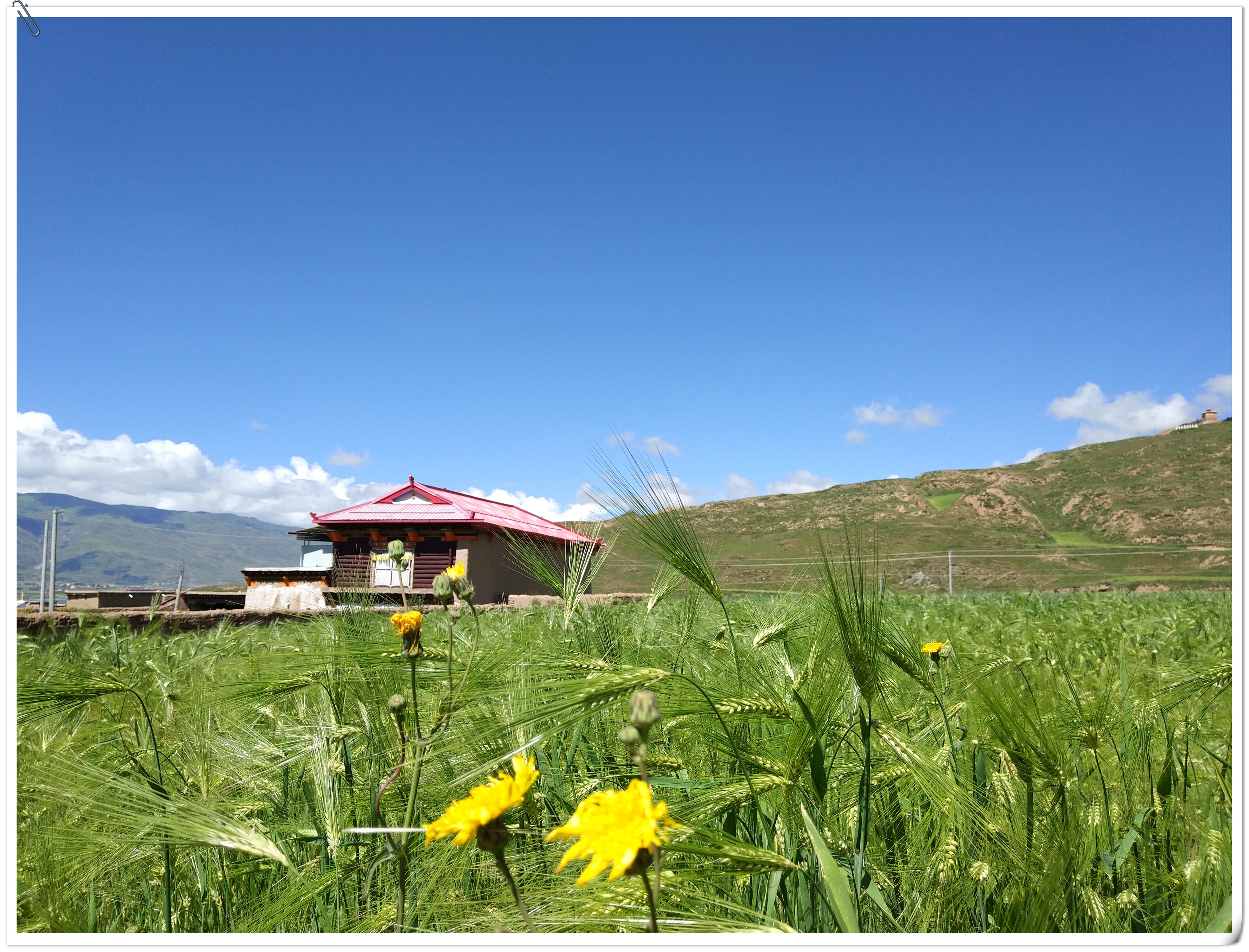 出发前还不知晓寺庙的名字,我们只是想行走。穿过几乎没有车辆的机场大道,很快我们便转入宽阔的平原,一半草原一半青稞。遍地五彩的野花,在牛粪的滋养下光彩夺目。对于我这样的爱花之人,只有端起相机,记录下这些美好。