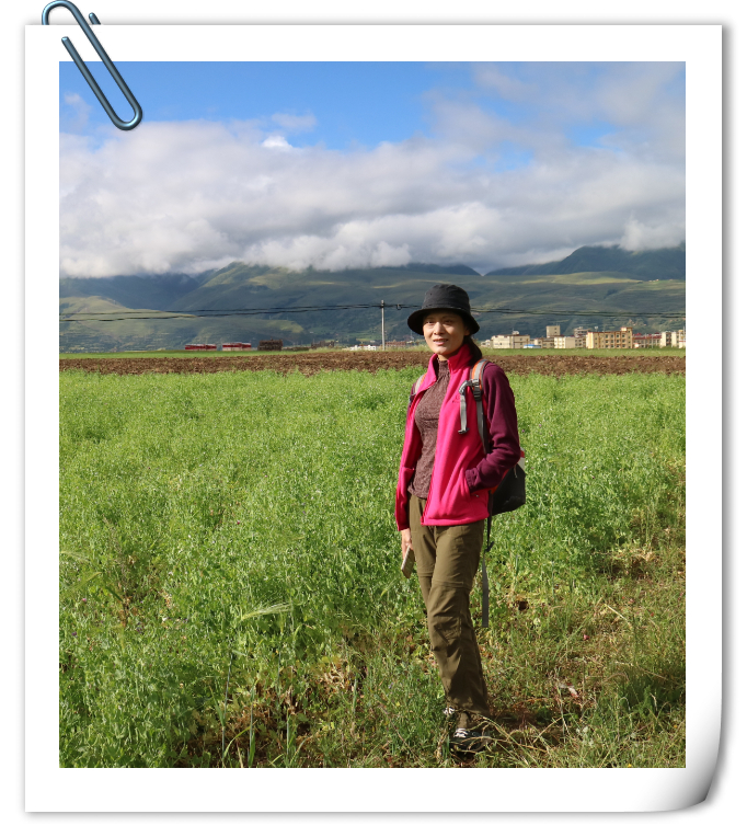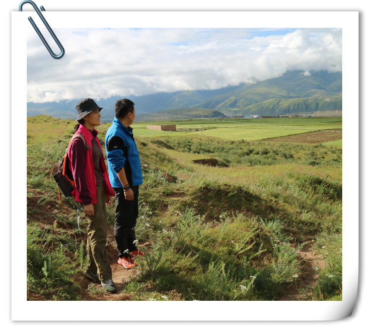 站在山顶可以看到,甘孜县很开阔,有大片平地可以种植。我们穿过杂草丛生的山坡,下到平缓处,发现在上面看到深浅不同的绿色,原来是种植的豌豆跟青稞。因为成熟度不同,所以会呈现处颜色不一的嫩绿跟黄绿色。