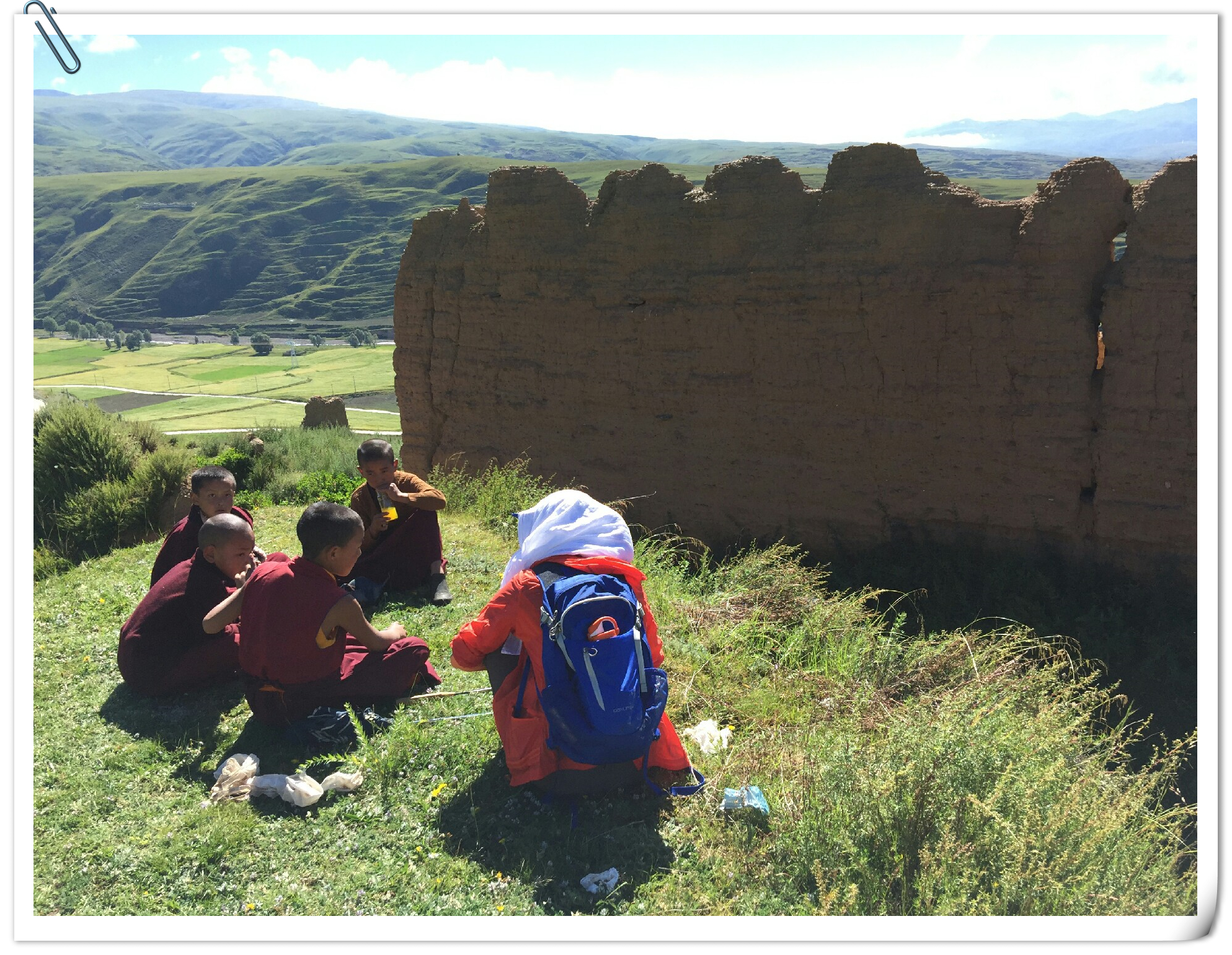 看似很短的距离,走起来需要些功夫。途中我们碰到一些小“扎巴”或“阿卡”,在羲语系佛教当中,能真正当上喇嘛的人不多。在这科普一下好了,和尚和喇嘛都是有一定道行的僧人,所以别看到光头的就叫和尚,也别看到穿了僧袍的就叫喇嘛喔。他们在玩耍,有的打羽毛球,有的在追逐嬉戏,还有几个围坐在一起,人手一瓶橘色的饮品。我在他们身边坐了下来,试着询问:你们好呀!扎巴道:你好!我说你们都多大了?其中一个扎卡告诉我:我11岁,他指着旁边得几个伙伴一一介绍7岁,9岁,13岁.我心想他们都还这么小。我说你们喝的是什么?答曰:饮料。是谁给你们的饮料?答曰:我们师父。你们每天都有饮料喝吗?不是。我说那你们今天一定是表现很好,师父才奖励你们的对不对?扎卡们,羞涩的笑笑算是对我的回答。