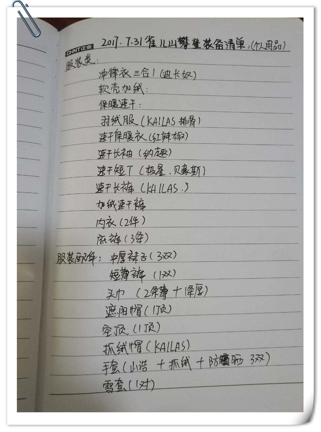 7月19日上午,在微信上联系了川藏队雀儿山负责人高度,填写好报名表,缴费完成。然后双方电话沟通,他询问我的户外经验以及是否有初级雪山攀登经验。户外经验我是有不少的,可是雪山攀登我还真没有,但我早就想好了一个善意的谎言,我淡定的告诉高度,雪山我只去过哈巴,其他的没去过,就这么蒙混过关。其实我对自己还是心中有数的,请原谅我善意的谎言,要不怎么遇到我那一群可爱的队友呢!高度在电话中跟我讲了一遍装备情况,以及租赁技术装备的尺码,还有背夫费用等相关事宜后,发了装备清单表给我自行再核对。7-31半自助雀儿山之行就这么定下来。查缺补漏,添置了夏尔巴雪山镜,山浩的防水手套,还有一件红辣椒的功能保暖速干衣。TAR的银搓是好友东方不败借我的。以下是我除技术装备外的所有个人装备清单,仅供参考: