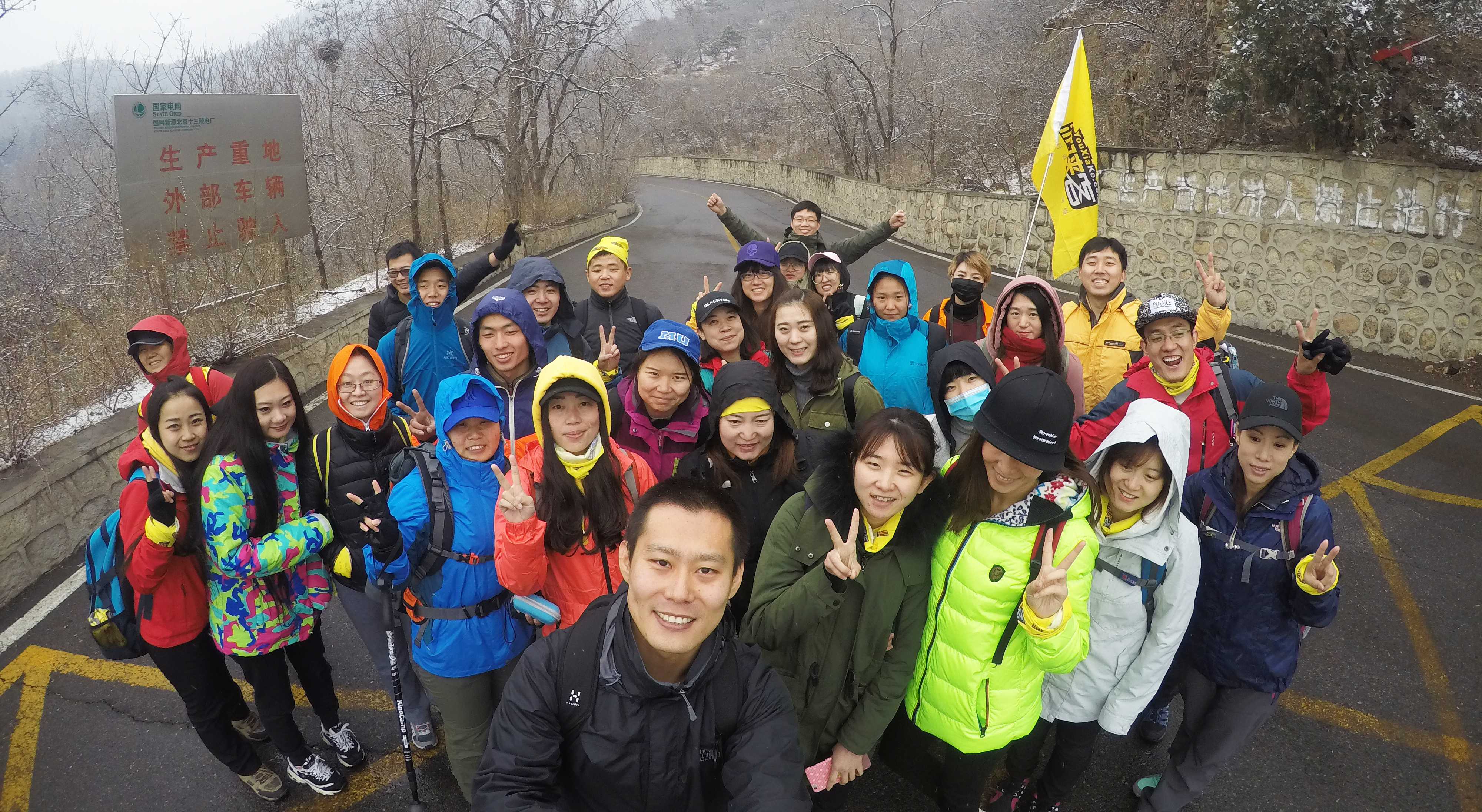 到达蟒山脚下,热身准备完毕之后,大家开始准备爬山。