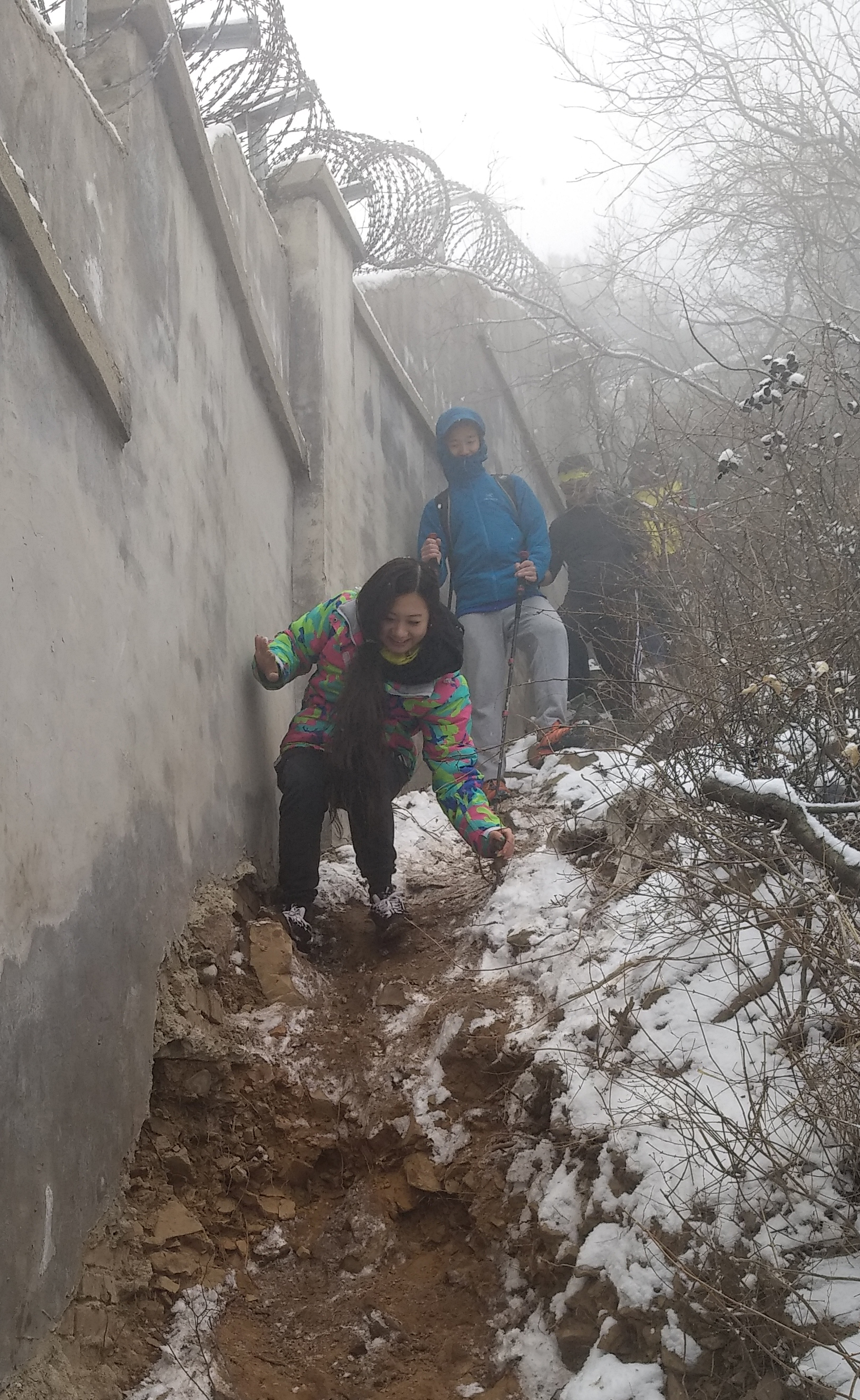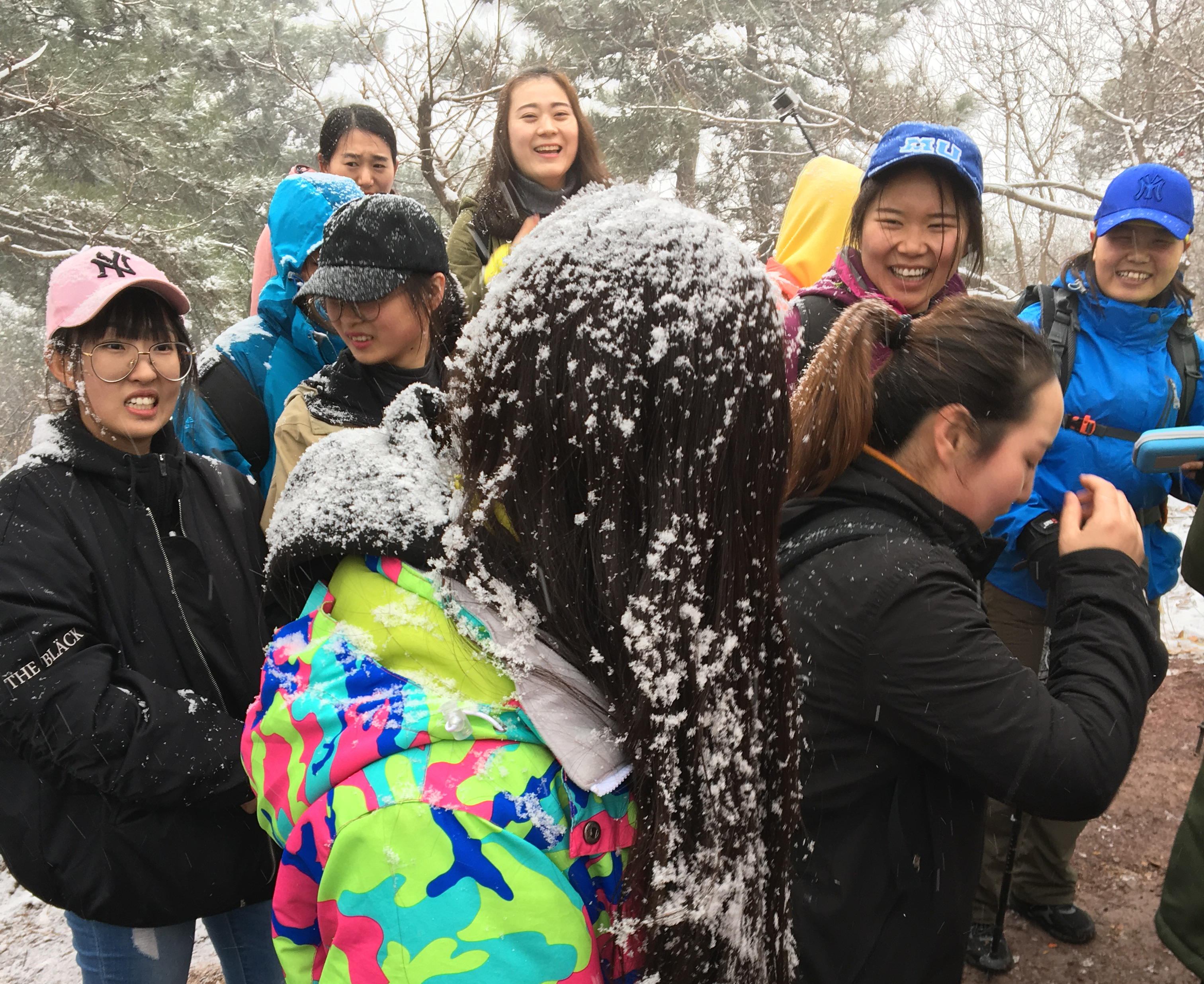 在爬山途中,因为下雪的原因,路面湿滑,大家纷纷伸出援助之手