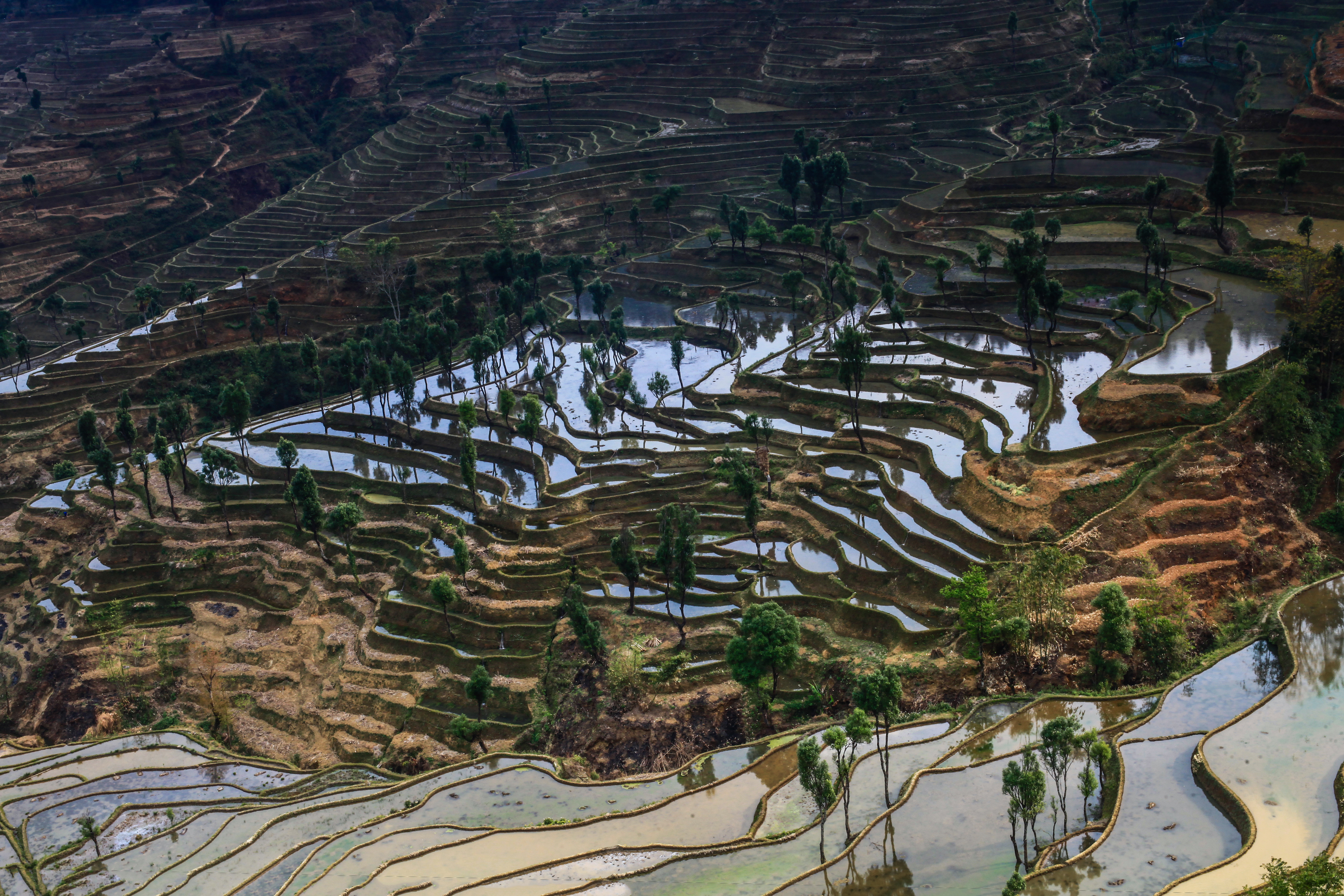 元阳梯田位于云南省元阳县的哀牢山南部,是哈尼族人世世代代留下的杰作。元阳梯田是红河哈尼梯田的核心区。元阳哈尼族开垦的梯田随山势地形变化,因地制宜,坡缓地大则开垦大田,坡陡地小则开垦小田,甚至沟边坎下石隙也开田,因而梯田大者有数亩,小者仅有簸箕大,往往一坡就有成千上万亩。红河哈尼梯田位于云南南部,遍布于红河州元阳、红河、金平、绿春四县,总面积约100万亩,仅元阳县境内就有17万亩梯田。元阳梯田是哈尼族人1300多年来生生不息地“雕刻”的山水田园风光画。