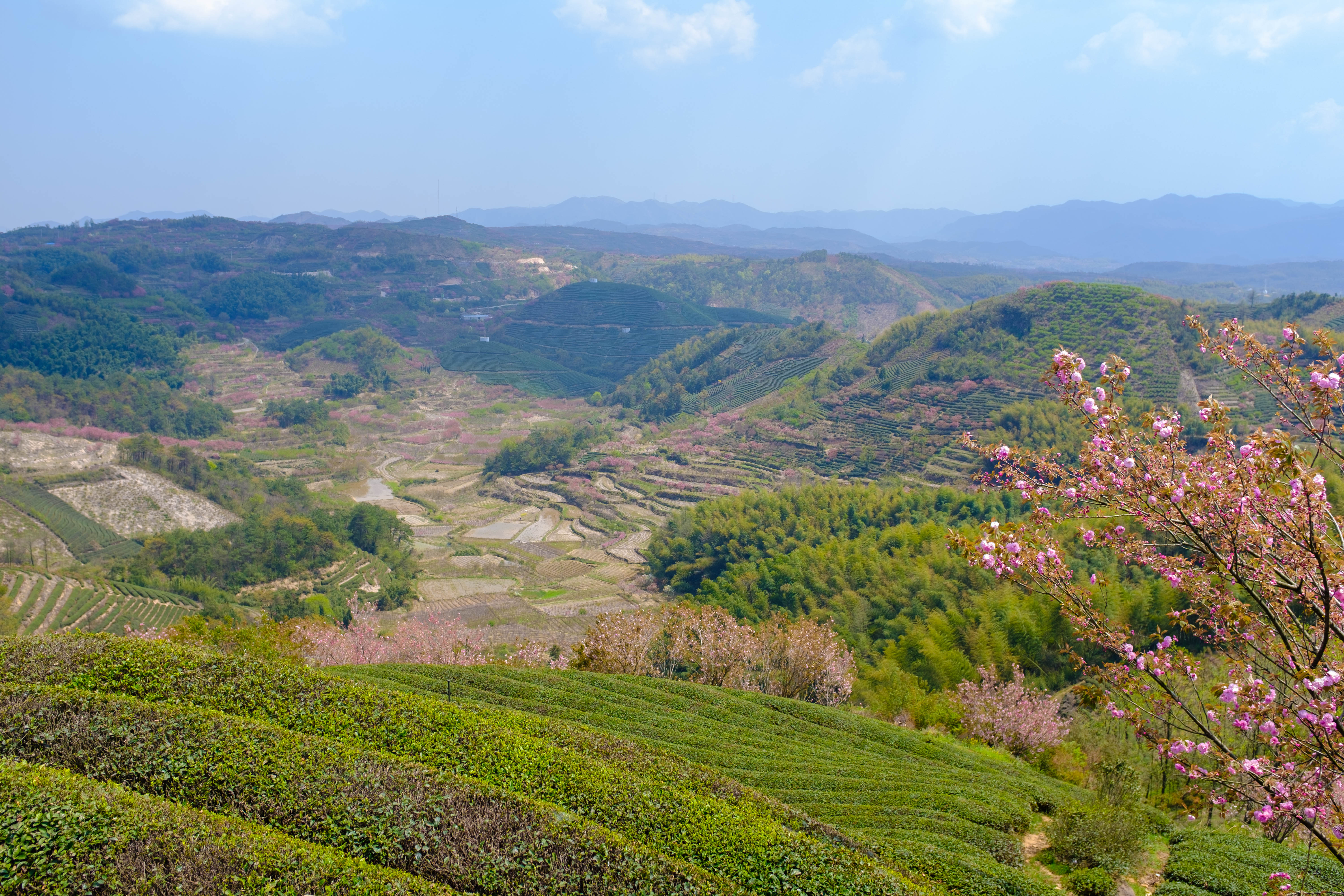 视野很开阔的茶山点缀着大片晚樱,再一次想说,照片体现不出现场的美,