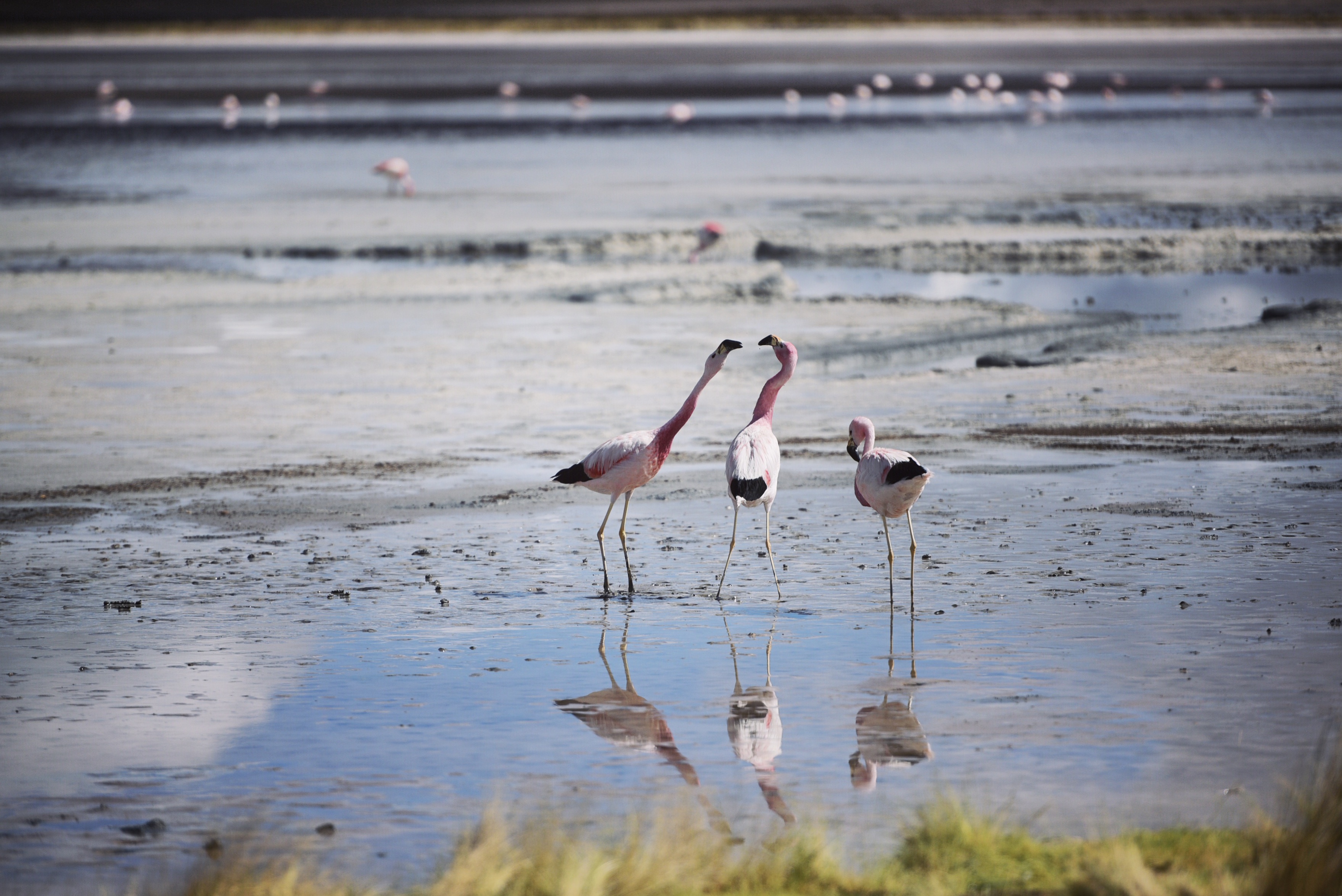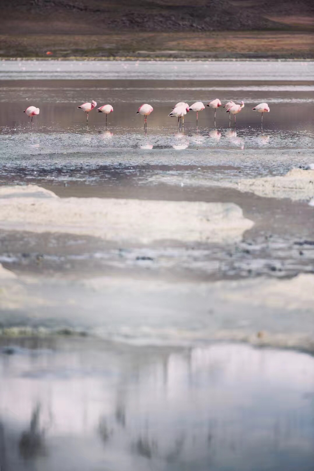 下车后,刺骨的寒风吹来,你会突然意识到,已经从乌尤尼的夏天来到了冬天。我们在寒风瑟瑟中缠着单薄的衣服和裤衩,愣头青的被寒风吹了半个小时,拍摄视频素材,真是不易。之所以呈红色是因为湖底有温泉滋养着一种红色的藻类和其他一些微生物。除此之外,湖中还分布着大片白色的崩砂沉积物(borax deposits),与红色形成强烈的色彩对比,还有之间交织的各种深浅色彩,层次丰富,真心是一种视觉盛宴。若是在早晚有点光线,估计还会另有一翻色彩与震撼。从高处远观,湖面上静静觅食的火烈鸟如散落的小音符一般奇妙,而其倒影恰似叠置的和弦,谱写着一曲美妙的视觉乐谱。