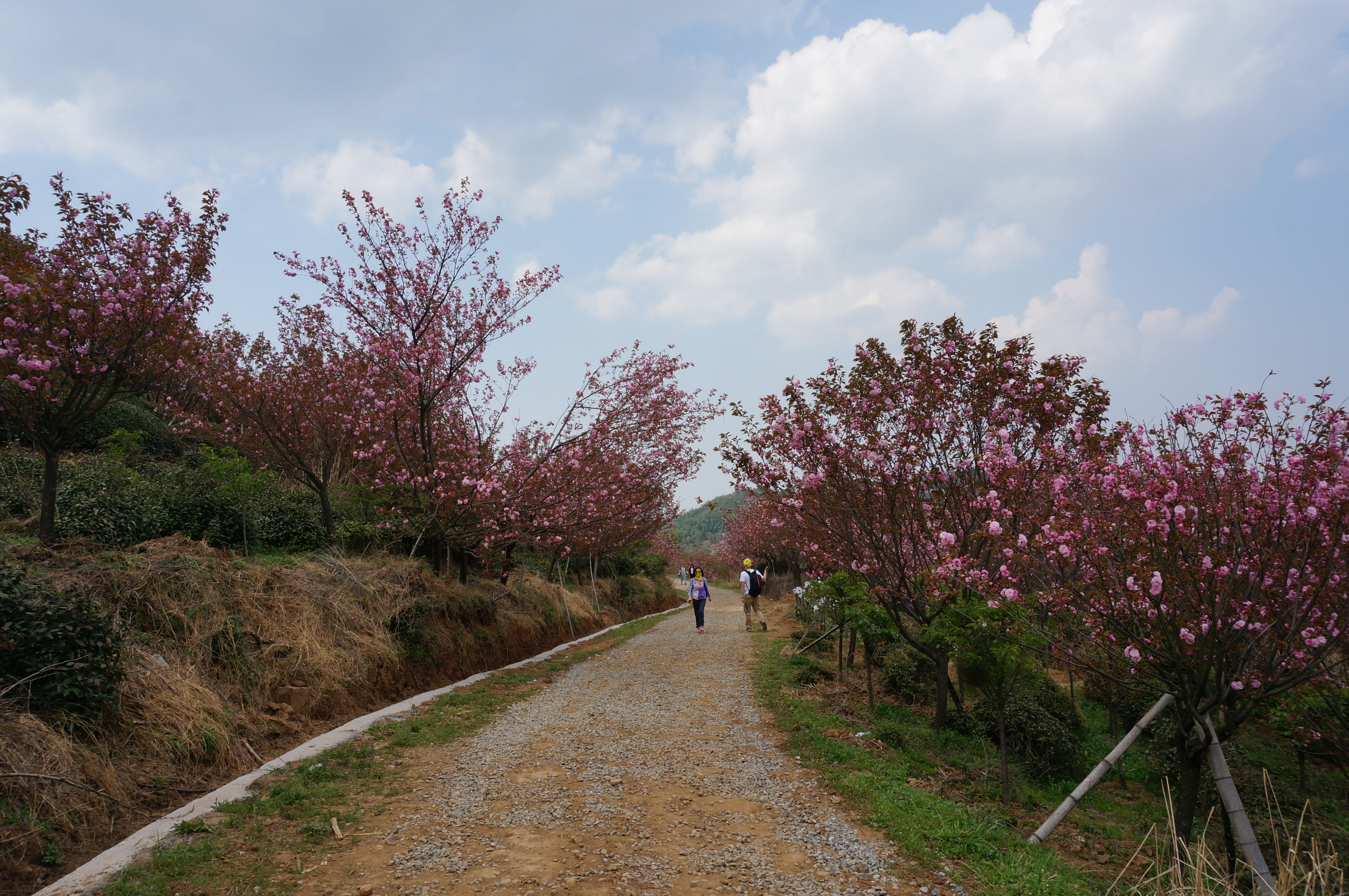 12:30,出发徒步樱花岗,一条运送花木的乡间小路成为了最好的赏樱道,左右两山坡上种满了樱花,加之视野开阔,村落翠烟袅袅,这里除了樱花还有万亩红枫,沿途还有大片艳而不俗的海棠花,还有高洁优雅的玉兰花,为此疯狂打call!