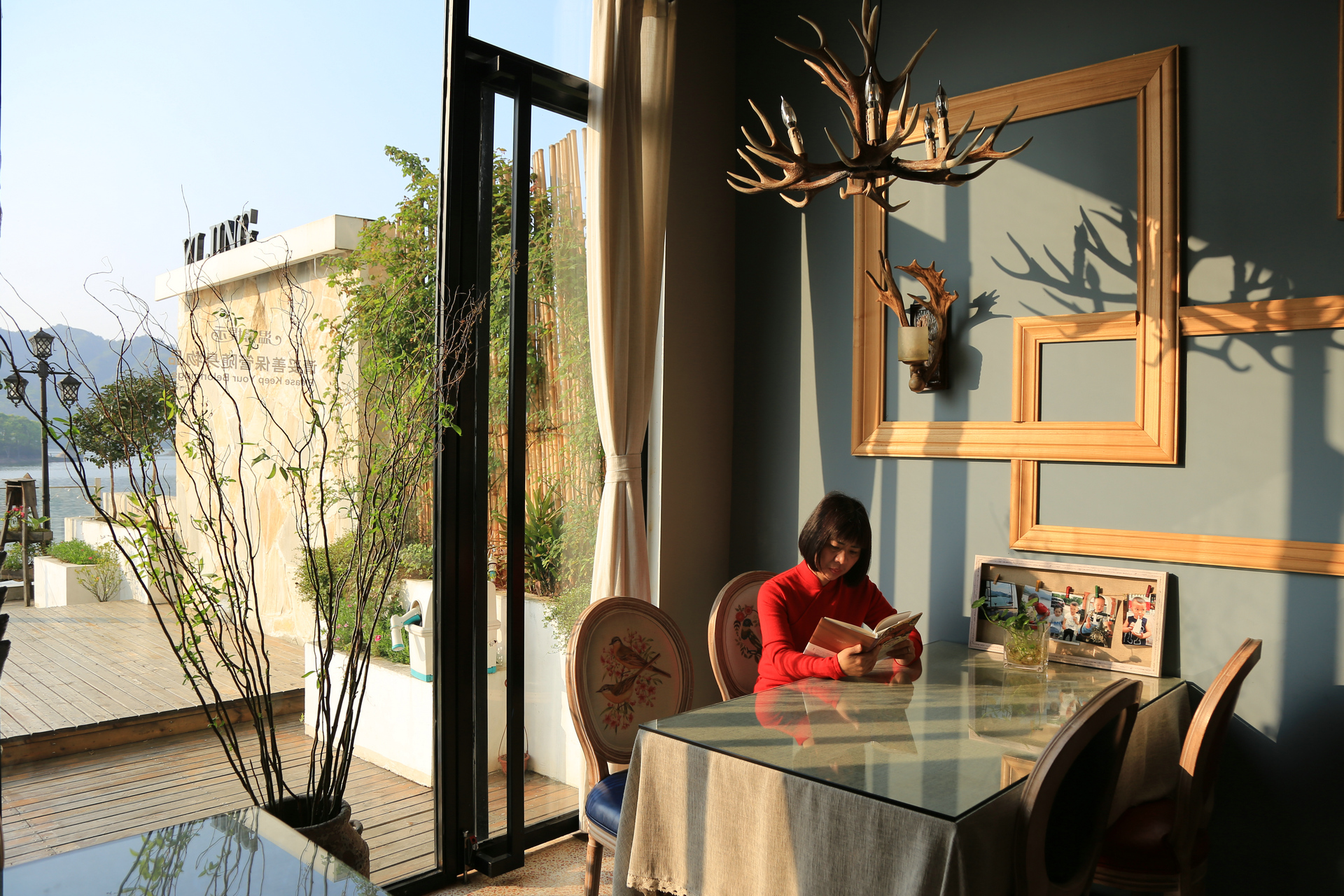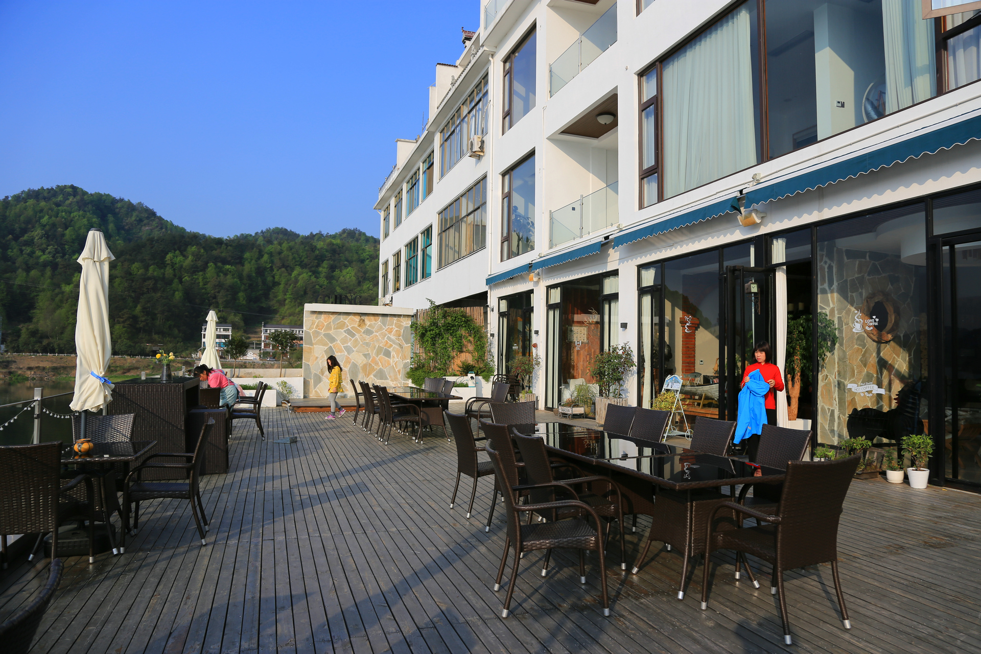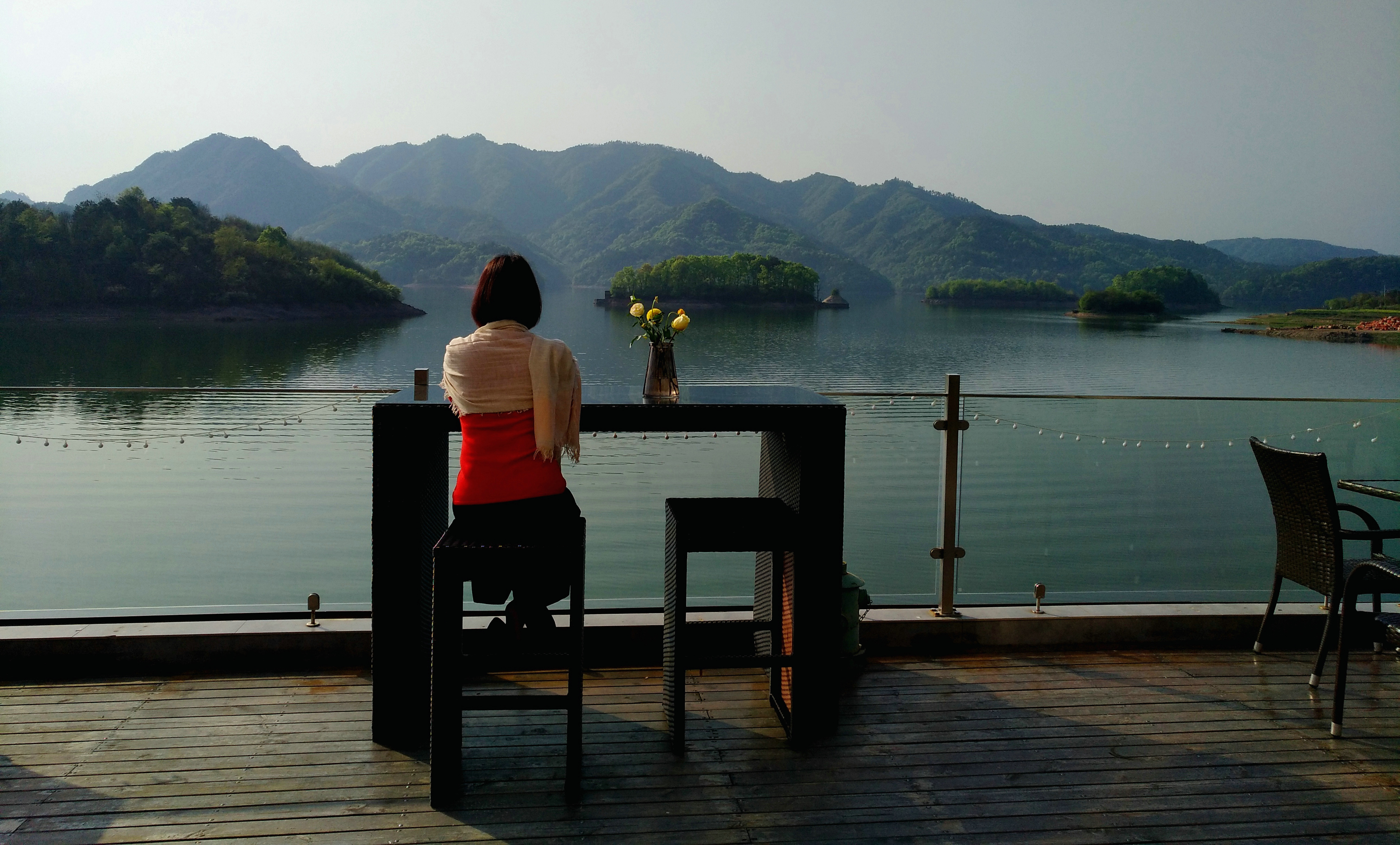 民宿的亲水平台很大,直面通济湖,一大早我们就在这里大摆poss,LP也收获了她此行最满意的一张照片,湖光山色,在水一方。