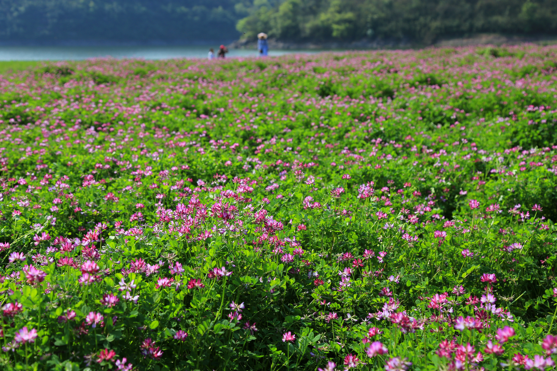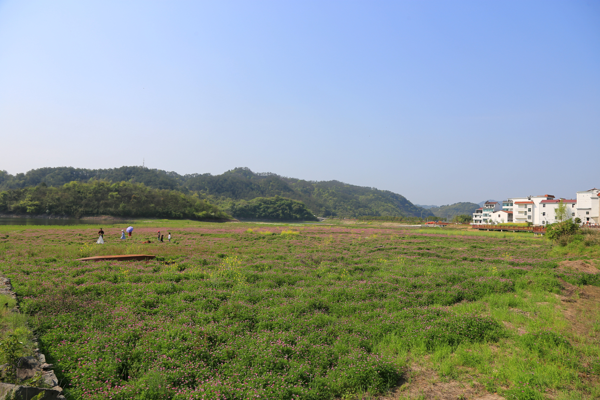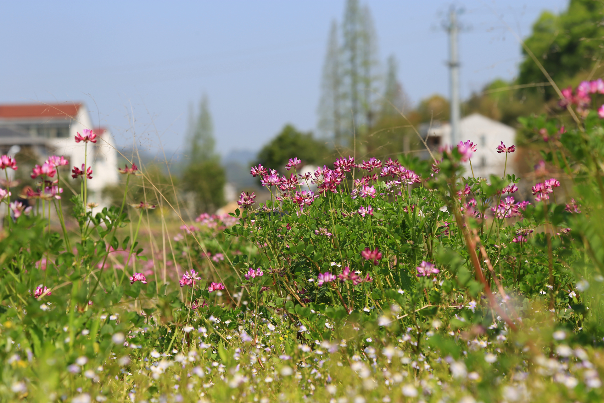 这里是通济湖的最东南角,离罗源村不远。盛开的花,学名紫云英,又名红花草,喜欢生长在温润的水边,是重要的绿肥和饲料。记得小时候,放学后的我们常常会带上镰刀跨上竹篮,择几簇鲜嫩的紫云英带回家清炒着吃,有一种清新宜人的草香味,不过那时候喜欢的,倒不是吃,而是可以和小伙伴在田野中撒野。