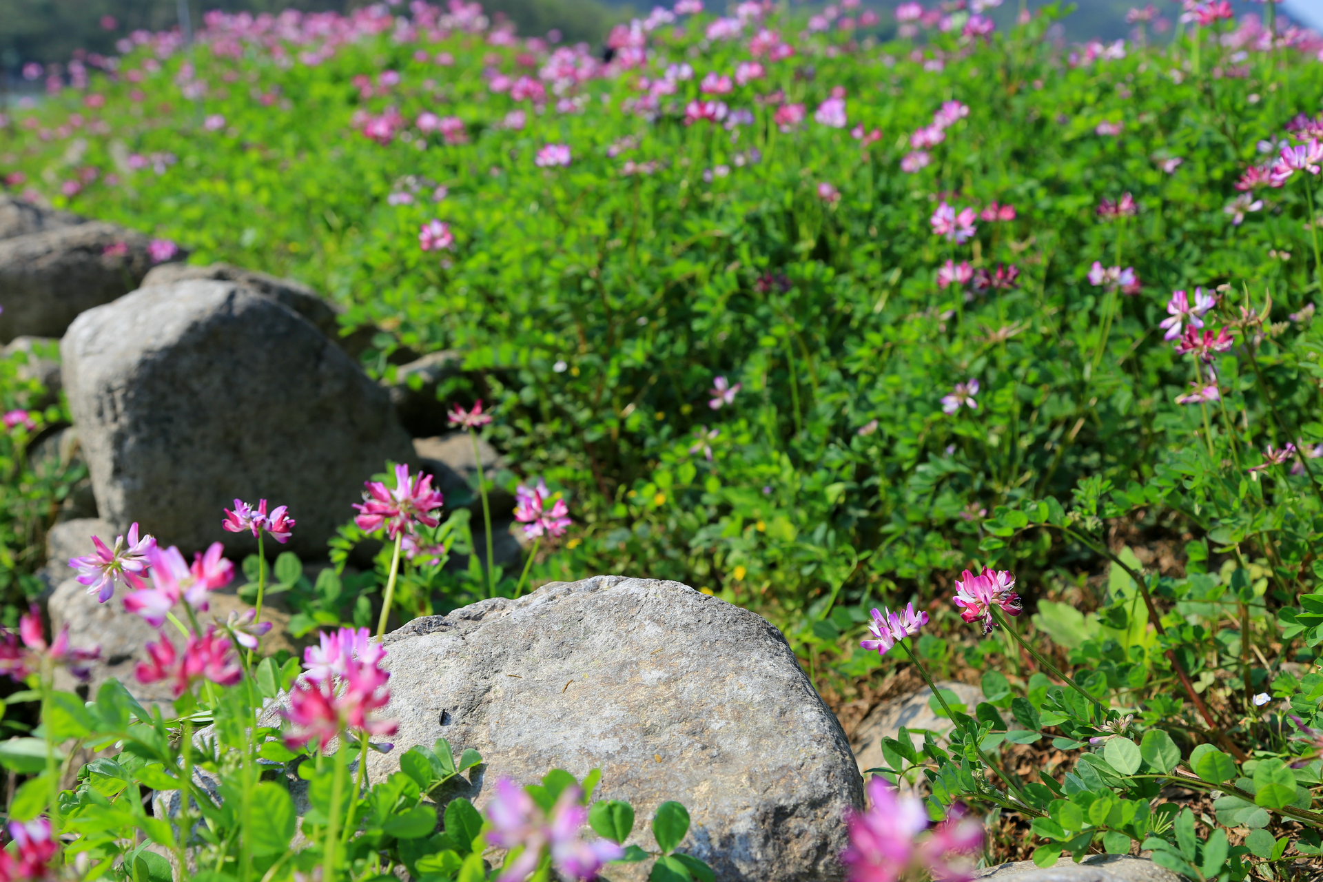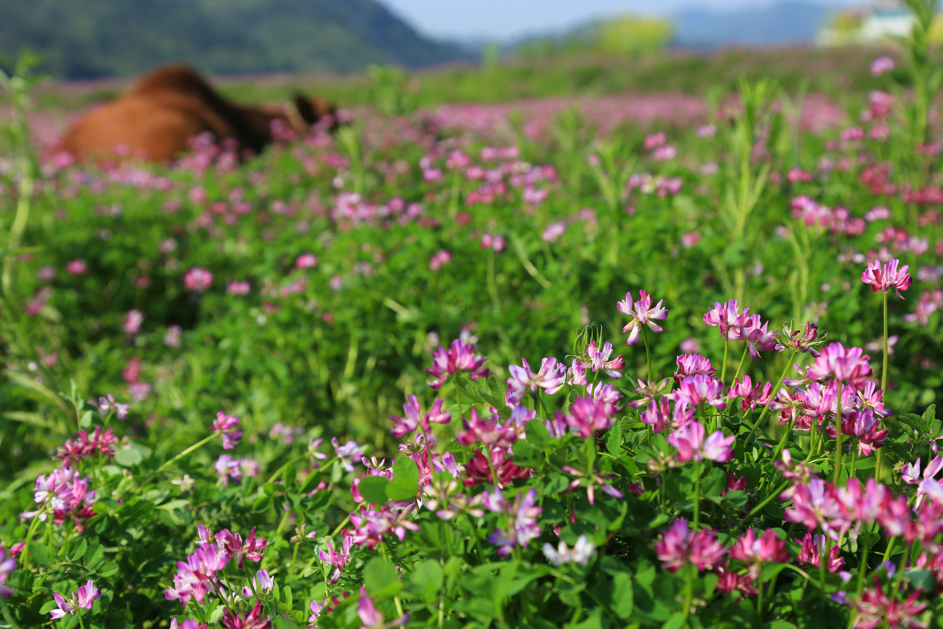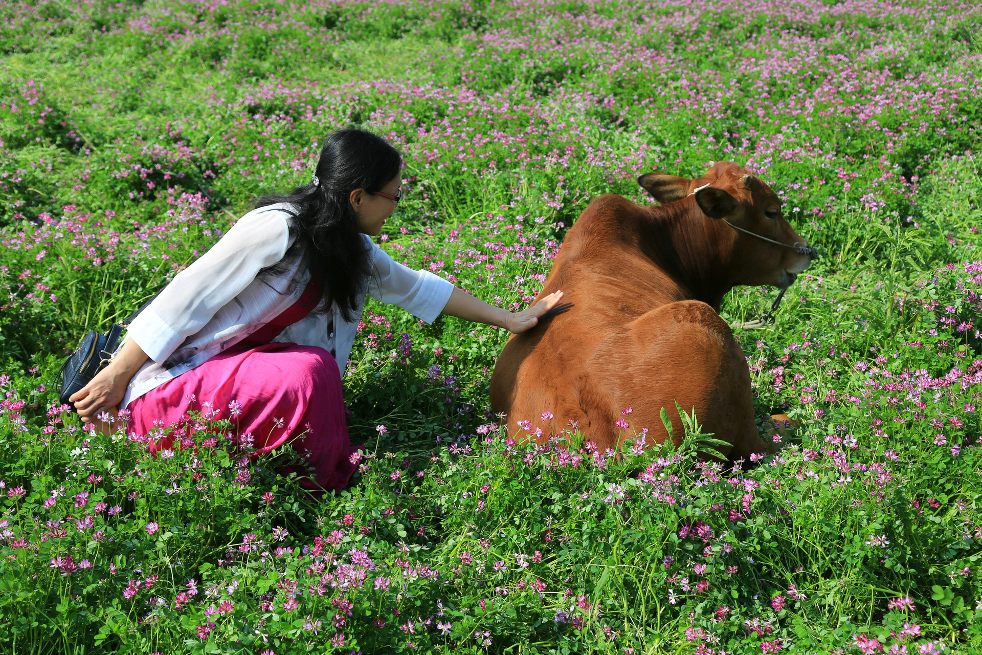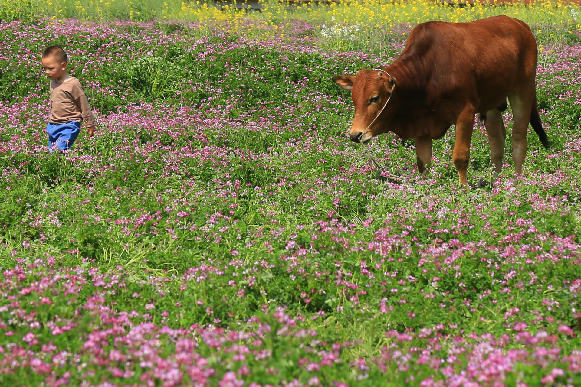 花草中的一头牛成为我们的拍照伙伴,此兄也酣卧其中不问世事,享受春日悠闲。不过搞笑的是一群小孩看牛老实,竟然骑了上去,于是牛兄颤颤悠悠的站了起来,儿童顿时作鸟兽散。