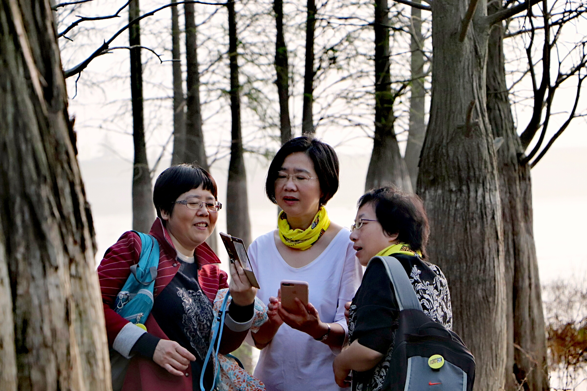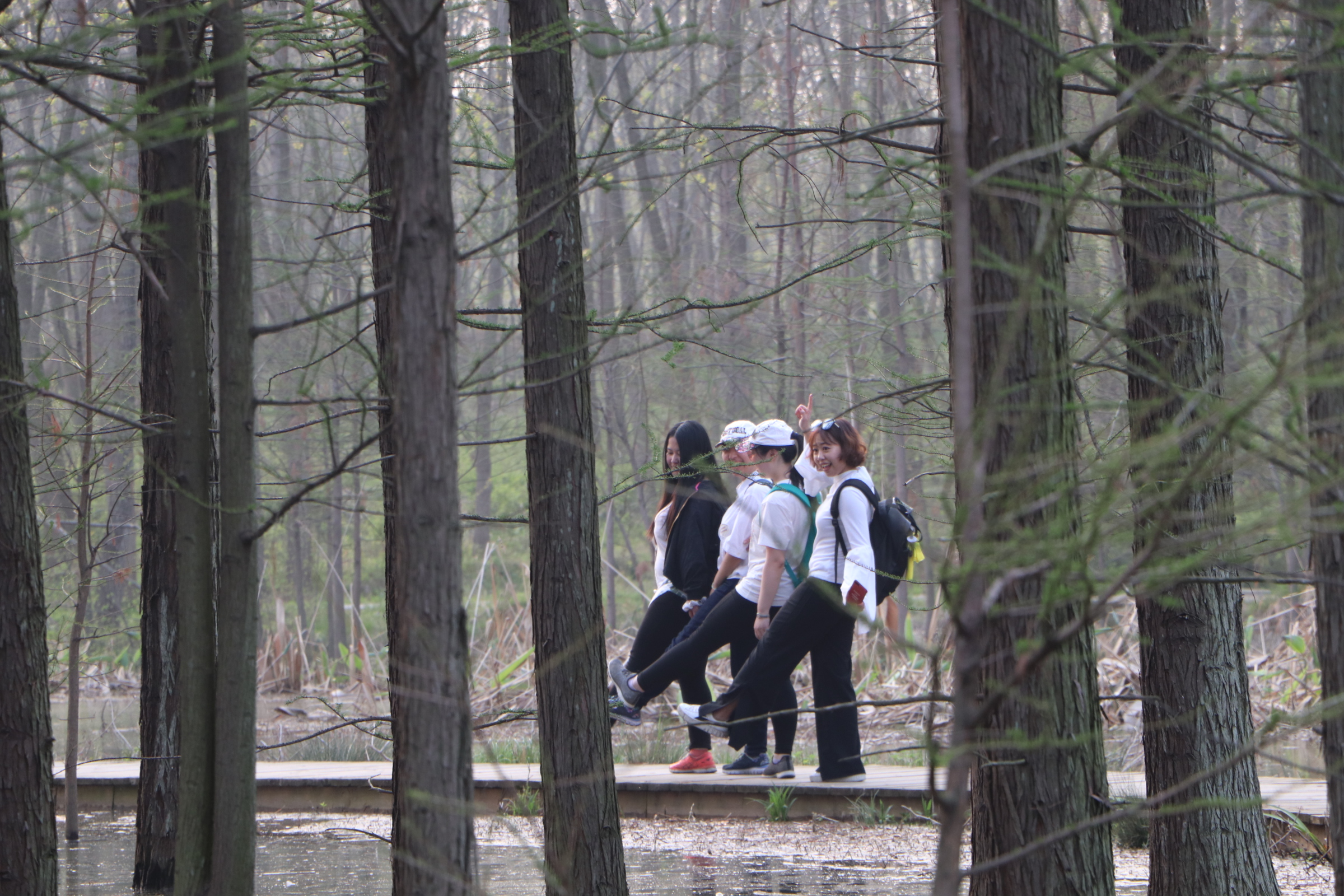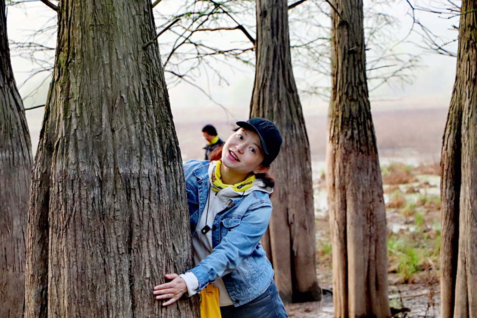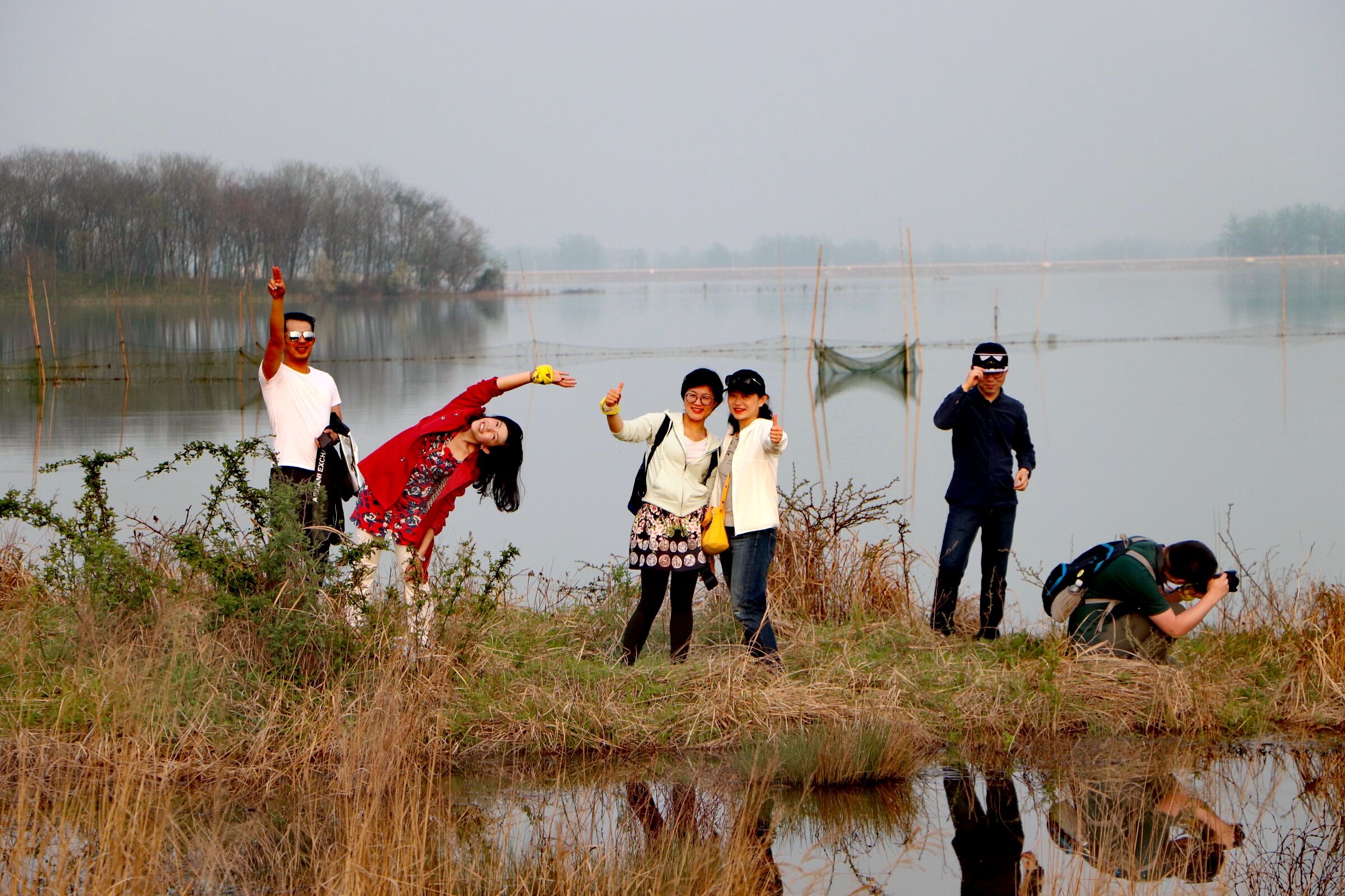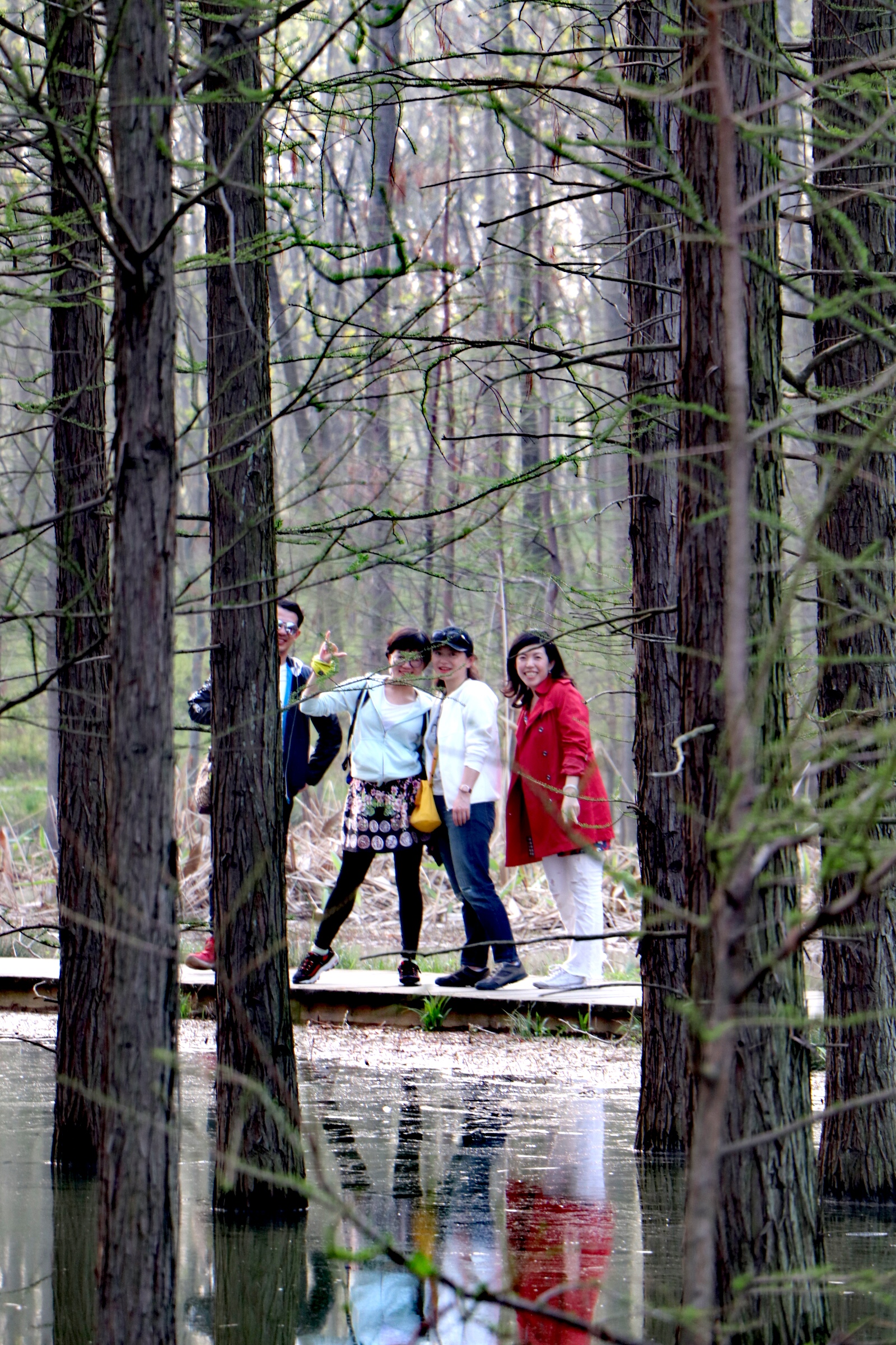 一路说说笑笑,走走停停,自然就慢了。转过一片树林,看见水边池杉林里隐约有几道身影,定睛一看,是前行的游侠。他们也看到我们了,“你们快从那边过来,这里。。。”,然后我们就过去了。