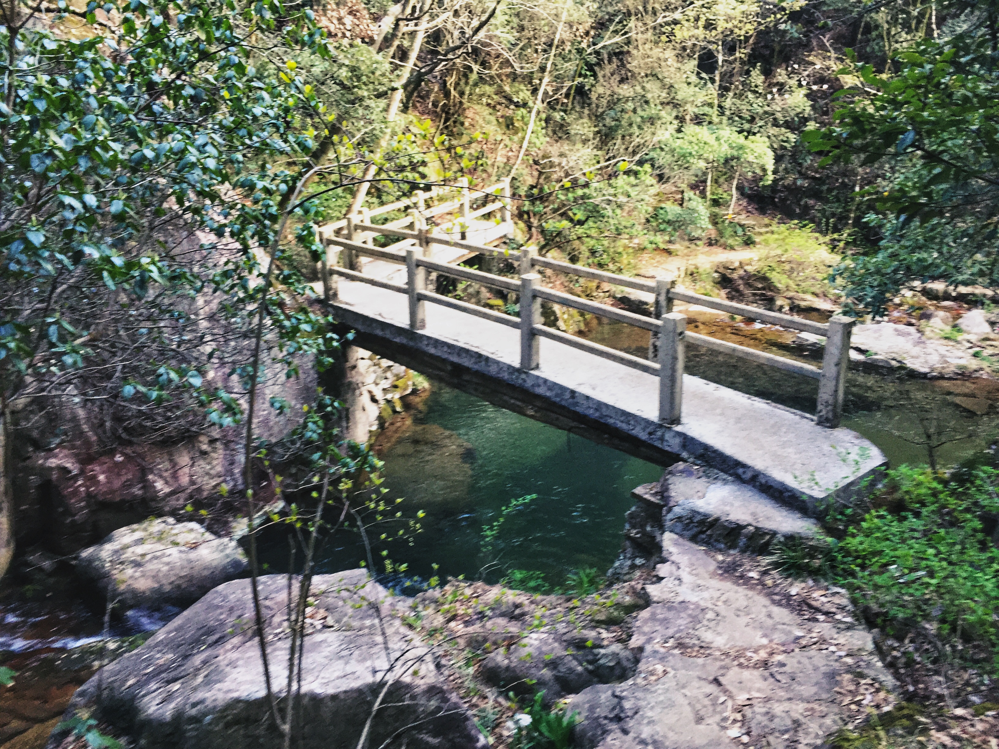 在浙西天池休息过后,我们整装出发。沿着小溪边蜿蜒的石板路下山,途径一座座石板桥。每一座桥与周围的山、水、树构成一幅幅的风景图。