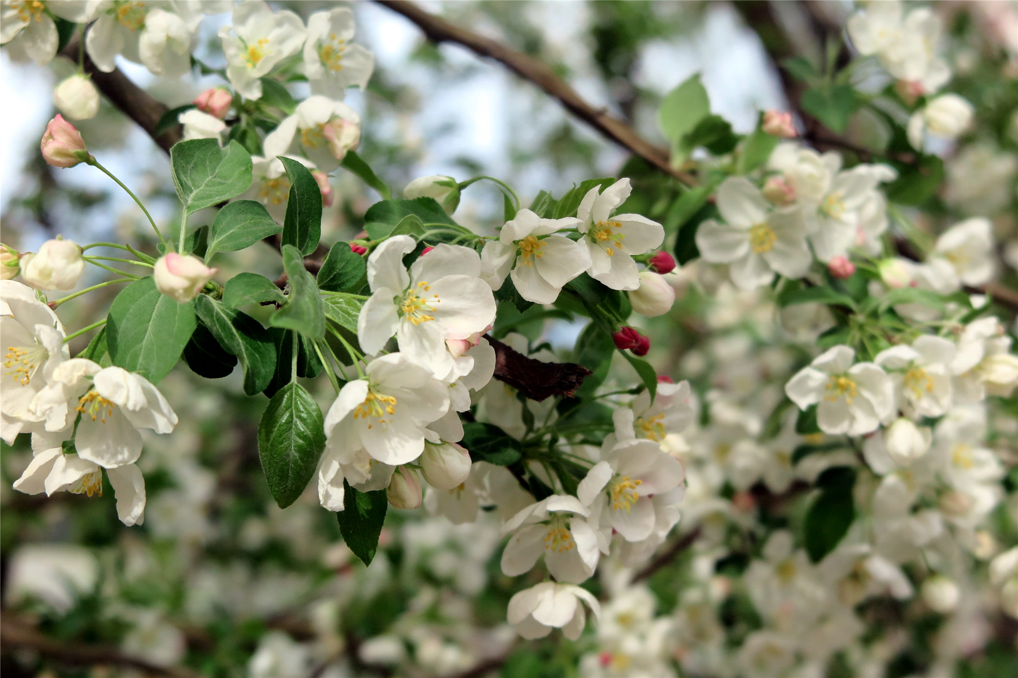 “金星海棠”“贴梗海棠”“钻石海棠”“ 西府海棠”“八棱海棠”“垂丝海棠”,各显秀色,在碧叶陪衬下,分外妖娆娇艳。