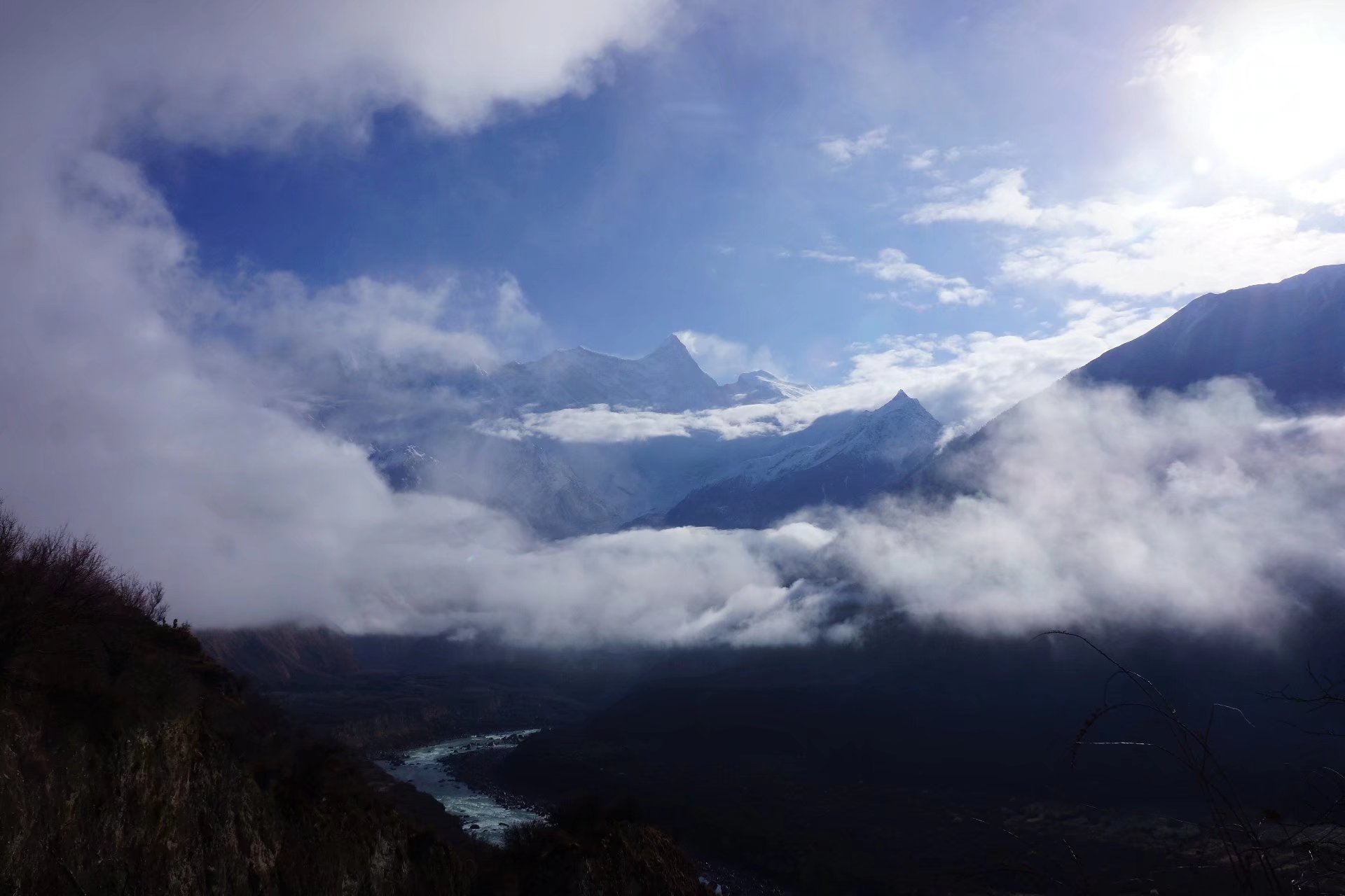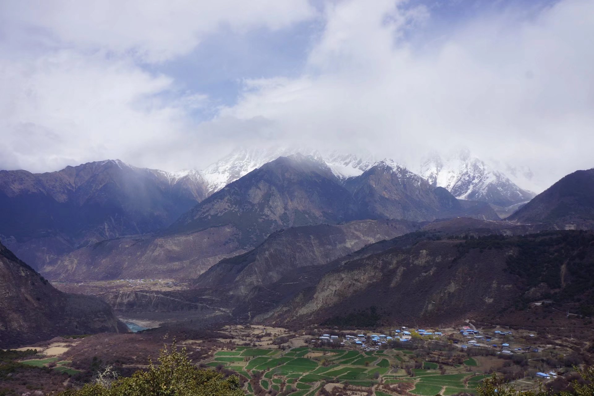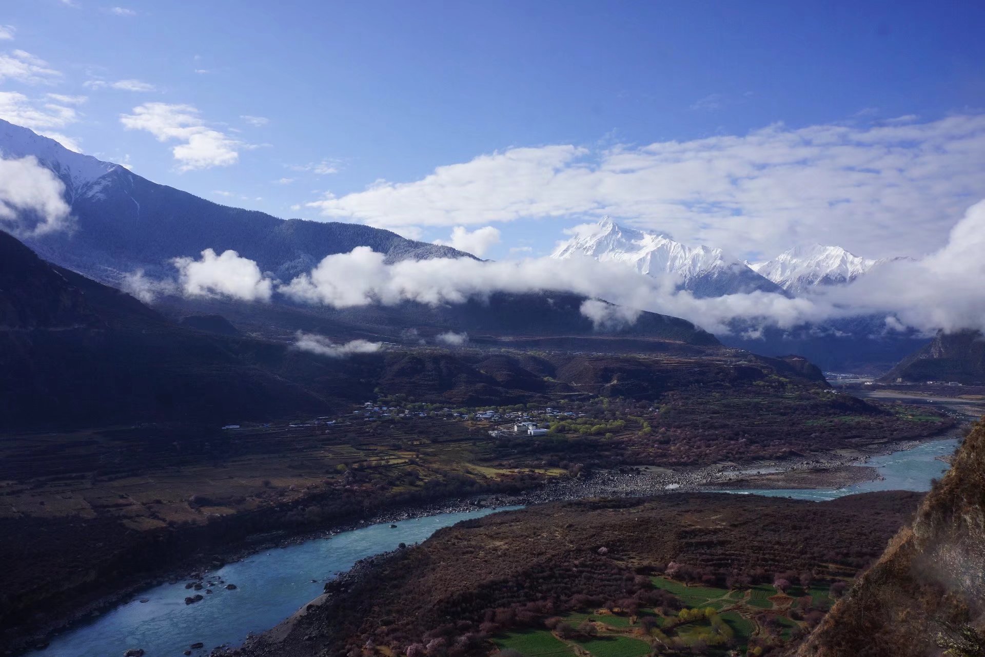 昨夜的雨,是傅在林间的薄粉,今日的云雾,是绕在山间的轻纱,南迦巴瓦峰与多雄拉山就在云里雾间时隐时现,雅鲁藏布江在崖下奔流而过,一切都是那么好那么好。。。。。