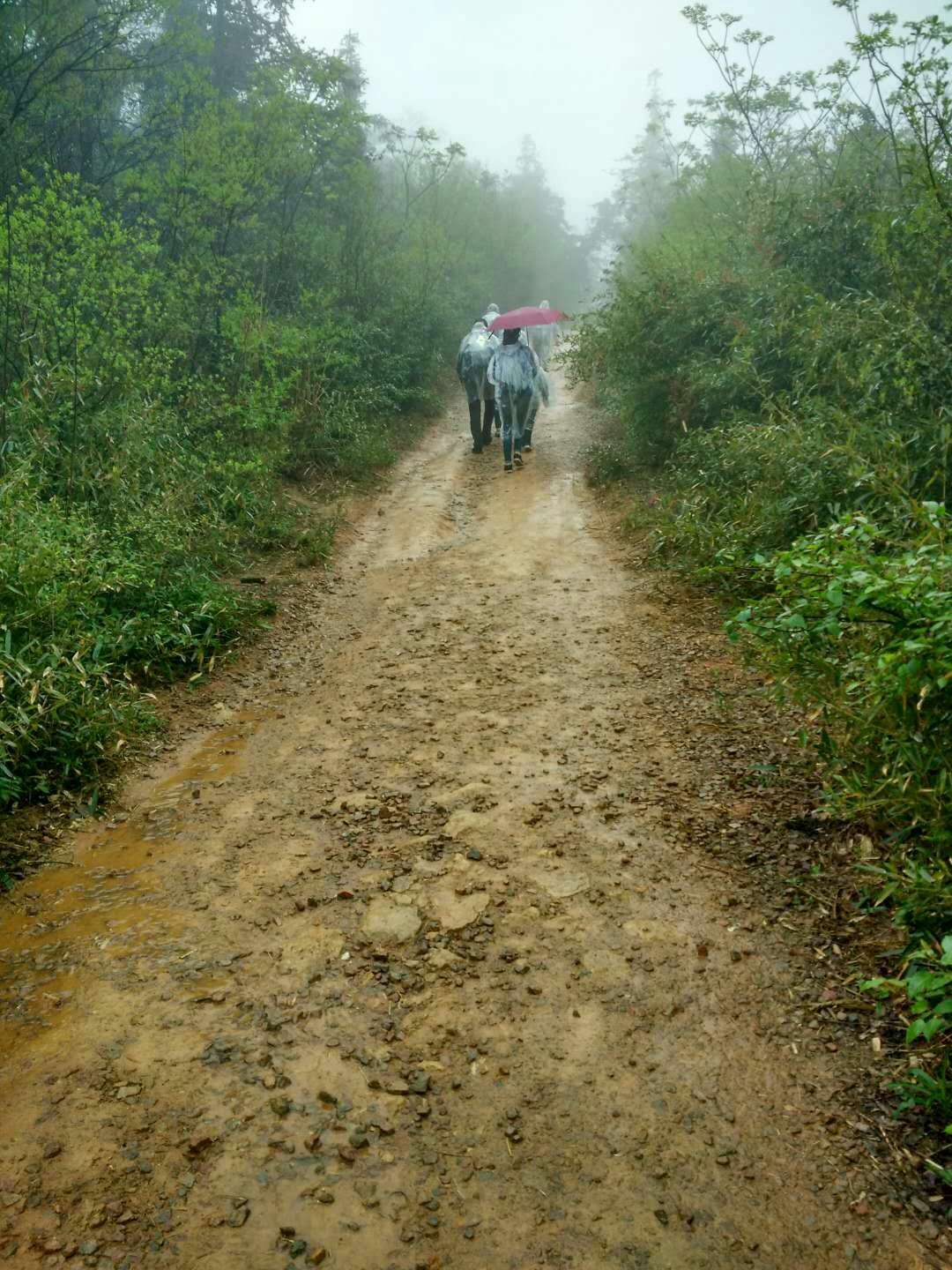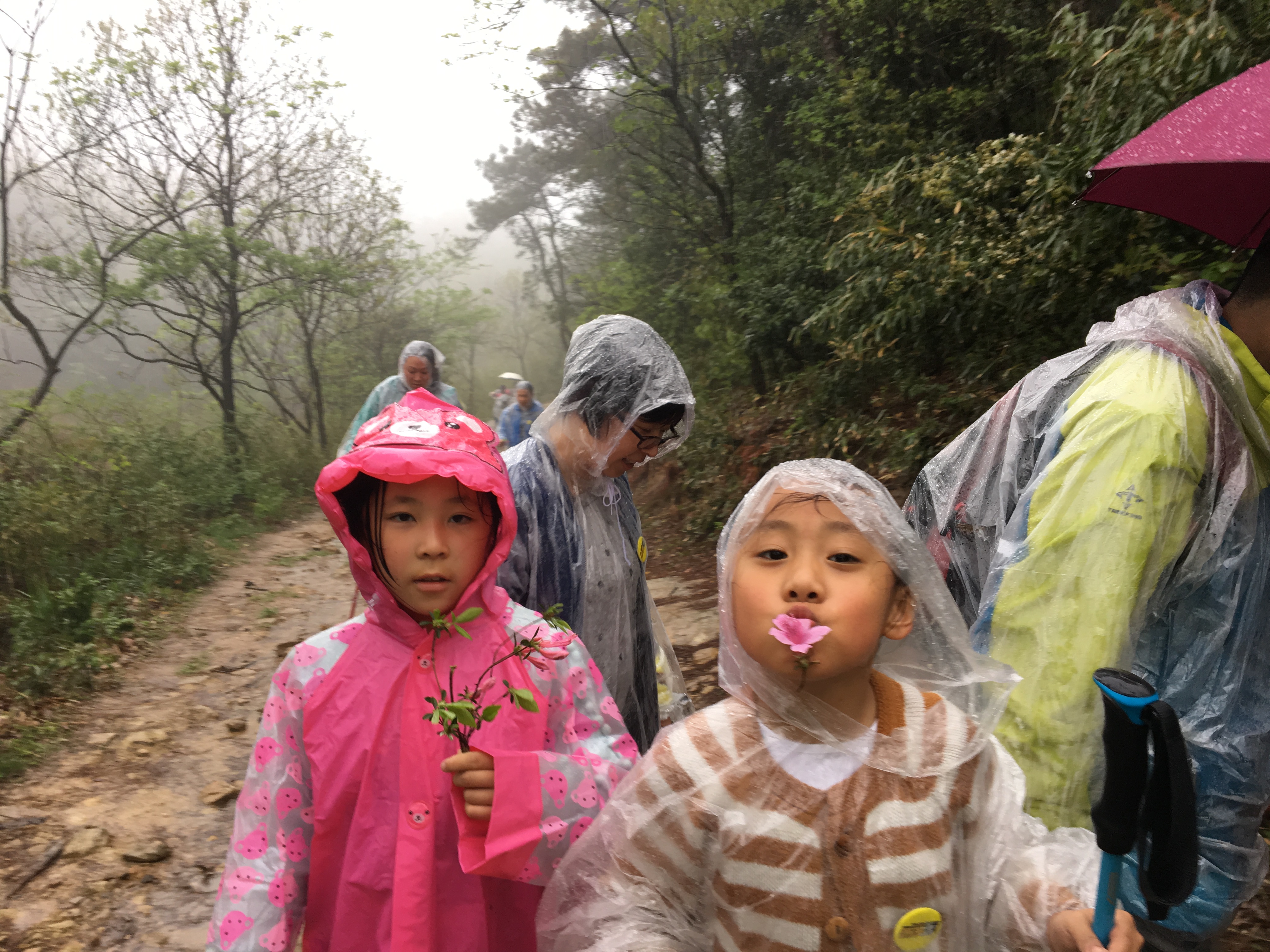 午饭后开始下雨,在车上为大家分发雨衣后,开始下午的徒步行程。