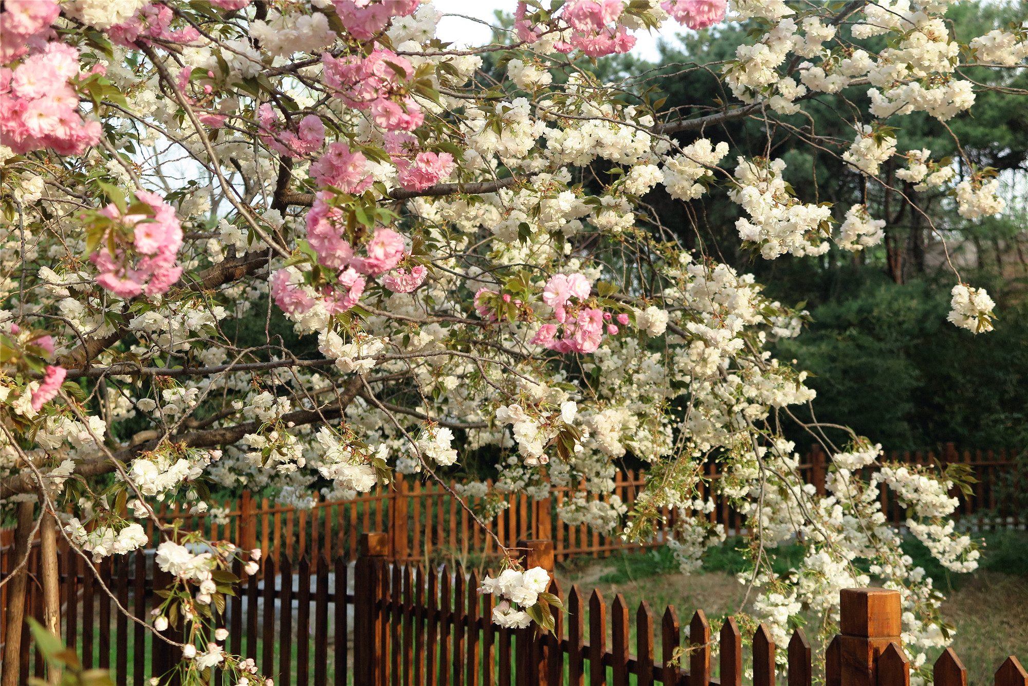 四月中旬以来,郁金、关山、普贤象、一叶等晚樱吐蕊开放,园内近千株晚樱进入最佳观赏期。