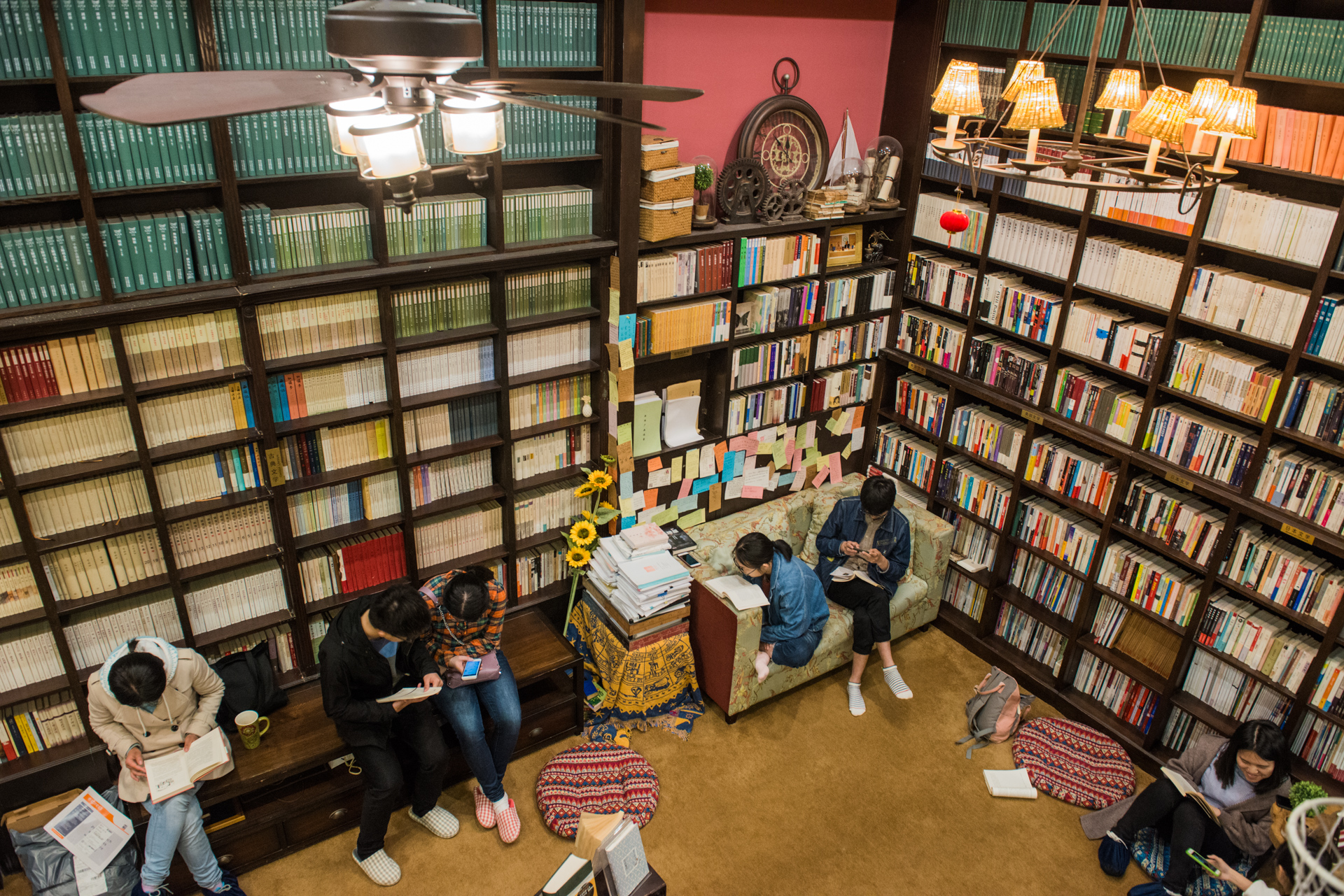 走到理想谷门口,门前的黑板上写着“读书,就是回家”。推门而入,映入眼帘的是满墙高大的书架,上面整齐排列的书本,像是待检阅的士兵。屋内的每一个区域,都坐满了人,沙发、凳子、地上、台阶上,每个人都捧着自己的书。他们每个人,都沉浸在各自的文字世界里,互相陪伴,又互不干扰。你可以从书架上挑一本书,加入到他们中间,享受阅读的美好和片刻的宁静。
