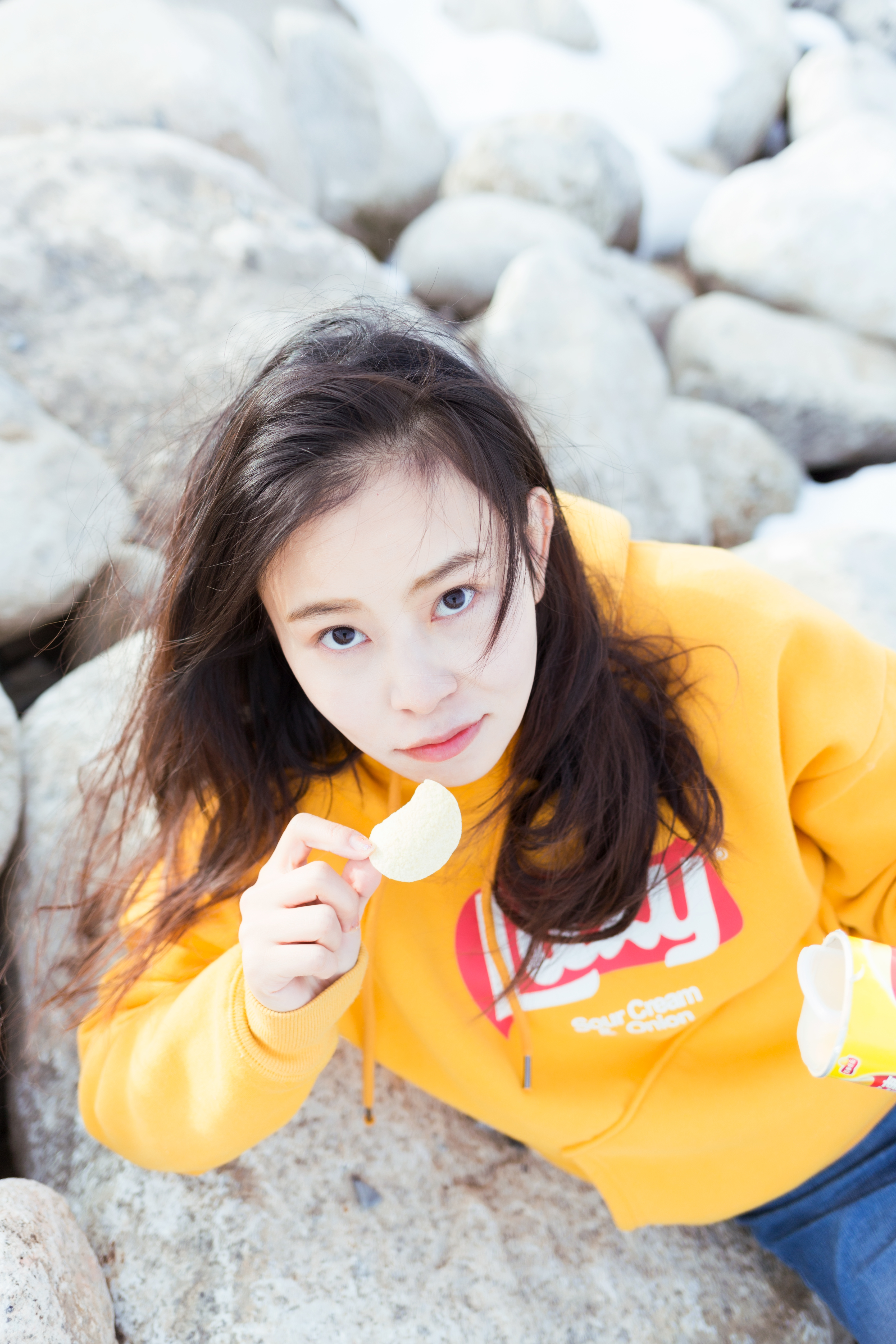 拍的主题是“乐事”,因为橙子的卫衣和手里的乐事薯片是一家
