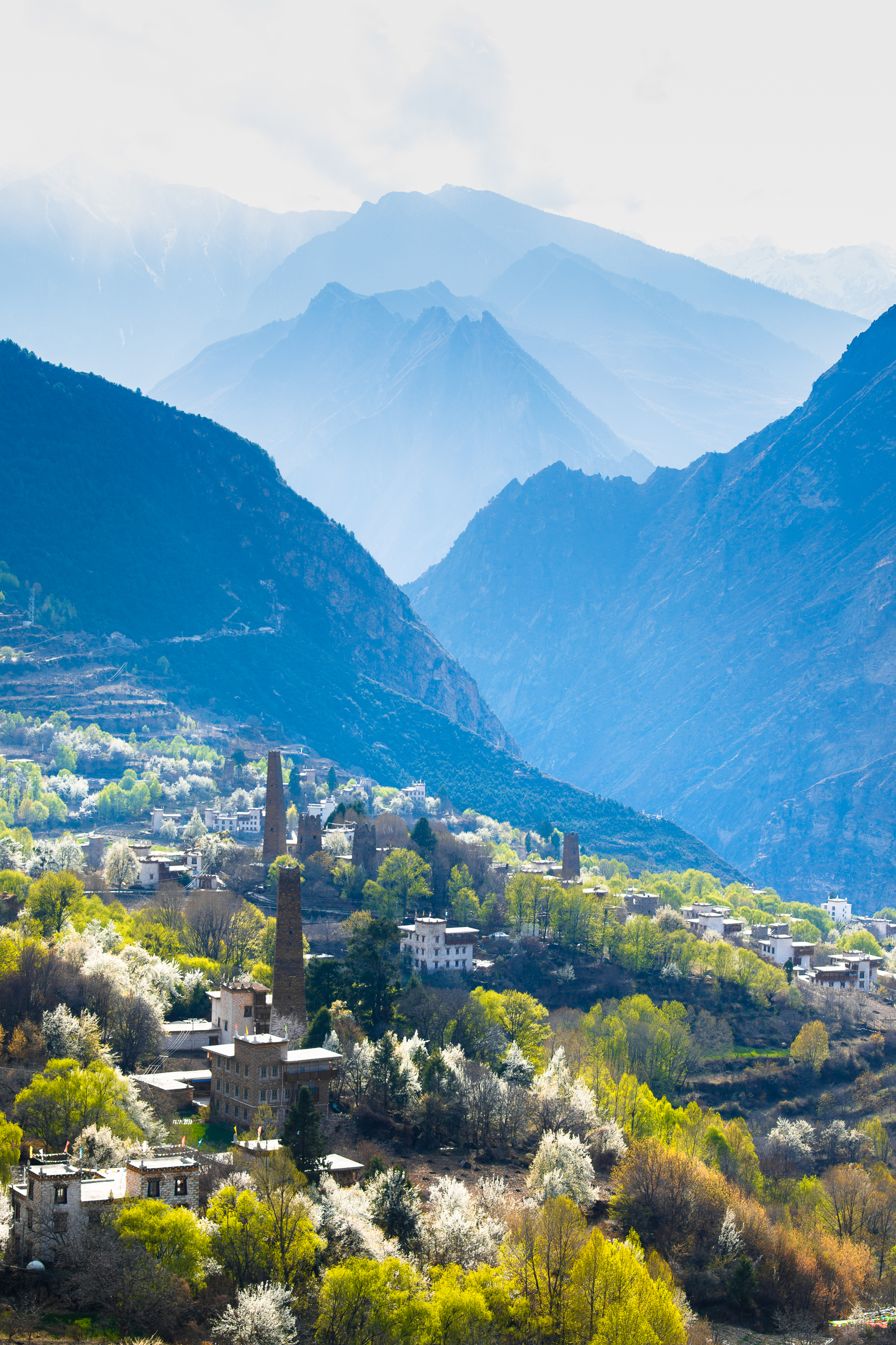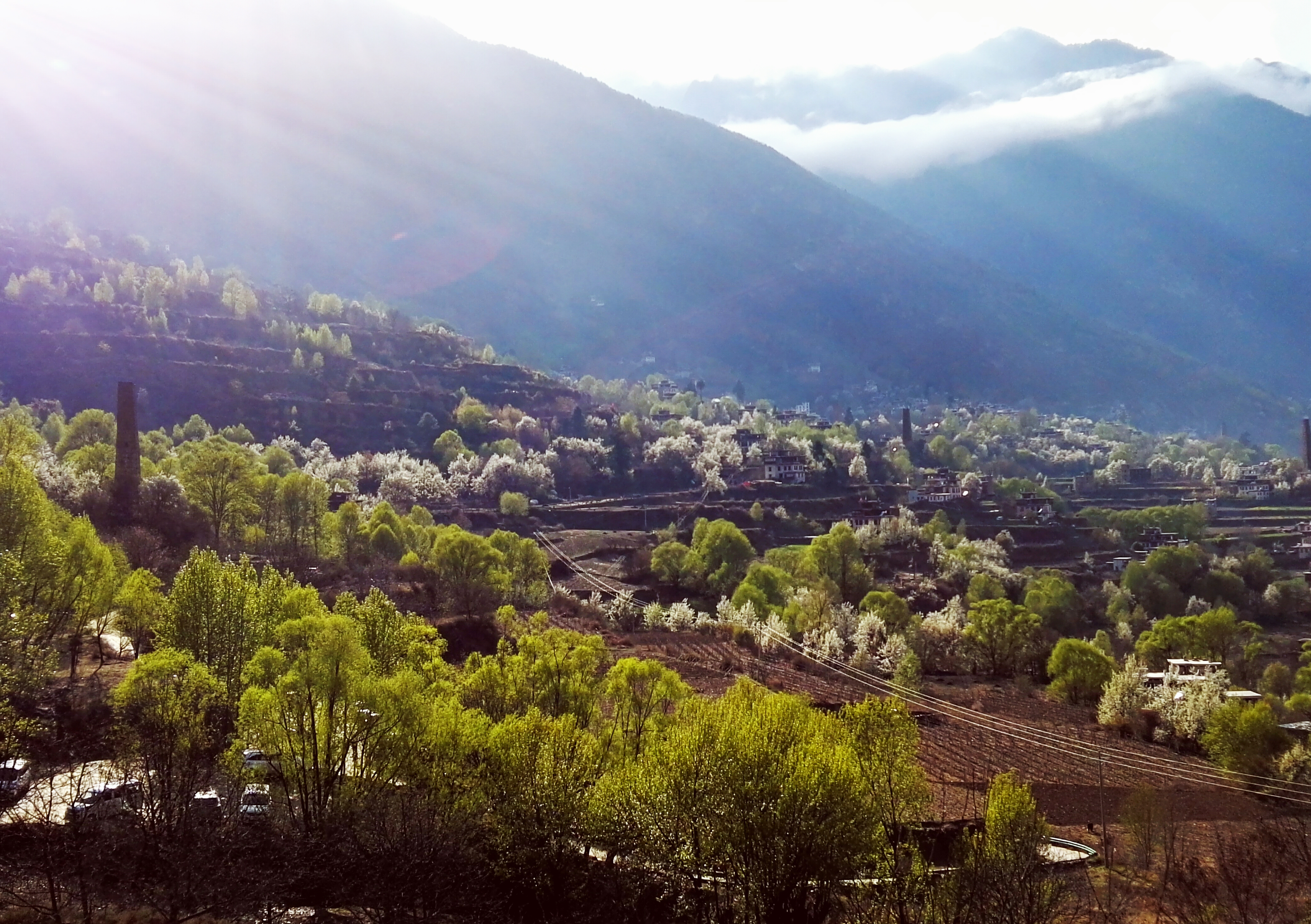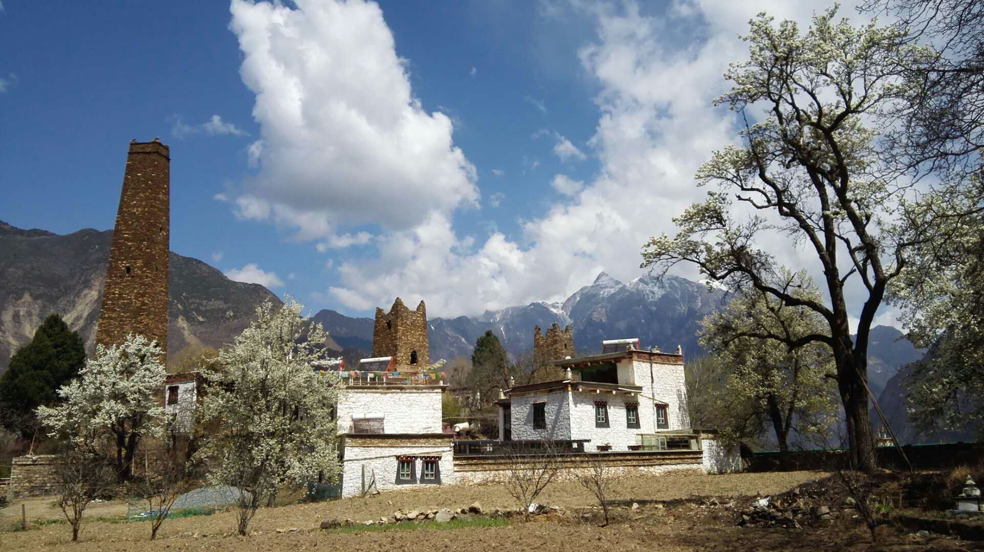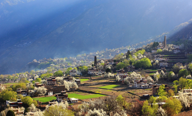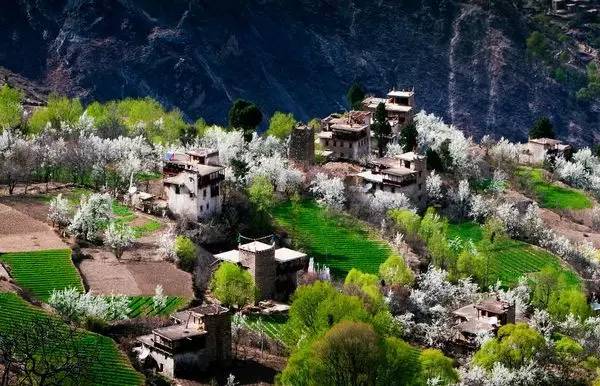 行至半山腰,我们立刻就被这里的如诗如画风景惊住了,在墨尔多神山下,梨花、桃花、苹果花竞相绽放 ,田野里麦苗青青,翡翠般的绿树之中,嘉绒藏族的民居——黄、黑、白相间的碉楼寨房隐隐约约分布其间,在阳光照射下,春意盎然,人在其中飘飘然如踏入仙境一般。