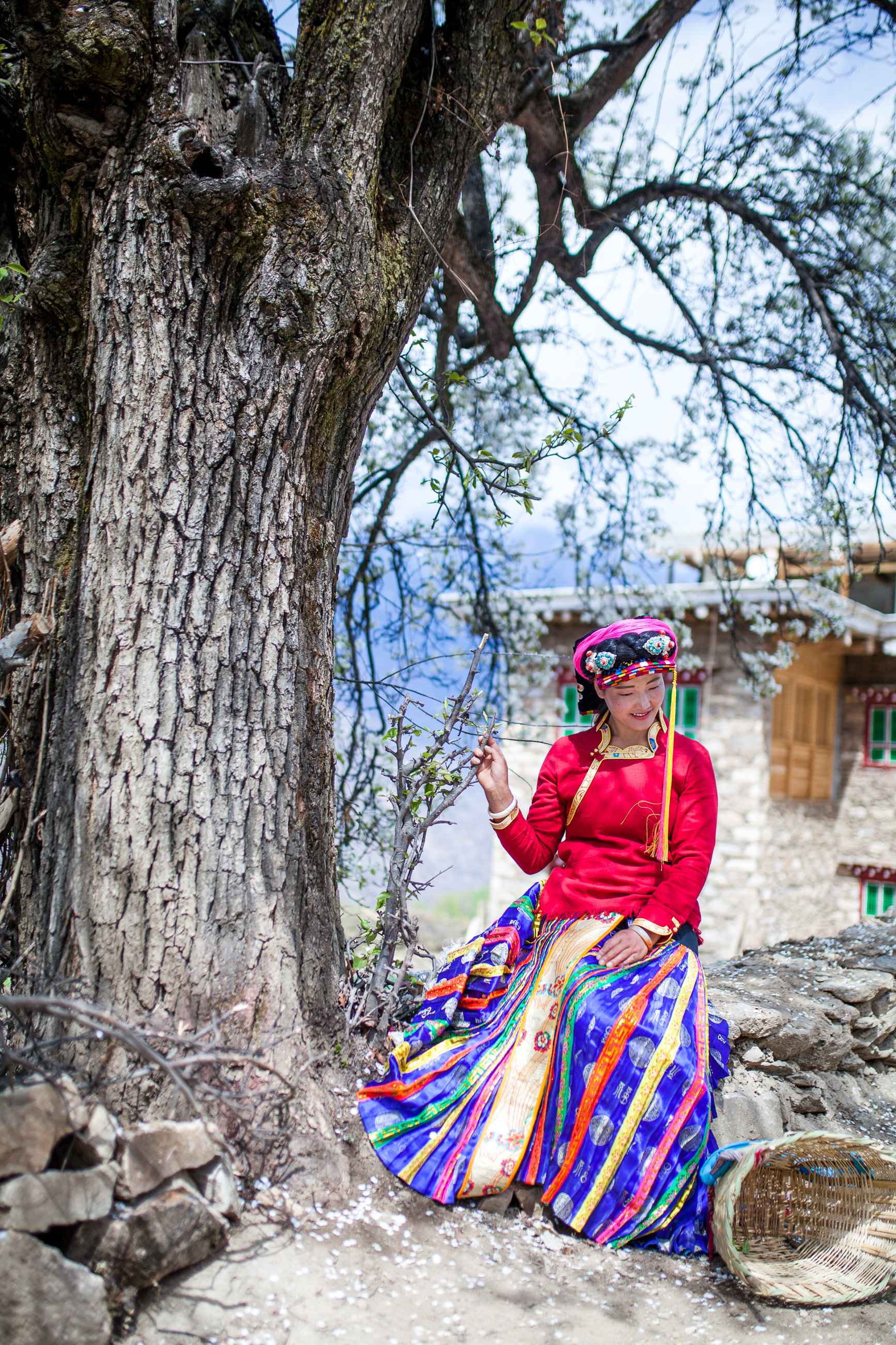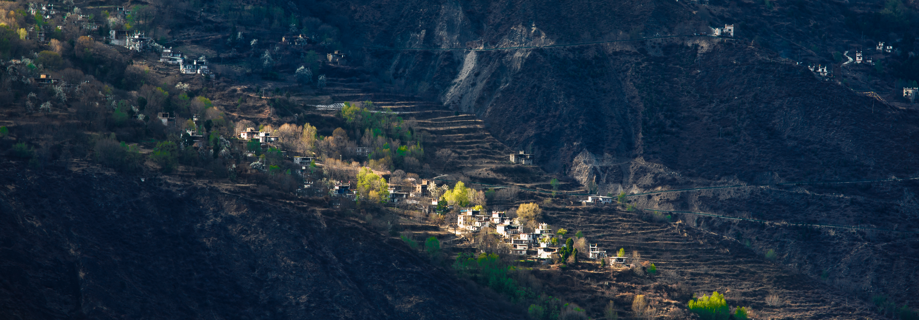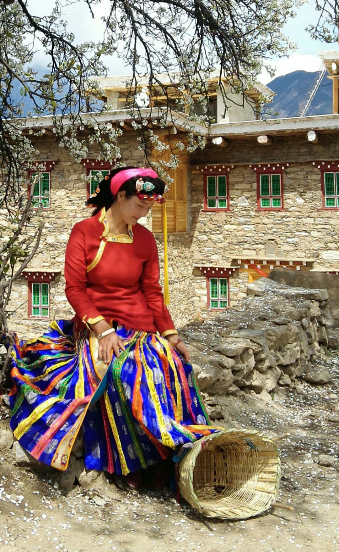 行至半山腰,我们立刻就被这里的如诗如画风景惊住了,在墨尔多神山下,梨花、桃花、苹果花竞相绽放 ,田野里麦苗青青,翡翠般的绿树之中,嘉绒藏族的民居——黄、黑、白相间的碉楼寨房隐隐约约分布其间,在阳光照射下,春意盎然,人在其中飘飘然如踏入仙境一般。