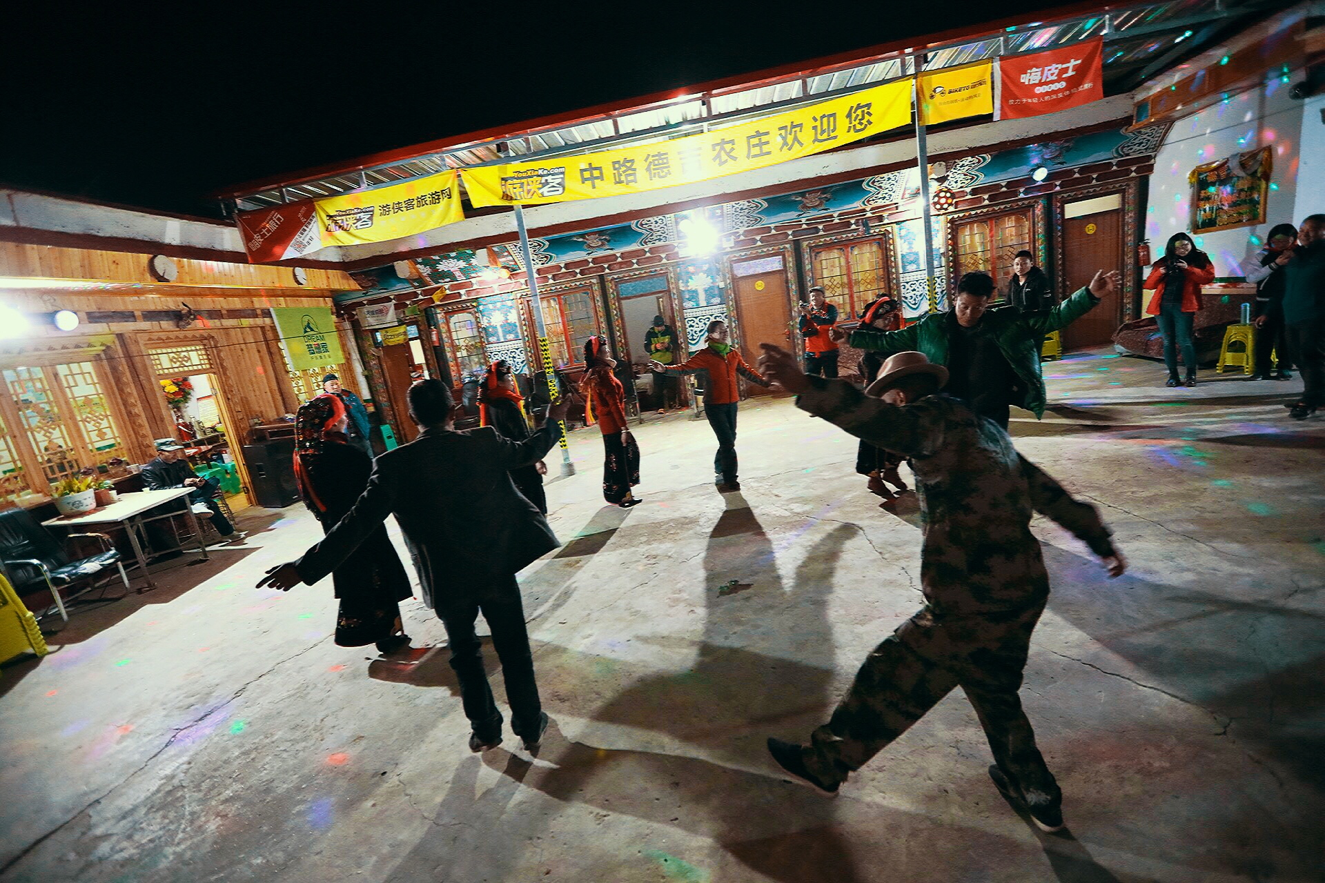 每天晚上,贡布大叔都会带着他的家人在和美丽的藏族姑娘在农庄里开晚会,带大家跳传统的锅庄舞,唱着心中的歌给远方的来客。那飘在蓝天下动人的歌声, 让你热血沸腾 , 大家情不自禁随着歌声和欢快的节奏舞动着歌唱着,乐在其中 。